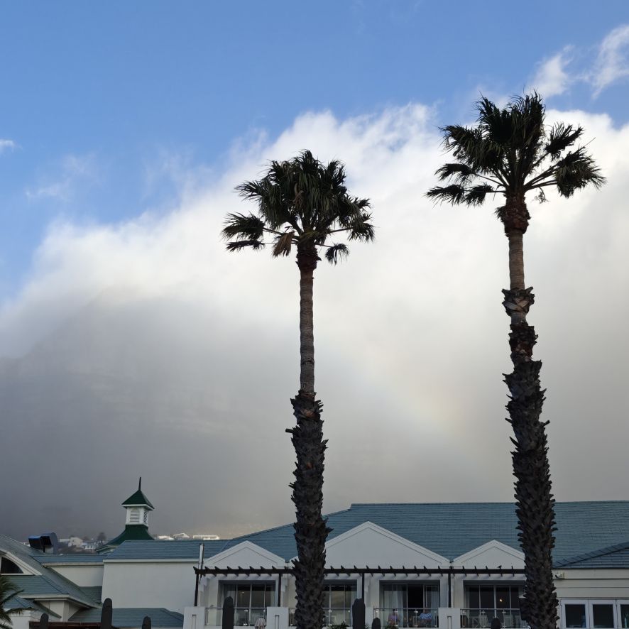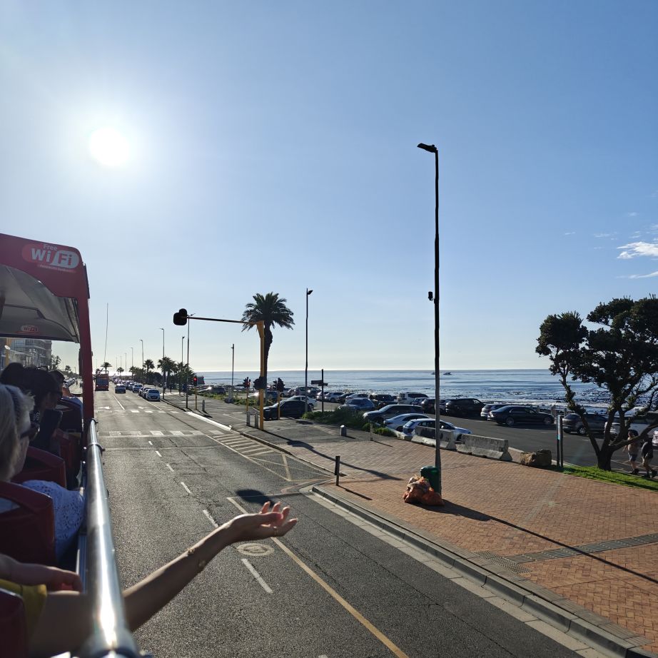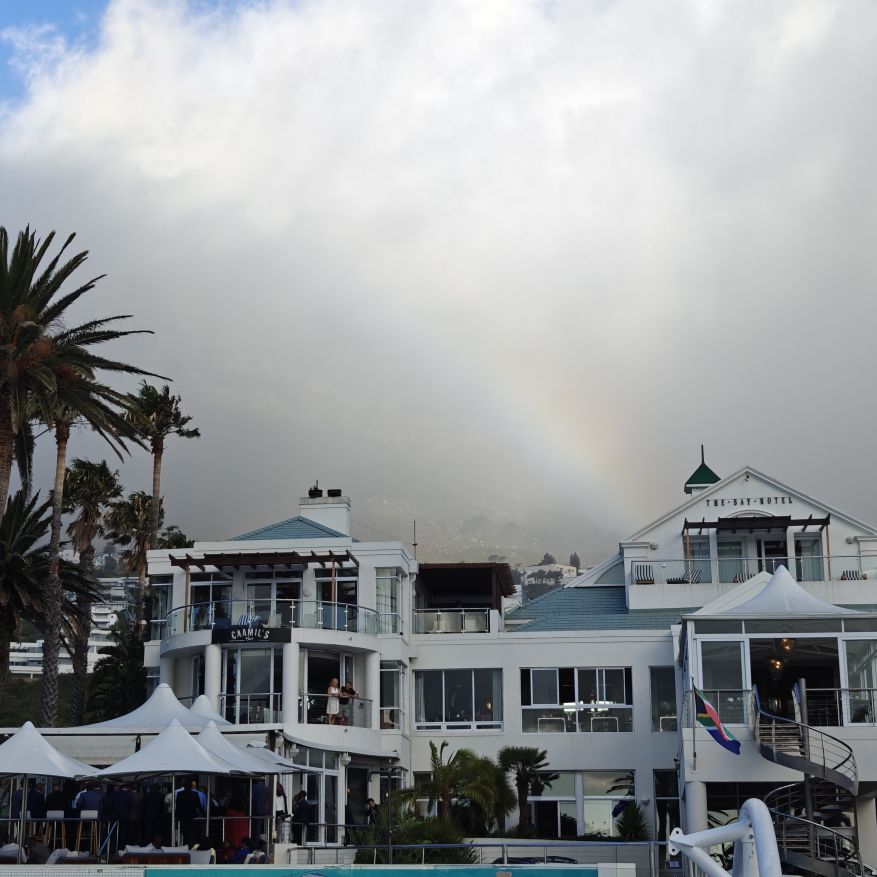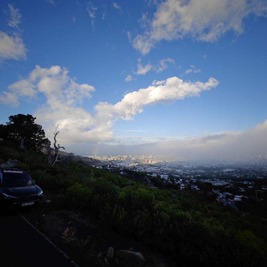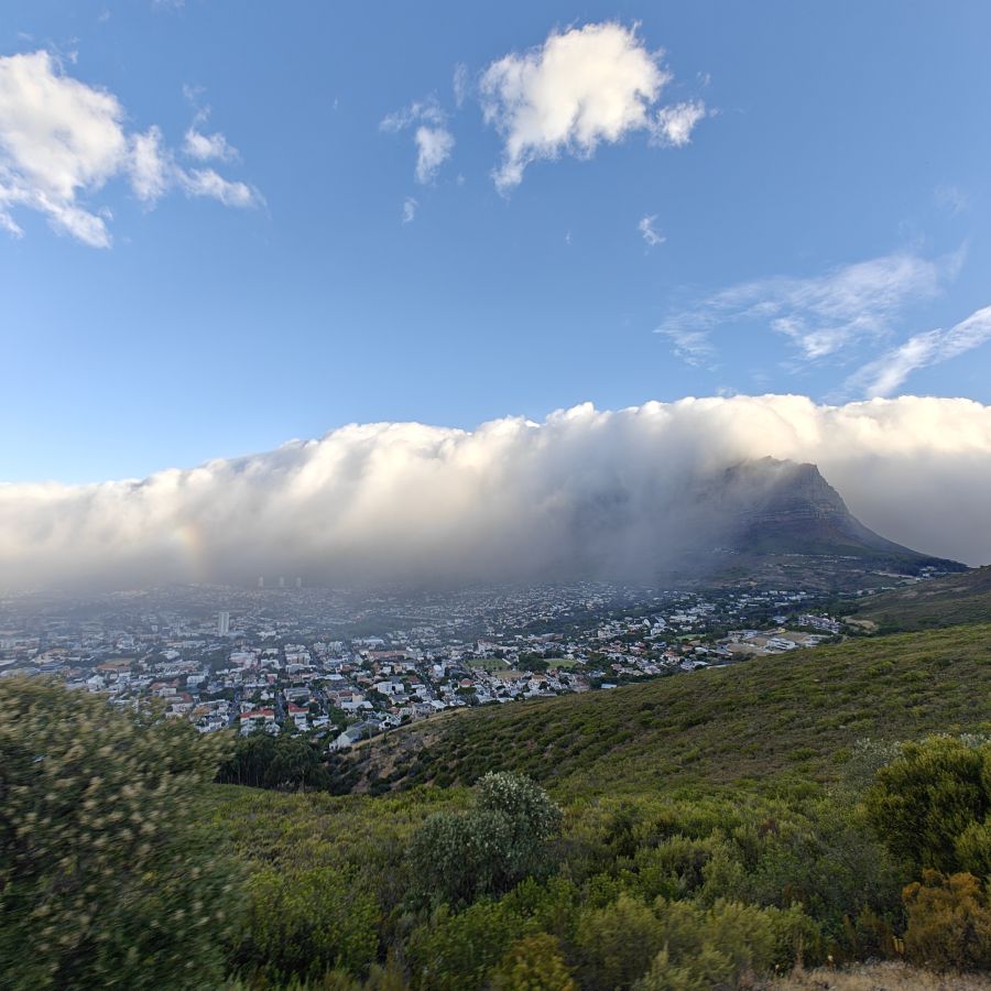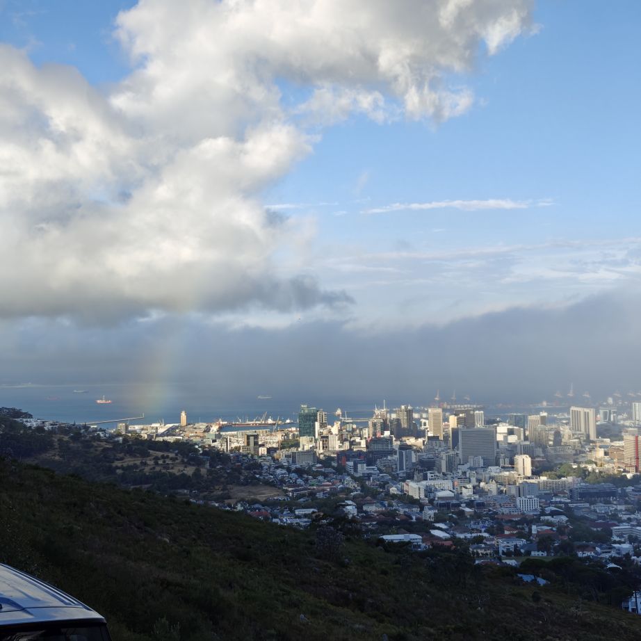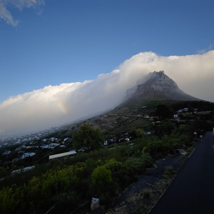 Noch einmal lassen wir uns von einem Uber zur V&A Waterfront bringen. Dort startet die Sonnenuntergangtour mit dem Doppeldeckerbus. Wir fahren in der Abendstimmung über Sea Point und Camps Bay auf den Signal Hill. Dort sind Kapstadts Sonnenuntergänge am schönsten. In Camps Bay angekommen, verdunkelt sich der Himmel und es nieselt – wir bleiben wacker am offenen Oberdeck sitzen, als wir uns dem Signal Hill nähern, hört es wieder auf. Der Bus lässt uns eine Stunde vor Sonnenuntergang aussteigen – es ist eine dramatische Wolkenstimmung, über dem Stadion gibt es einen Regenbogen, über den Tafelbergt ziehen die Wolken wie ein Wasserfall. Die Sonne ist von Wolken verdeckt. Dennoch warten wir gemeinsam mit hunderten anderen, wie sich die Wolken verfärben. Kurz bevor er untergeht, sehen wir den Feuerball im Meer versinken. Dann fahren wir wieder zurück.