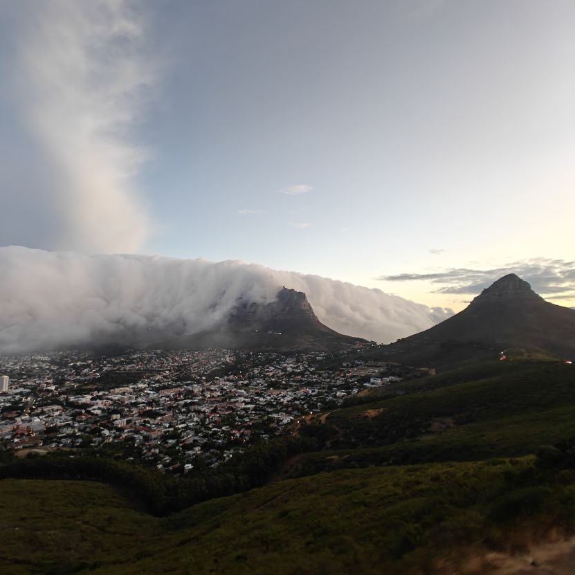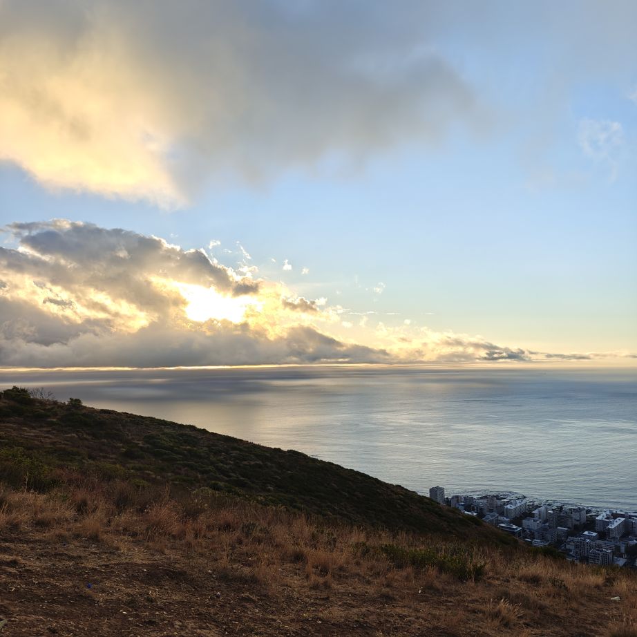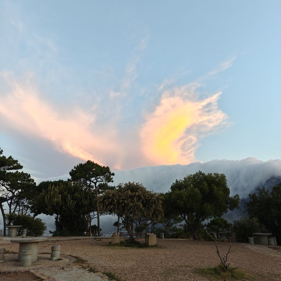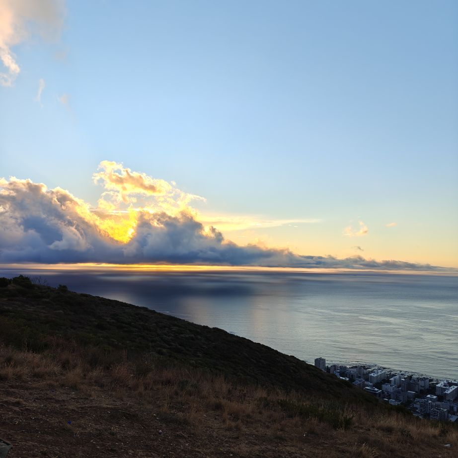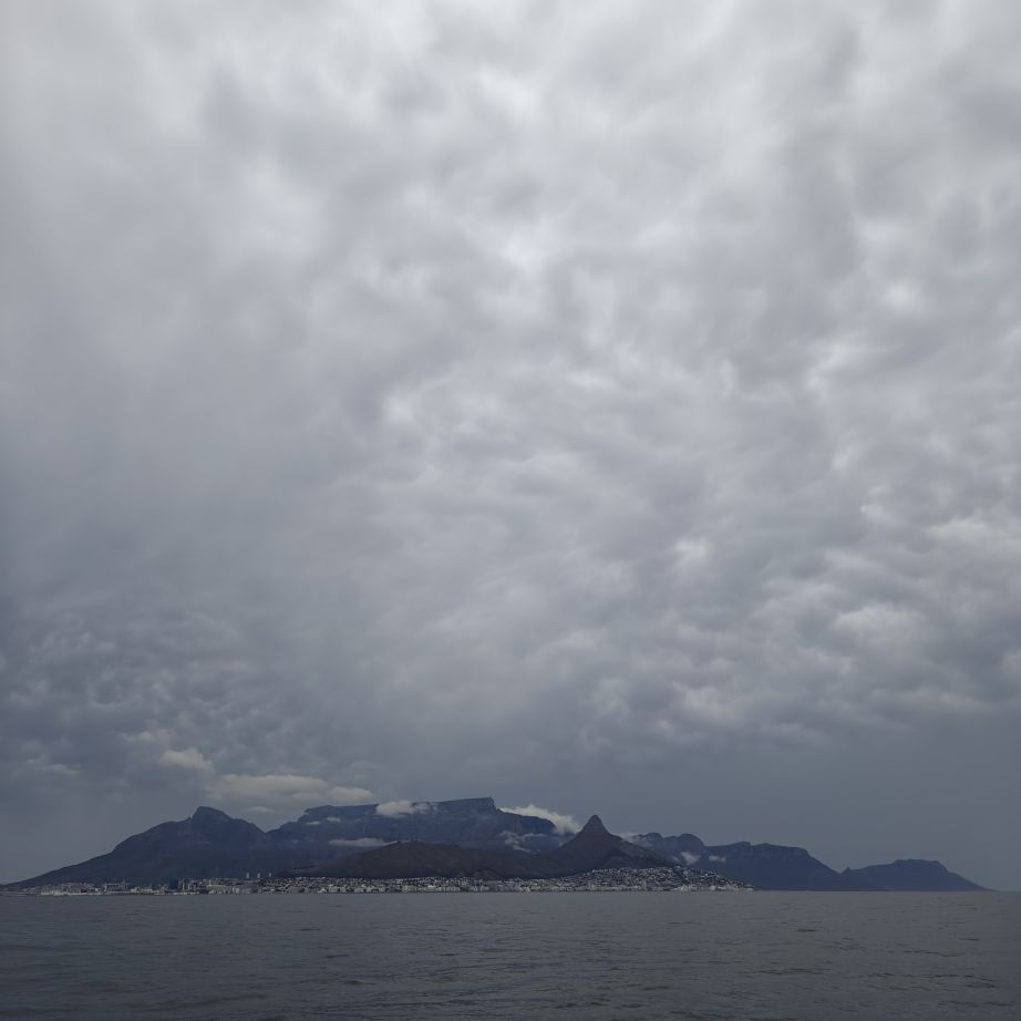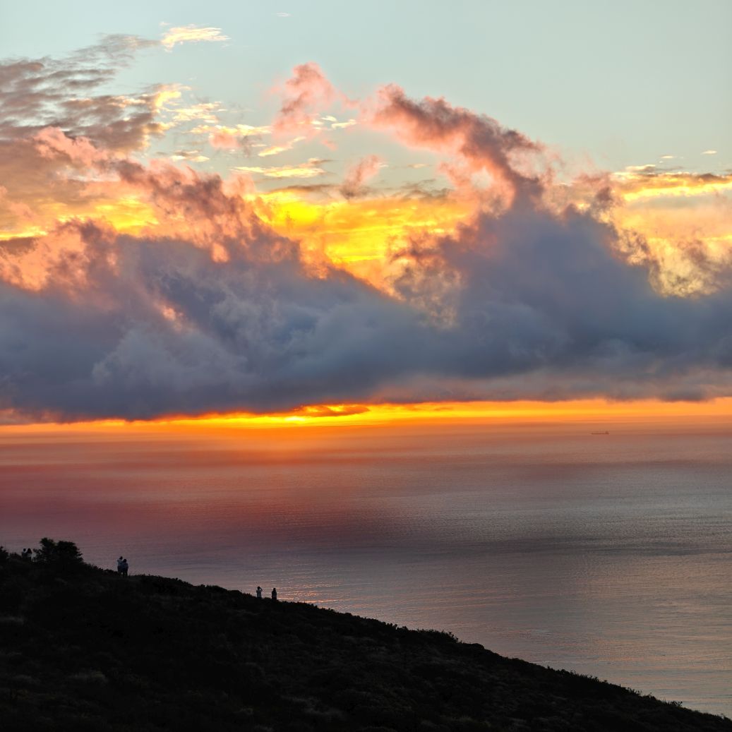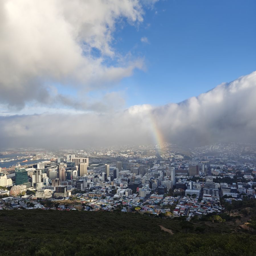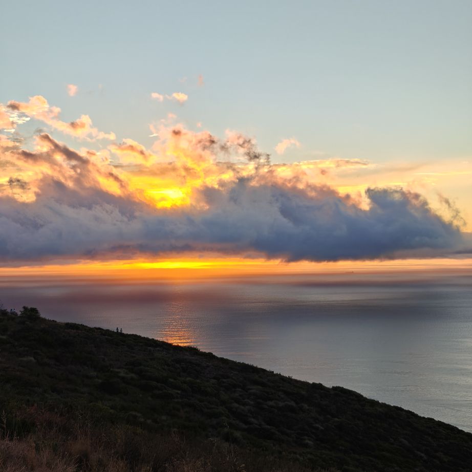 Noch einmal lassen wir uns von einem Uber zur V&A Waterfront bringen. Dort startet die Sonnenuntergangtour mit dem Doppeldeckerbus. Wir fahren in der Abendstimmung über Sea Point und Camps Bay auf den Signal Hill. Dort sind Kapstadts Sonnenuntergänge am schönsten. In Camps Bay angekommen, verdunkelt sich der Himmel und es nieselt – wir bleiben wacker am offenen Oberdeck sitzen, als wir uns dem Signal Hill nähern, hört es wieder auf. Der Bus lässt uns eine Stunde vor Sonnenuntergang aussteigen – es ist eine dramatische Wolkenstimmung, über dem Stadion gibt es einen Regenbogen, über den Tafelbergt ziehen die Wolken wie ein Wasserfall. Die Sonne ist von Wolken verdeckt. Dennoch warten wir gemeinsam mit hunderten anderen, wie sich die Wolken verfärben. Kurz bevor er untergeht, sehen wir den Feuerball im Meer versinken. Dann fahren wir wieder zurück.