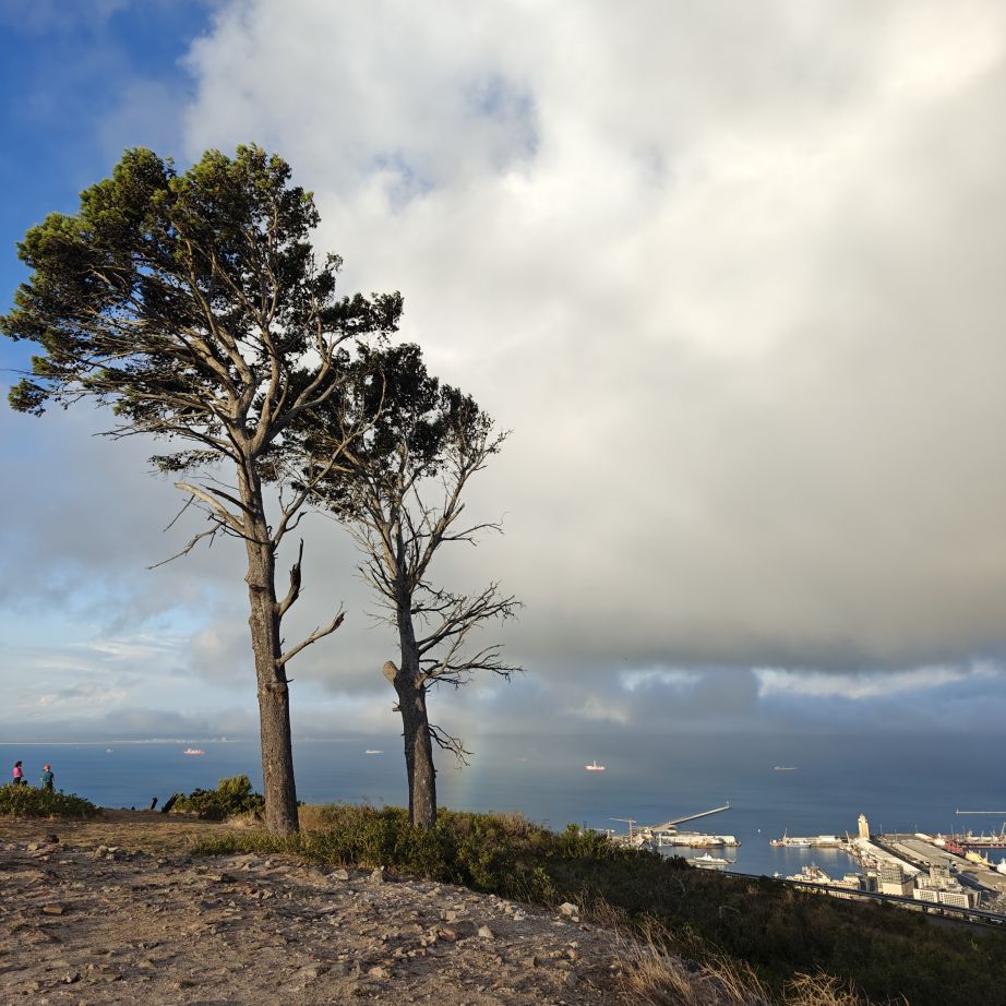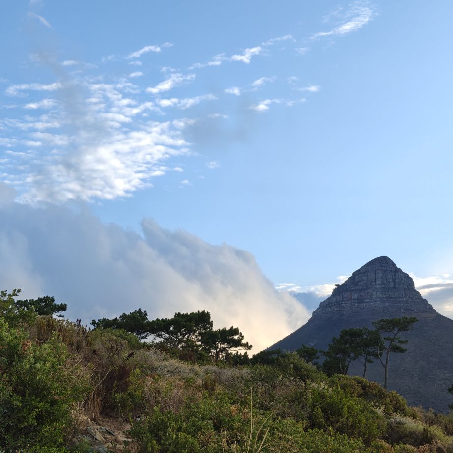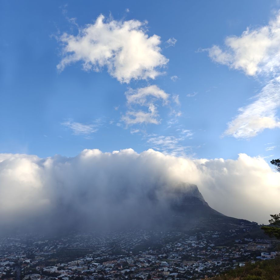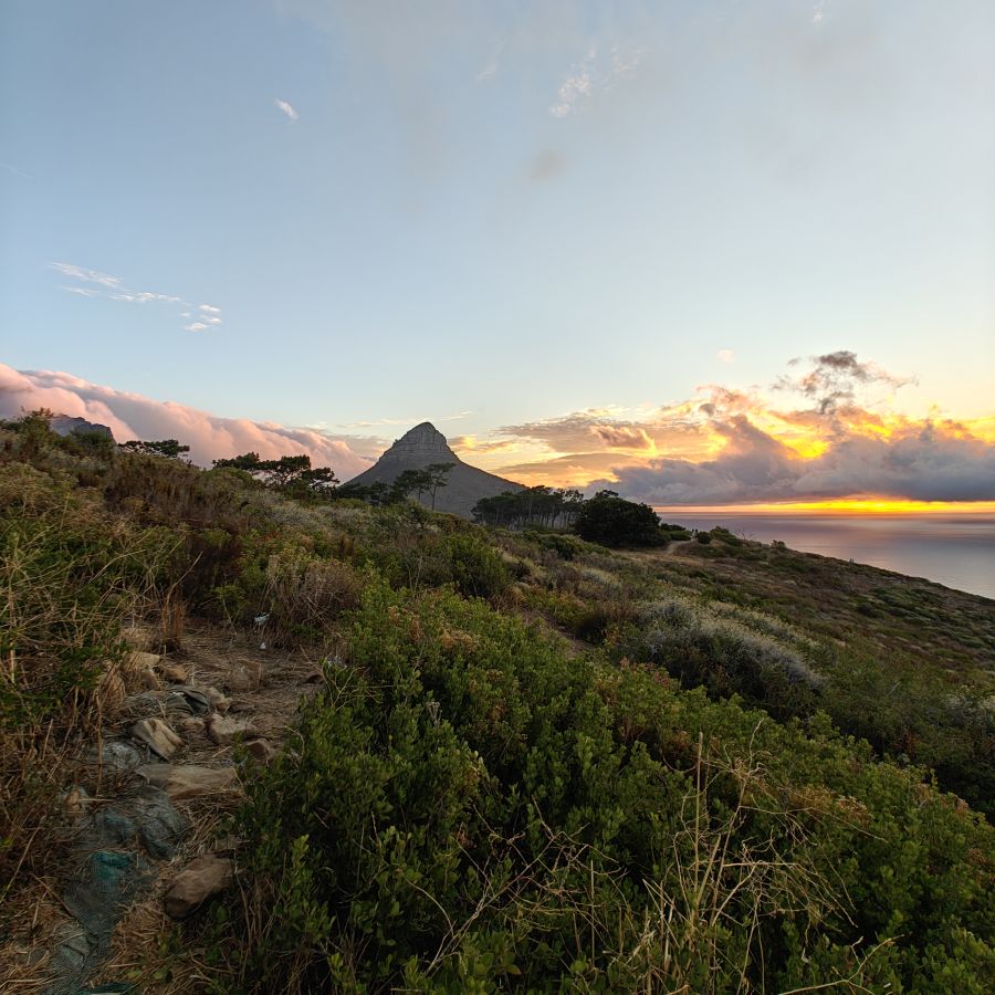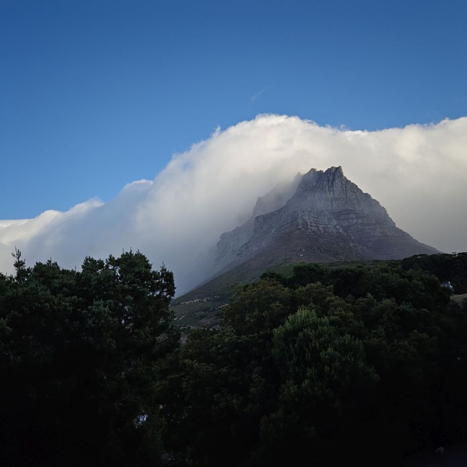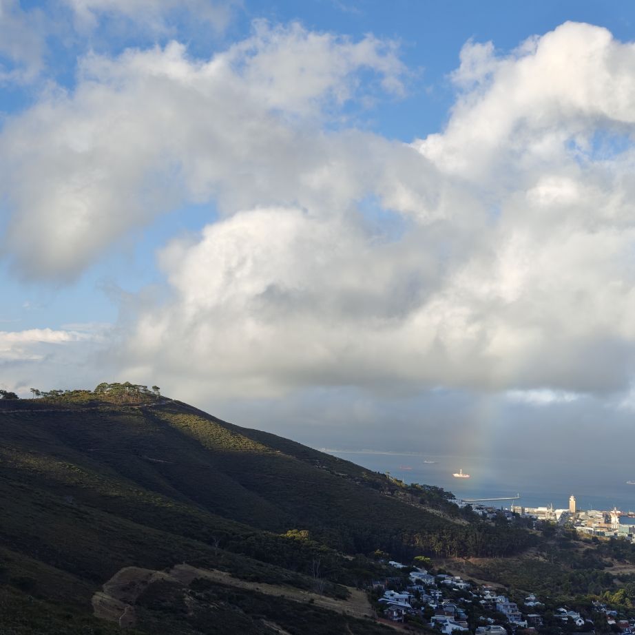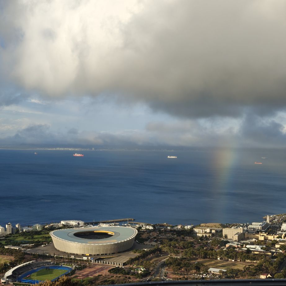 Noch einmal lassen wir uns von einem Uber zur V&A Waterfront bringen. Dort startet die Sonnenuntergangtour mit dem Doppeldeckerbus. Wir fahren in der Abendstimmung über Sea Point und Camps Bay auf den Signal Hill. Dort sind Kapstadts Sonnenuntergänge am schönsten. In Camps Bay angekommen, verdunkelt sich der Himmel und es nieselt – wir bleiben wacker am offenen Oberdeck sitzen, als wir uns dem Signal Hill nähern, hört es wieder auf. Der Bus lässt uns eine Stunde vor Sonnenuntergang aussteigen – es ist eine dramatische Wolkenstimmung, über dem Stadion gibt es einen Regenbogen, über den Tafelbergt ziehen die Wolken wie ein Wasserfall. Die Sonne ist von Wolken verdeckt. Dennoch warten wir gemeinsam mit hunderten anderen, wie sich die Wolken verfärben. Kurz bevor er untergeht, sehen wir den Feuerball im Meer versinken. Dann fahren wir wieder zurück.