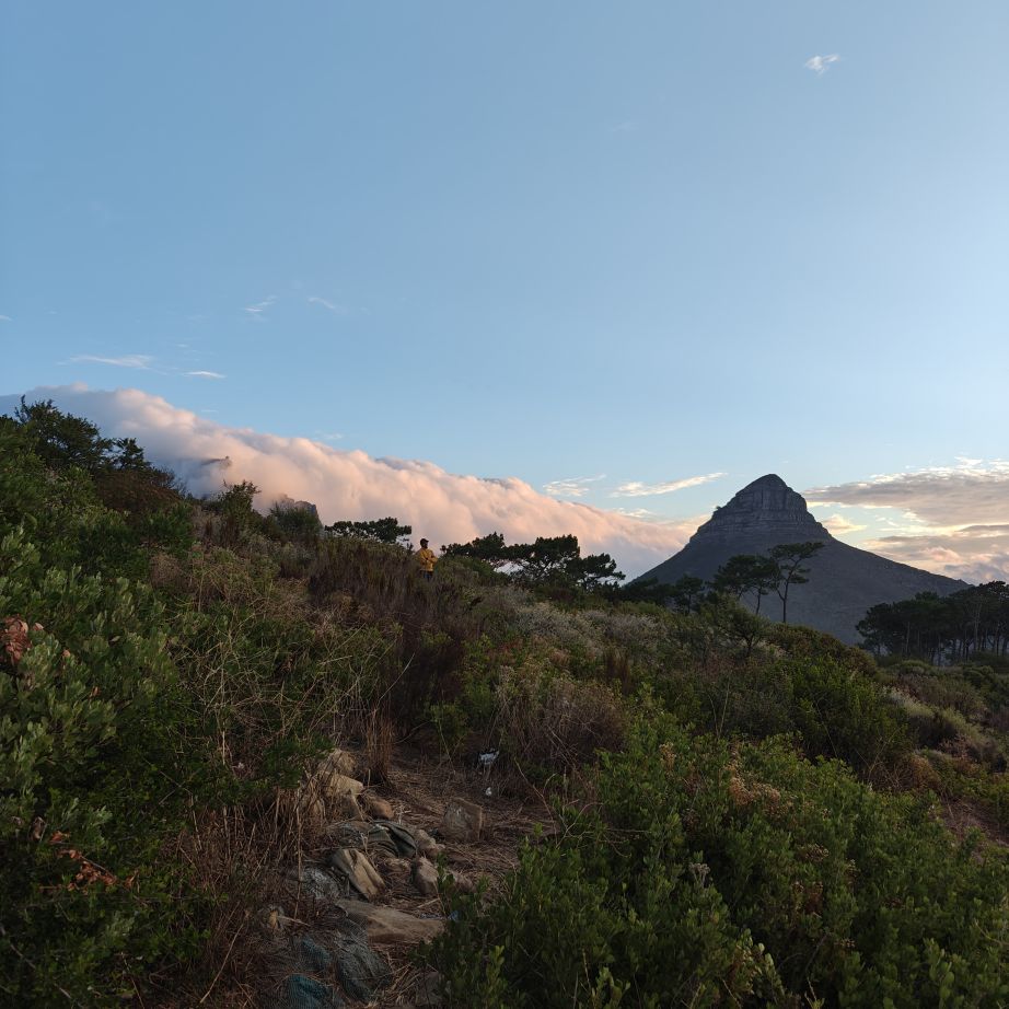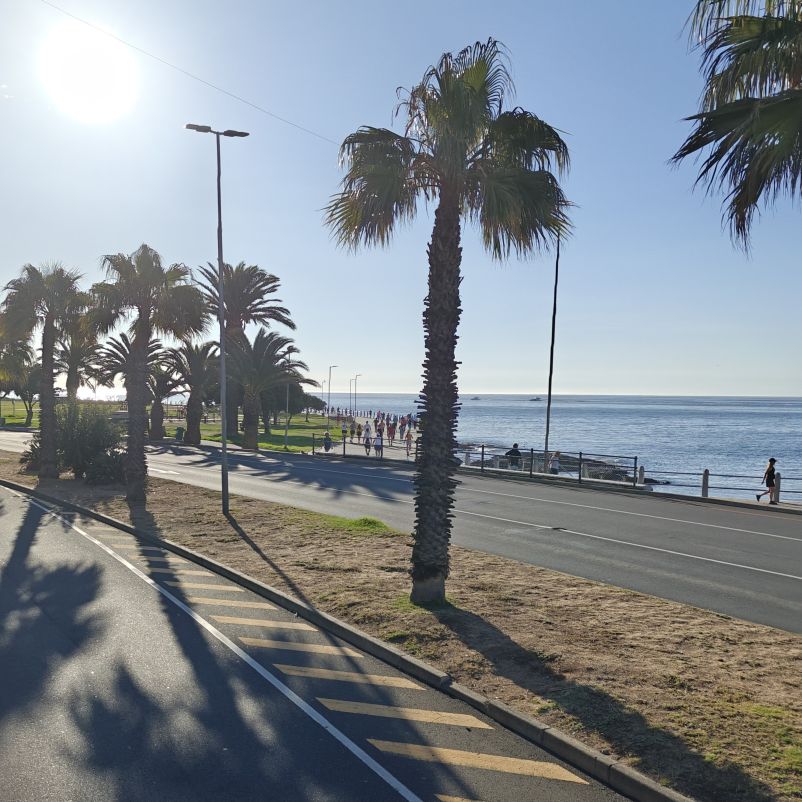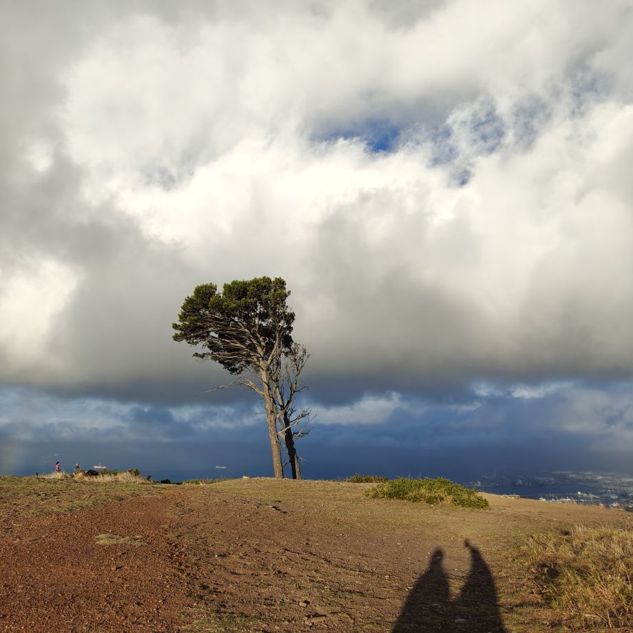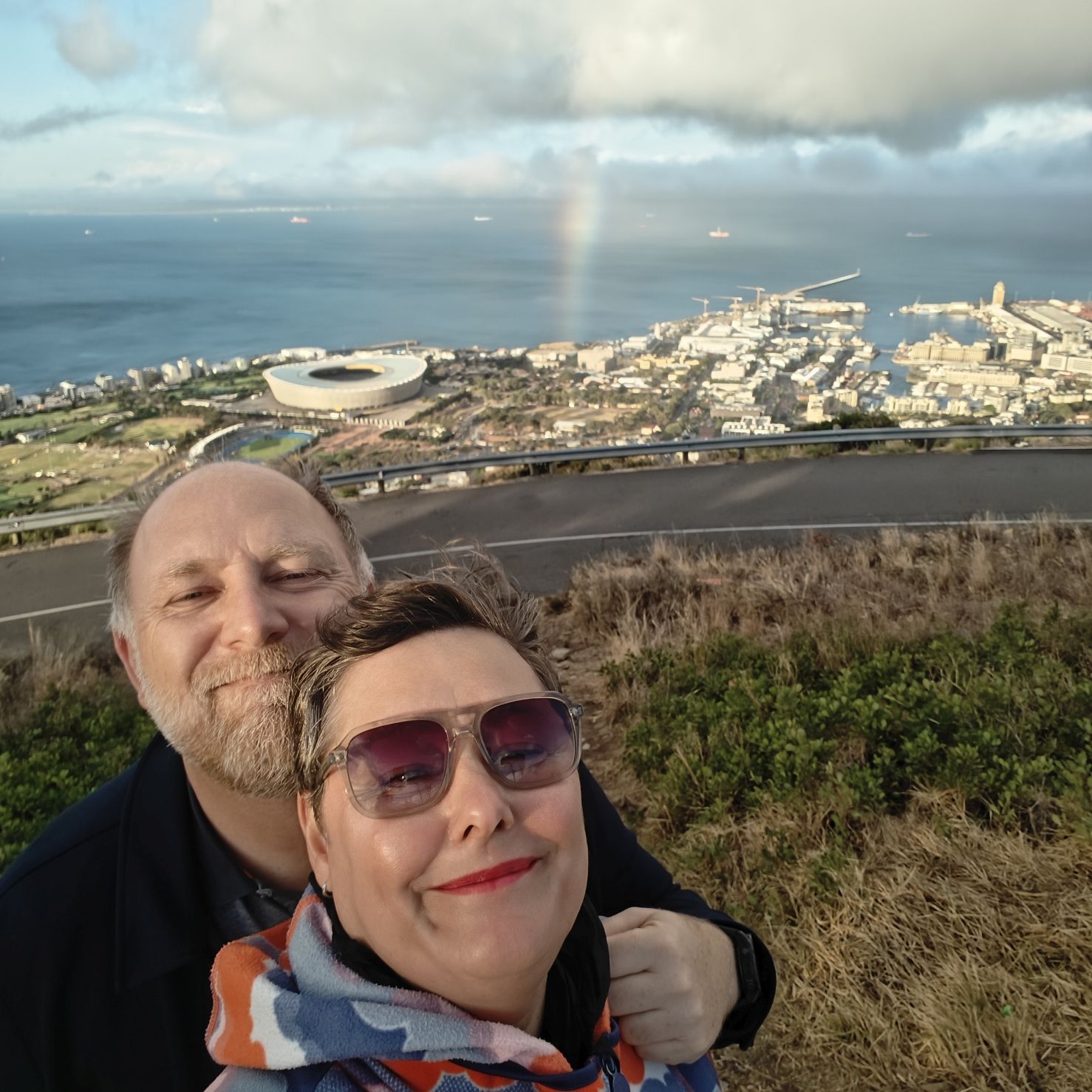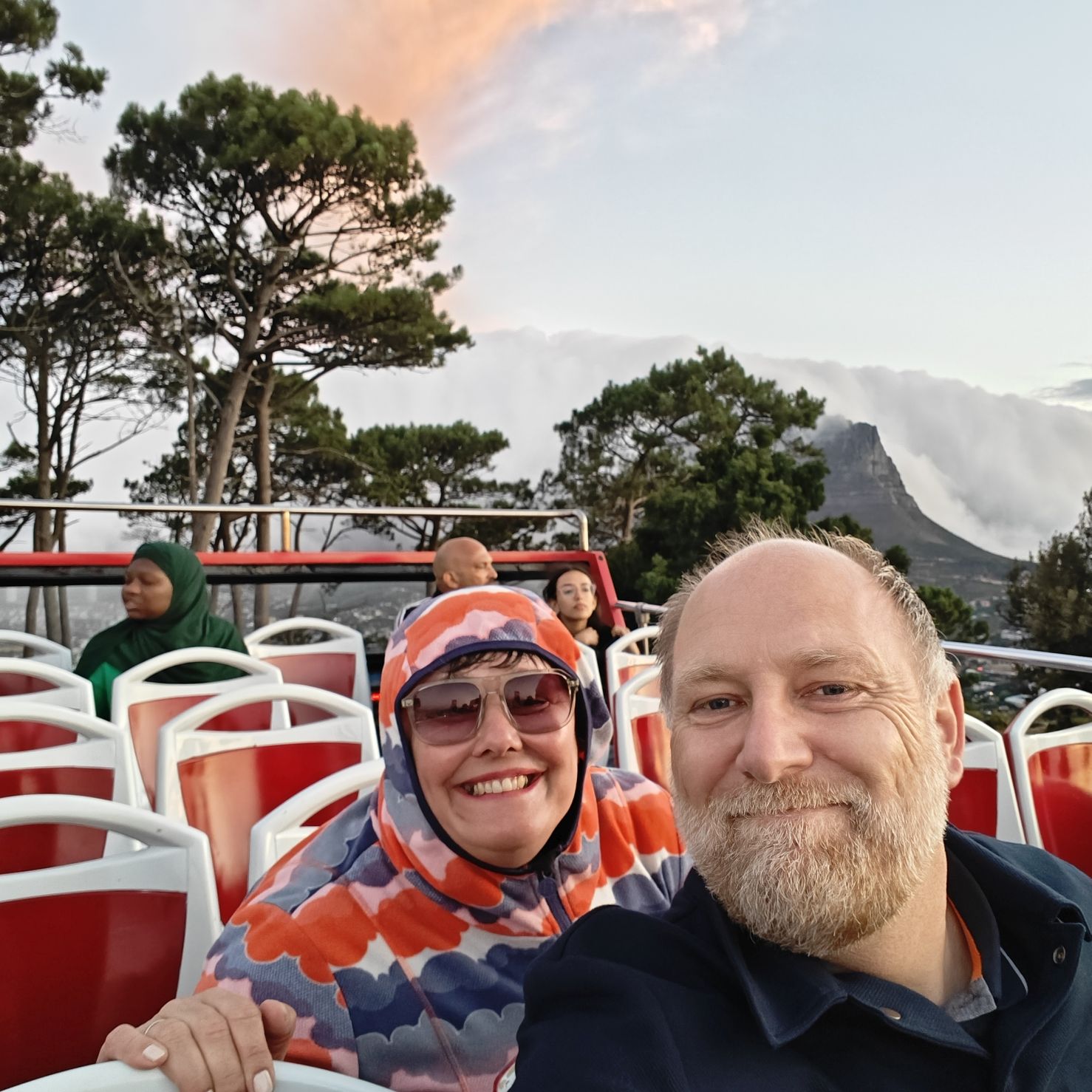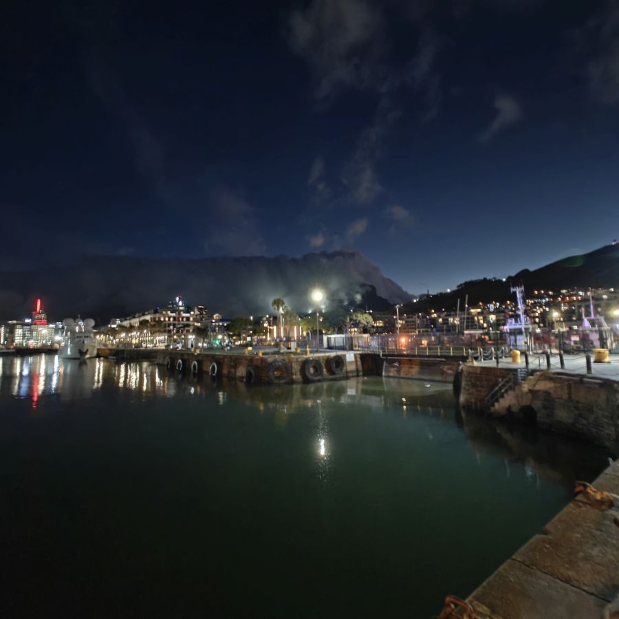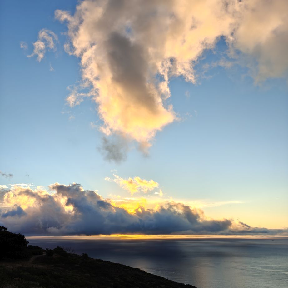 Noch einmal lassen wir uns von einem Uber zur V&A Waterfront bringen. Dort startet die Sonnenuntergangtour mit dem Doppeldeckerbus. Wir fahren in der Abendstimmung über Sea Point und Camps Bay auf den Signal Hill. Dort sind Kapstadts Sonnenuntergänge am schönsten. In Camps Bay angekommen, verdunkelt sich der Himmel und es nieselt – wir bleiben wacker am offenen Oberdeck sitzen, als wir uns dem Signal Hill nähern, hört es wieder auf. Der Bus lässt uns eine Stunde vor Sonnenuntergang aussteigen – es ist eine dramatische Wolkenstimmung, über dem Stadion gibt es einen Regenbogen, über den Tafelbergt ziehen die Wolken wie ein Wasserfall. Die Sonne ist von Wolken verdeckt. Dennoch warten wir gemeinsam mit hunderten anderen, wie sich die Wolken verfärben. Kurz bevor er untergeht, sehen wir den Feuerball im Meer versinken. Dann fahren wir wieder zurück.