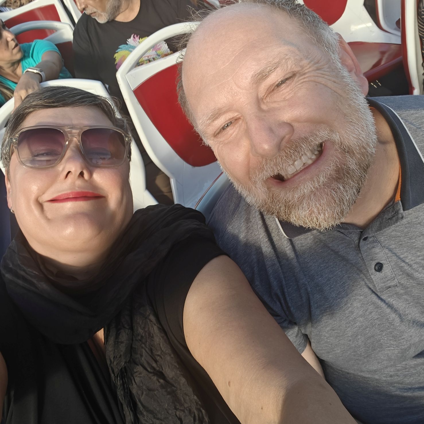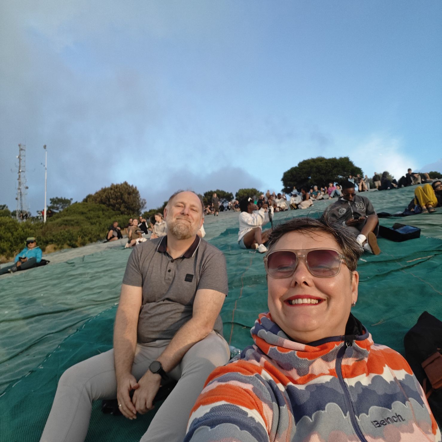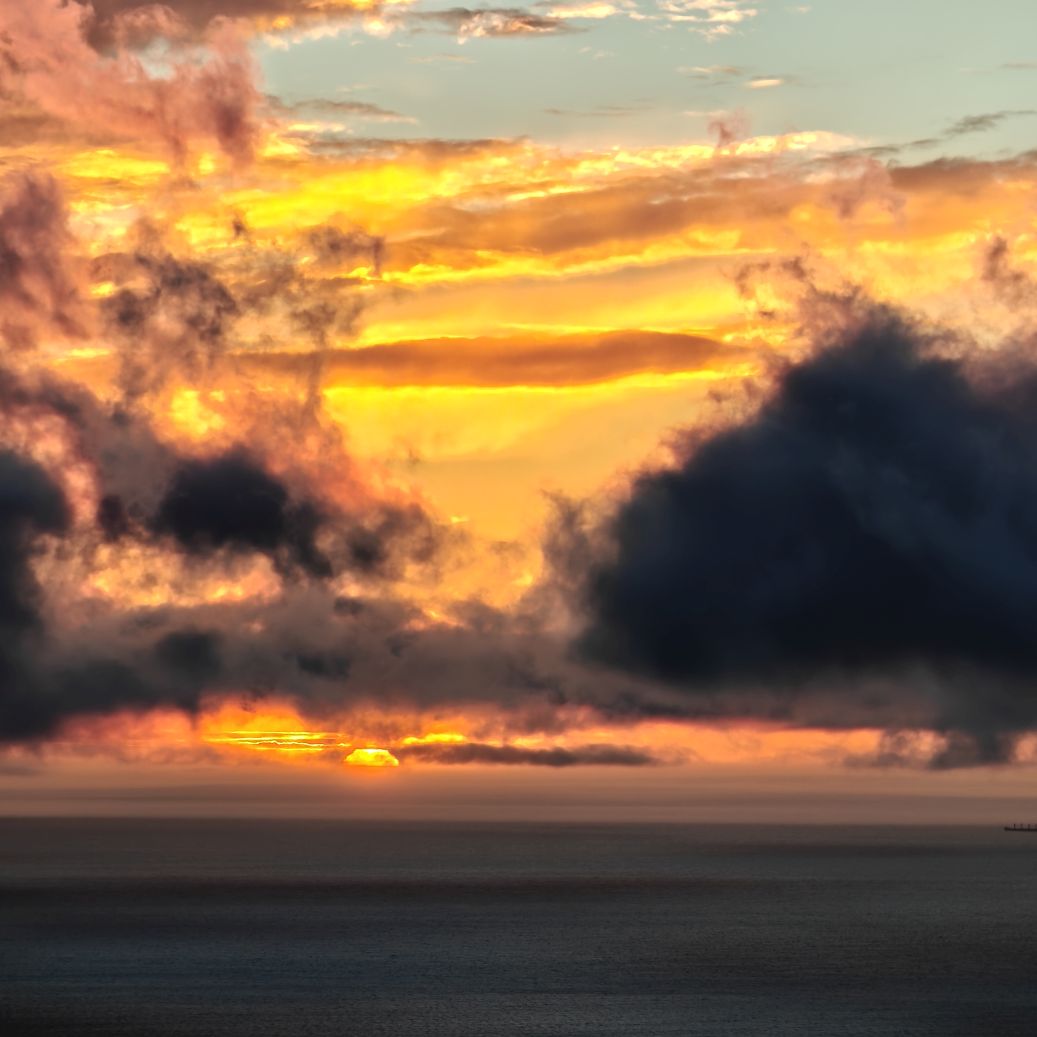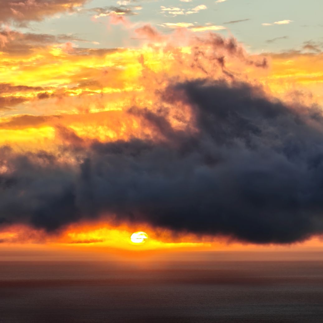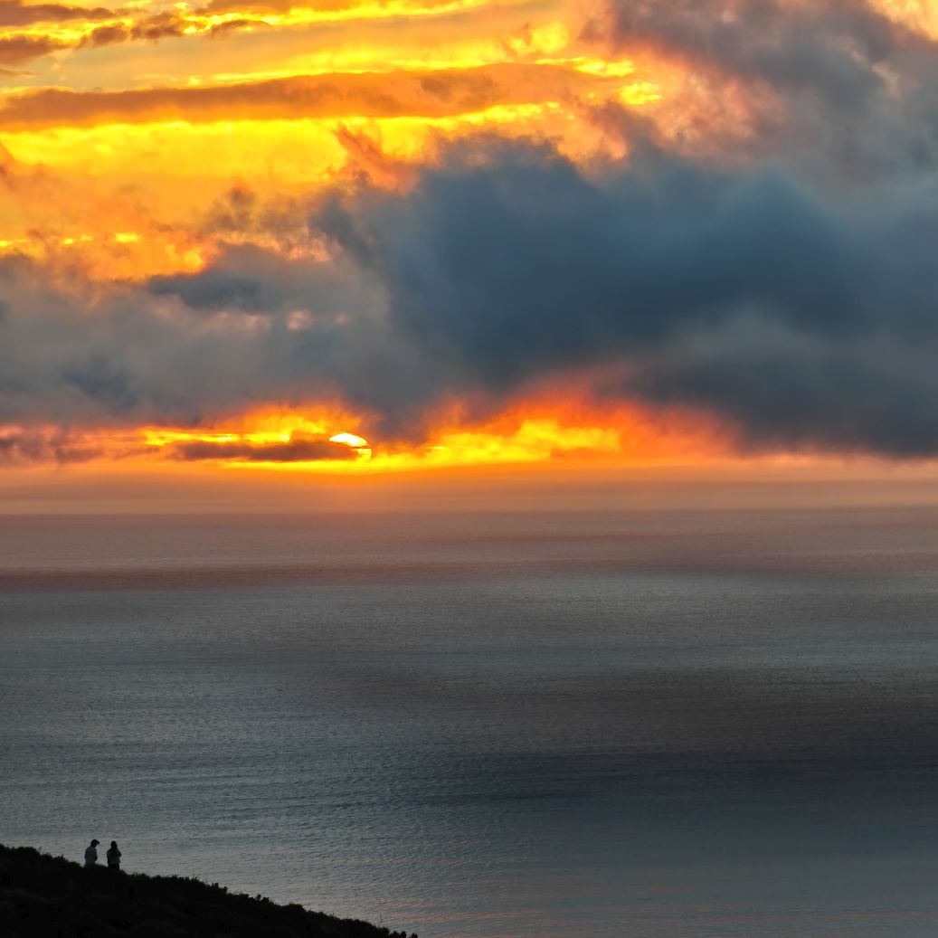 Noch einmal lassen wir uns von einem Uber zur V&A Waterfront bringen. Dort startet die Sonnenuntergangtour mit dem Doppeldeckerbus. Wir fahren in der Abendstimmung über Sea Point und Camps Bay auf den Signal Hill. Dort sind Kapstadts Sonnenuntergänge am schönsten. In Camps Bay angekommen, verdunkelt sich der Himmel und es nieselt – wir bleiben wacker am offenen Oberdeck sitzen, als wir uns dem Signal Hill nähern, hört es wieder auf. Der Bus lässt uns eine Stunde vor Sonnenuntergang aussteigen – es ist eine dramatische Wolkenstimmung, über dem Stadion gibt es einen Regenbogen, über den Tafelbergt ziehen die Wolken wie ein Wasserfall. Die Sonne ist von Wolken verdeckt. Dennoch warten wir gemeinsam mit hunderten anderen, wie sich die Wolken verfärben. Kurz bevor er untergeht, sehen wir den Feuerball im Meer versinken. Dann fahren wir wieder zurück.