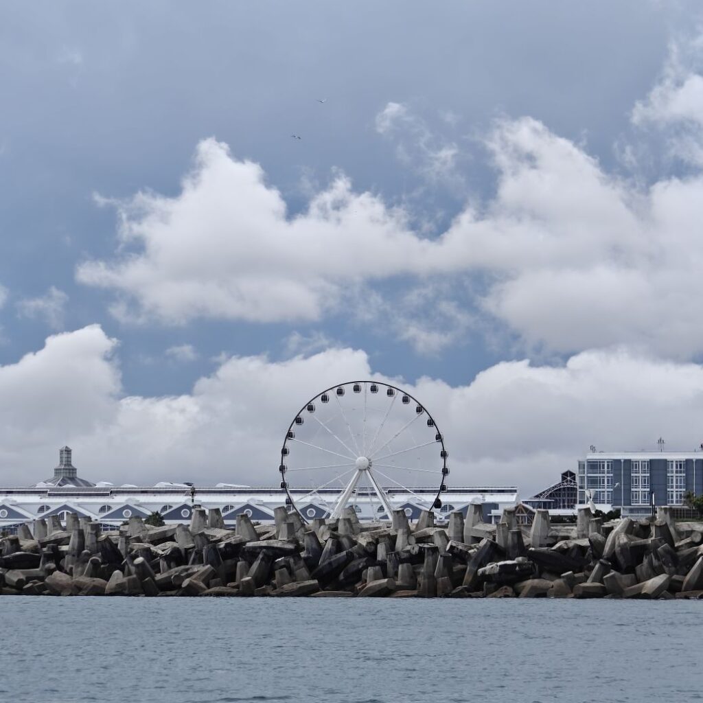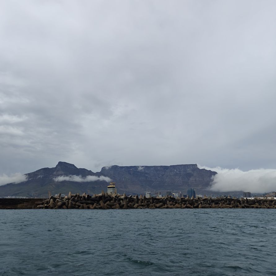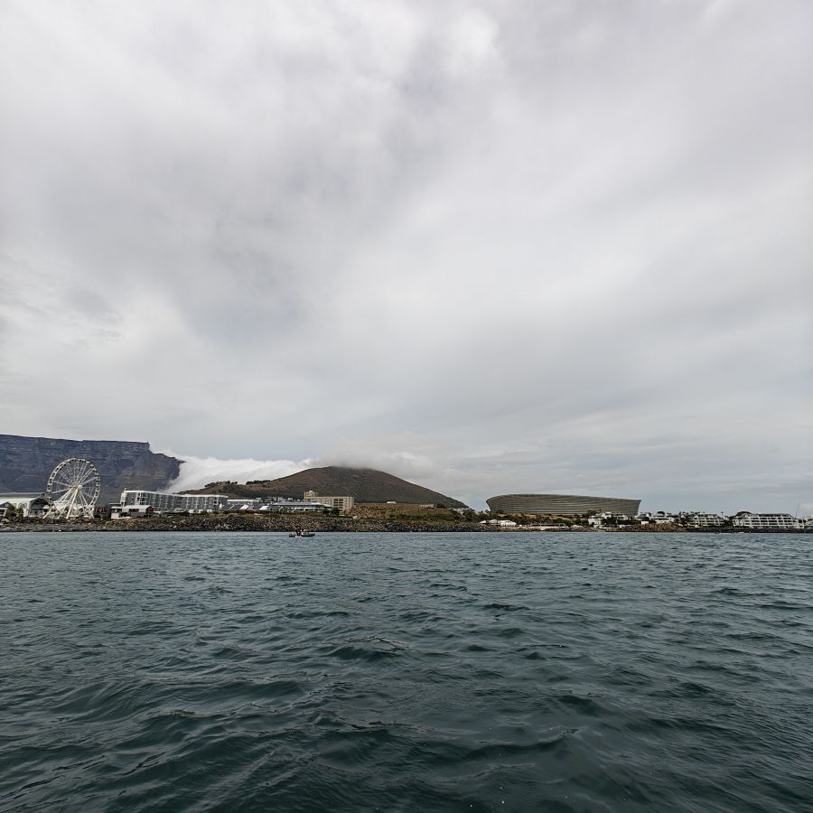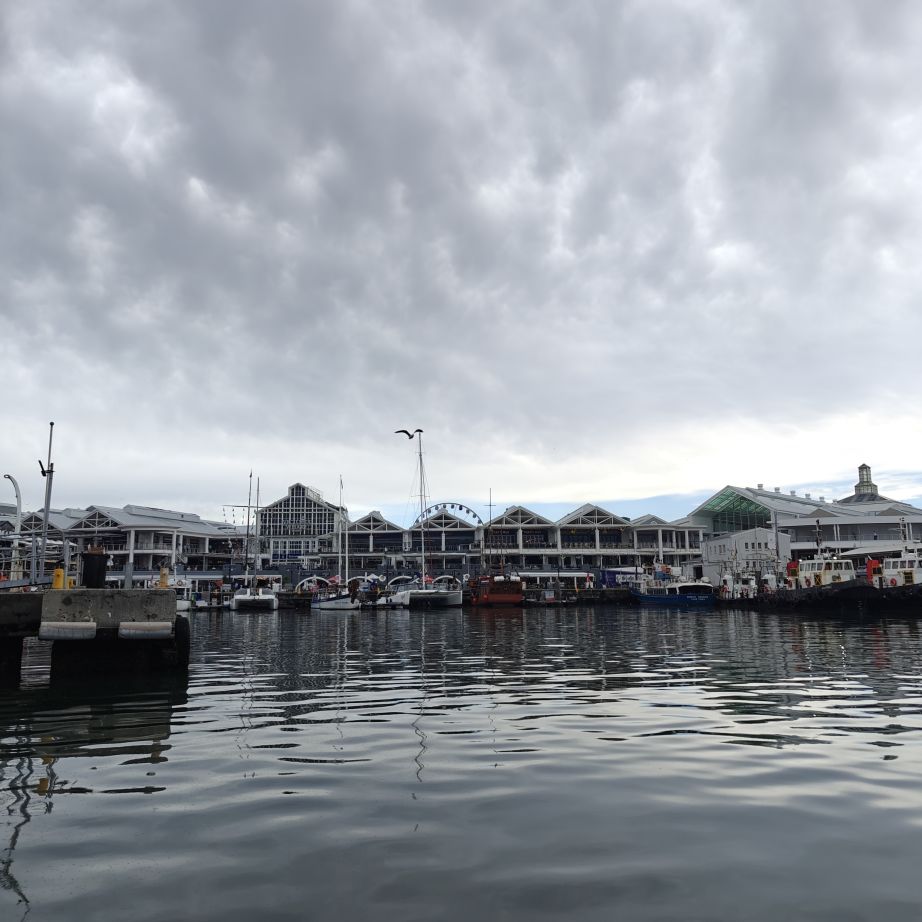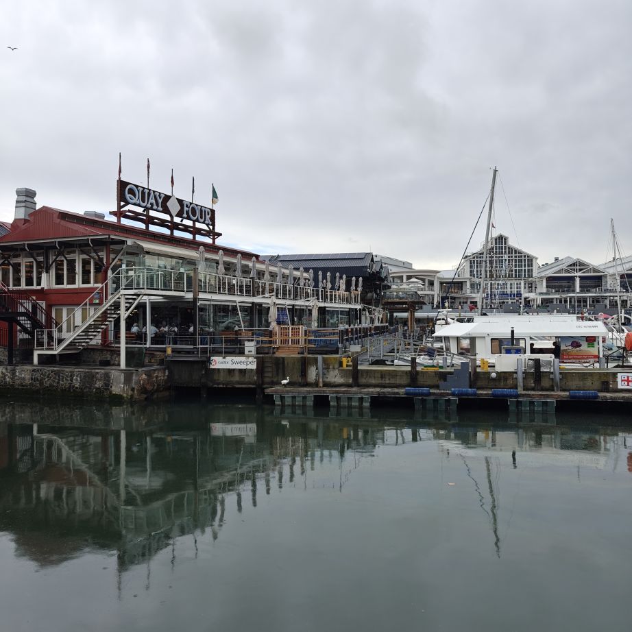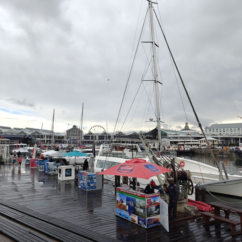 Heute frühstücken wir wieder ausgiebig – unser erster Programmpunkt ist für 11 Uhr angesetzt. Es regnet, die Frühstückstische stehen unter einer Pergola. Wir lassen uns mit einem Uber zur Victoria & Alfred Waterfront zu African Eagle Marine Eco Tours bringen.