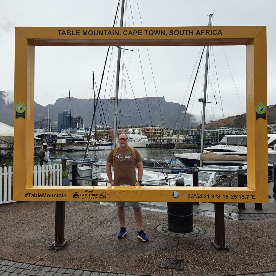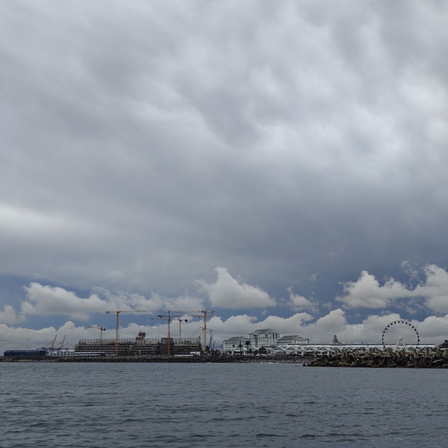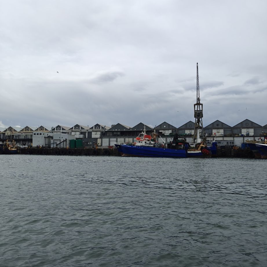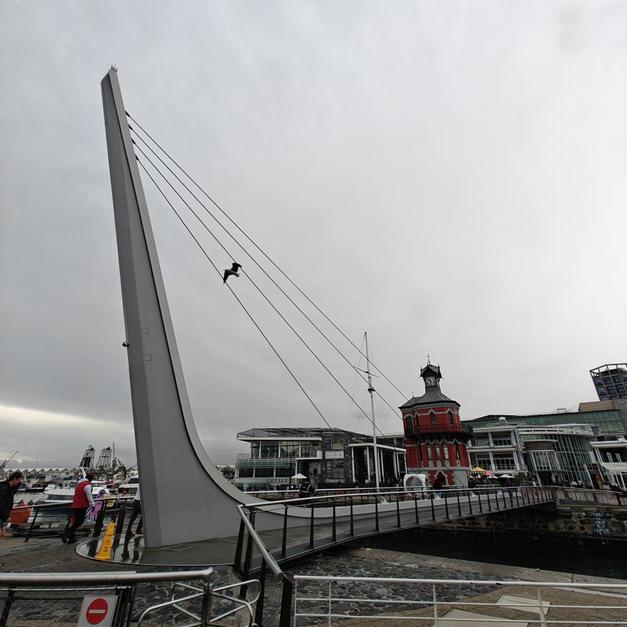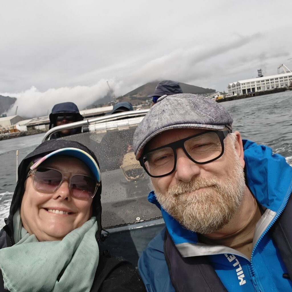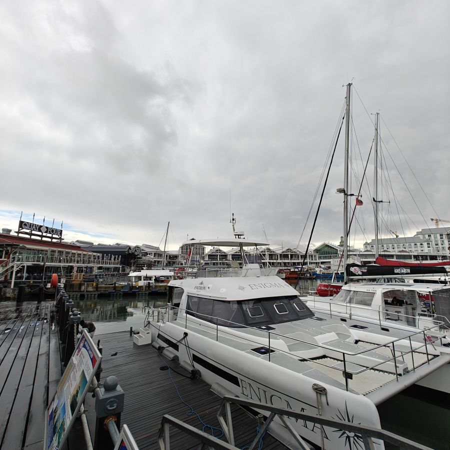 Heute frühstücken wir wieder ausgiebig – unser erster Programmpunkt ist für 11 Uhr angesetzt. Es regnet, die Frühstückstische stehen unter einer Pergola. Wir lassen uns mit einem Uber zur Victoria & Alfred Waterfront zu African Eagle Marine Eco Tours bringen.