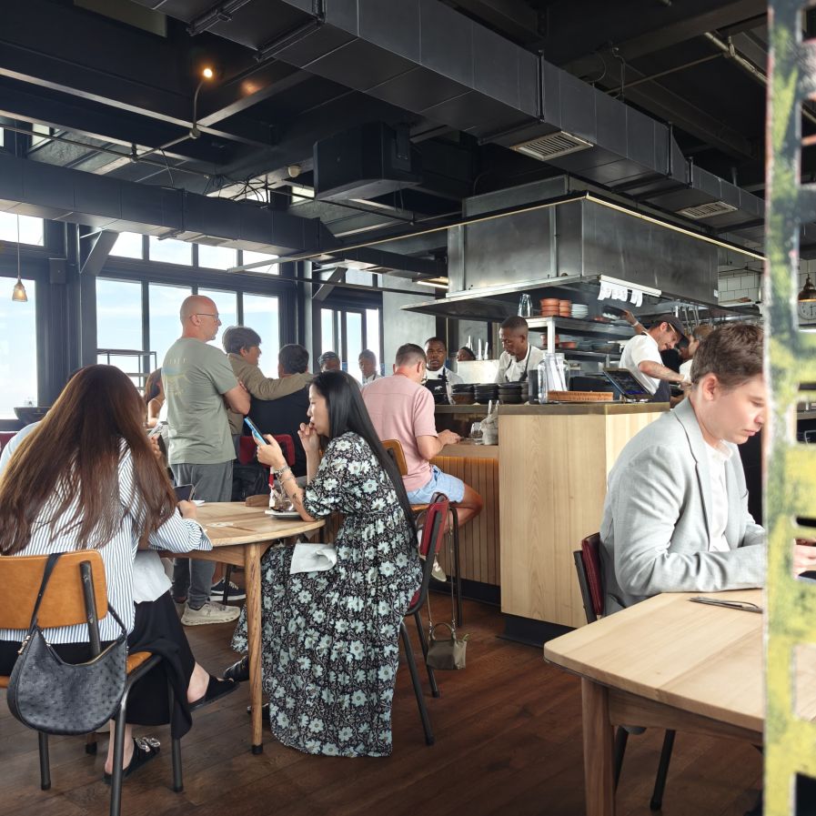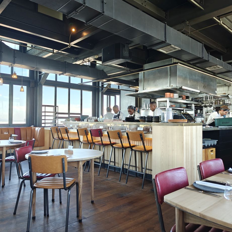 Zum zweiten Mal betreten wir die Old Biscuit Mill, dieses Mal für ein Mittagessen. Der Pot Luck Club ist eine der angesagtesten Locations in Kapstadt mit sehr gutem Essen, das am Tisch geteilt wird. Wir fahren in den obersten Stock des Silos in der alten Keksfabrik und betreten ein stylisches Lokal im Industrial-Chic. Wir essen acht Gerichte aus der Karte, die allesamt köstlich schmecken. Die Teller werden in der Mitte des Tisches platziert, alles wird geteilt.