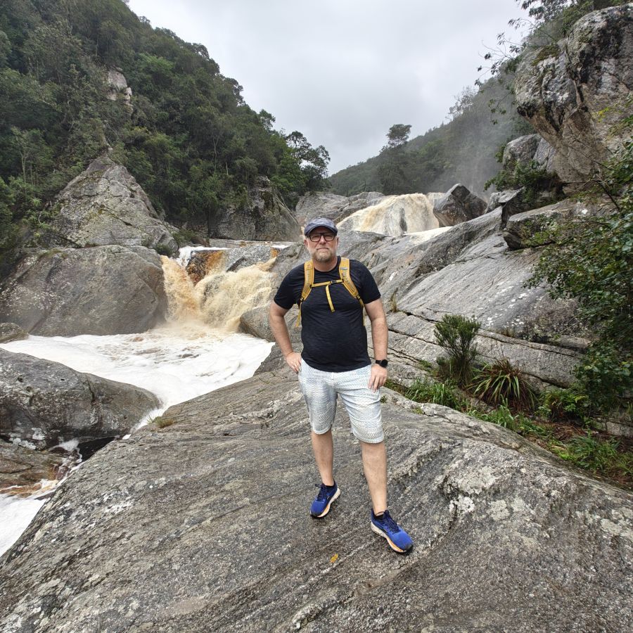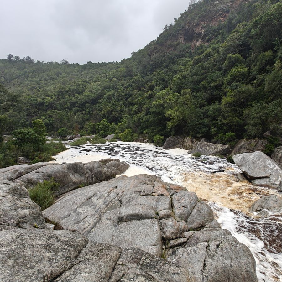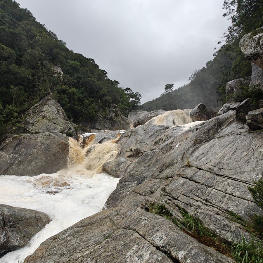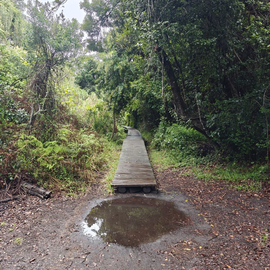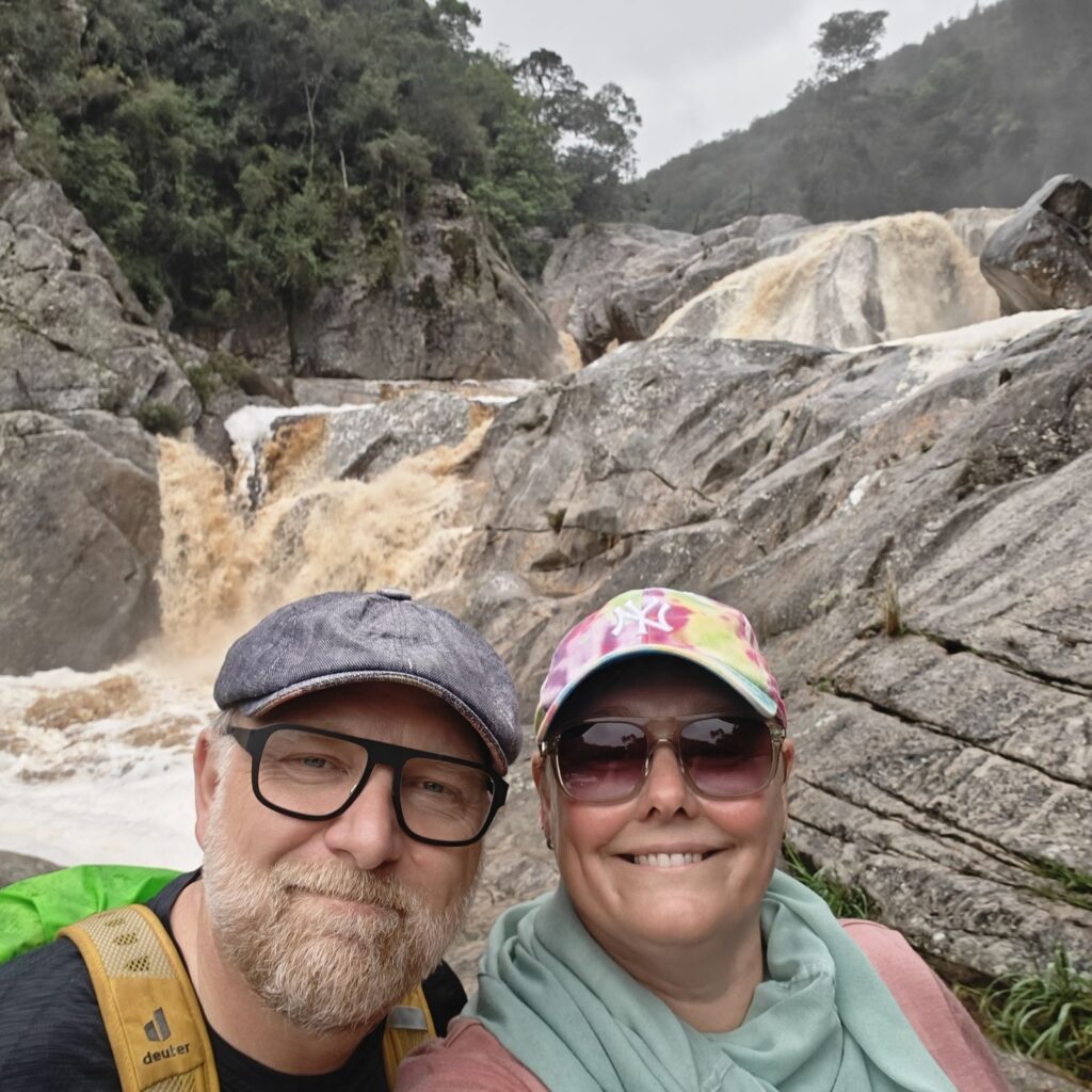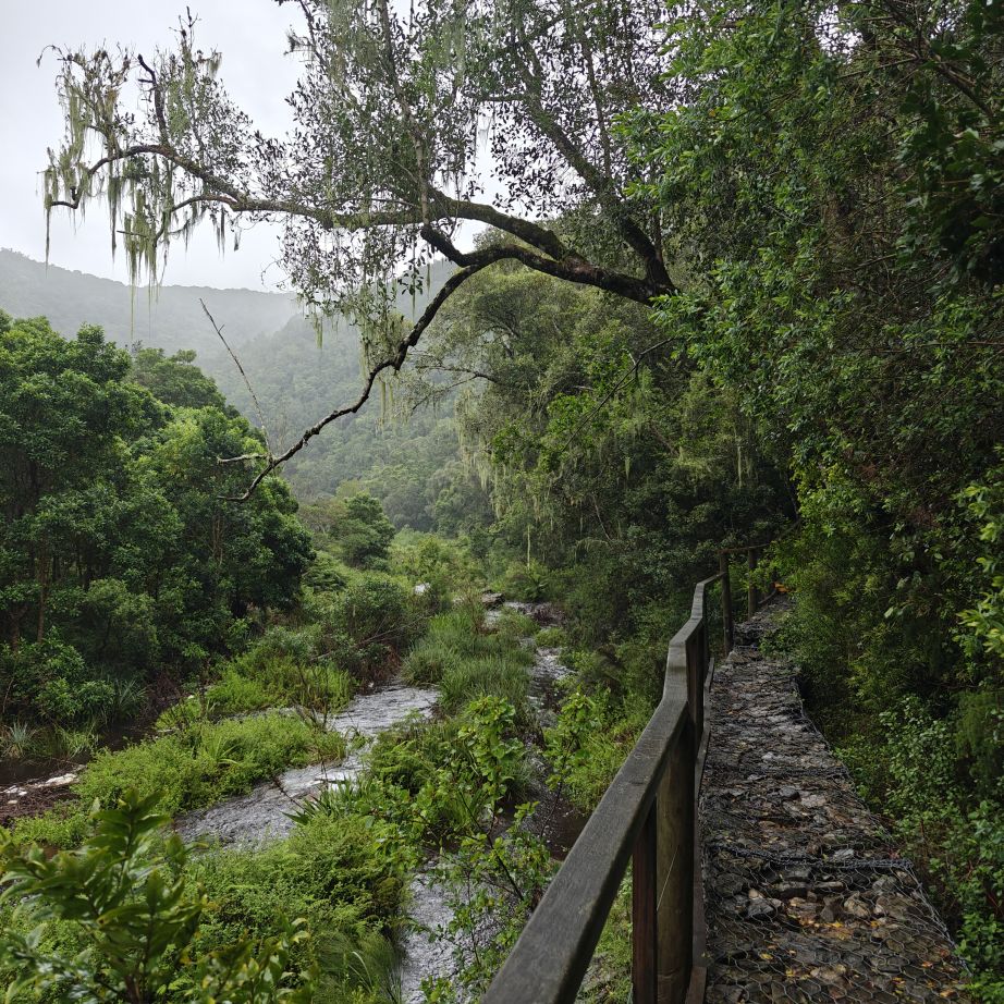 Wir fahren ein paar Minuten weiter zum Ausgangspunkt des Half-Collared Kingfisher Trail. Wir wandern auf einem angelegten Urwald-Weg entlang des Touwsrivier bis zu einem Wasserfall und sehen bunte Vögel und hören ohrenbetäubendes Fröschequaken. Einen Kobalteisvogel, nach dem die Wanderung benannt ist, sehen wir leider nicht. Der Wasserfall ist üblicherweise nur ein kleines Rinnsal, heute tost er aufgrund des Regens über die Felsen. Das Wasser ist rotbräunlich verfärbt, weil eisenhaltige Erde durch den Regen weggeschwemmt wurde. Für die rund acht Kilometer sind wir zweieinhalb Stunden unterwegs. Das größte Abenteuer ist die Flussüberfahrt auf einem Ponton, der sich nur dann bewegt, wenn wir am Seil ziehen – ganz schön anstrengend!
