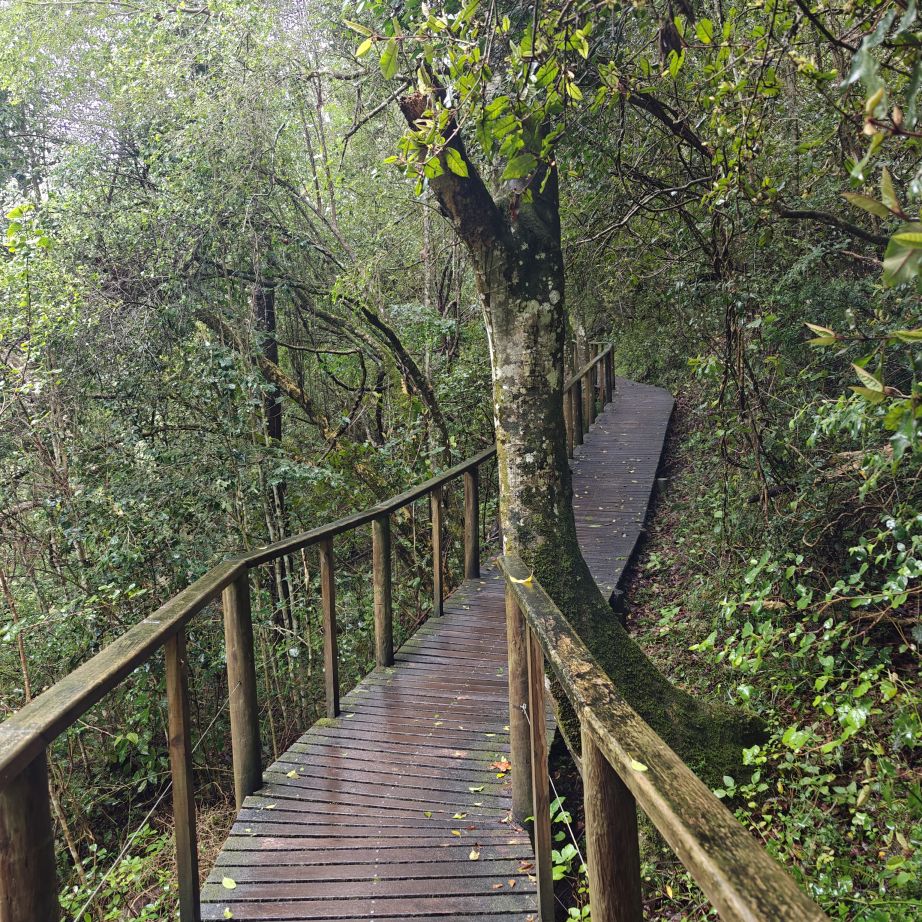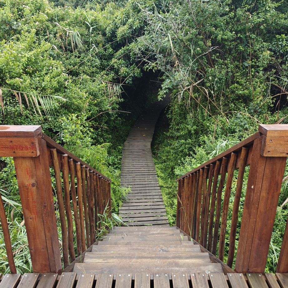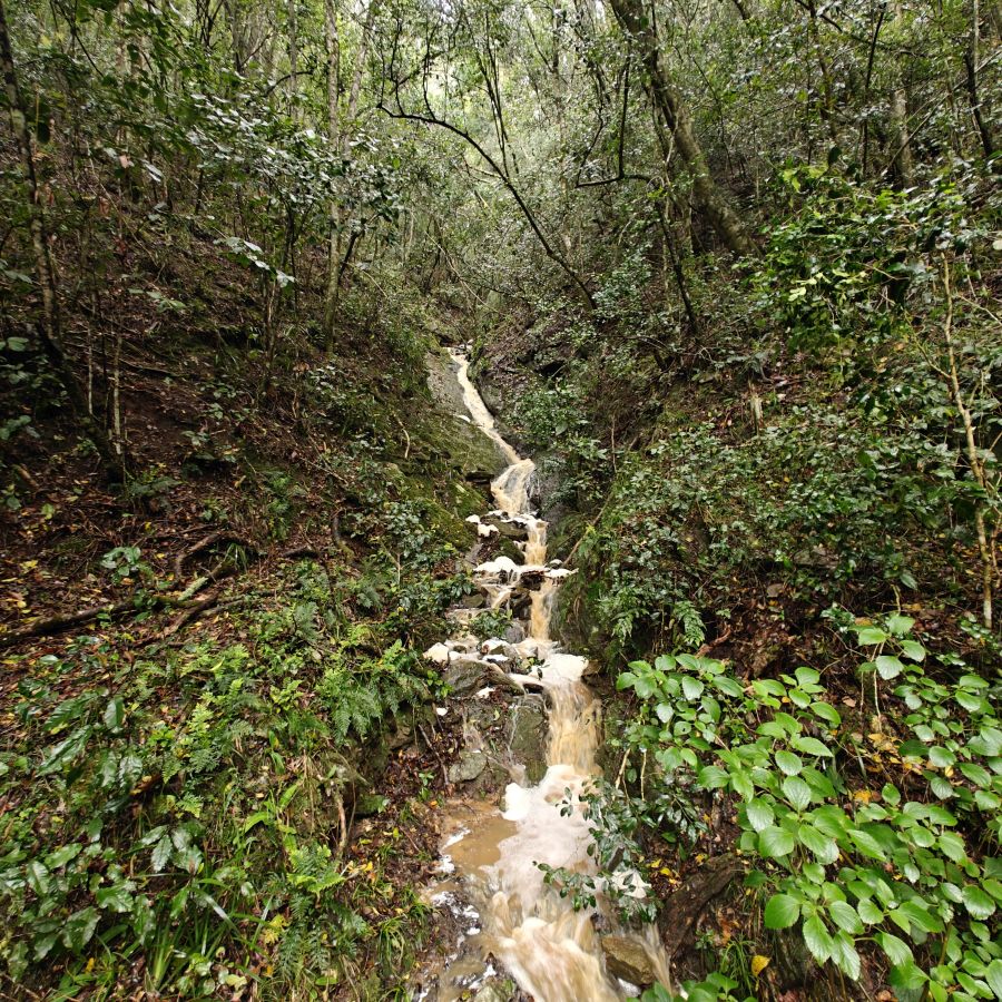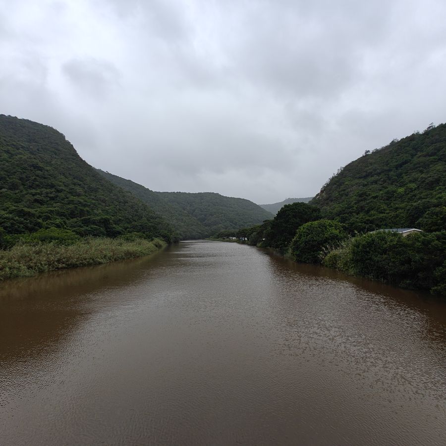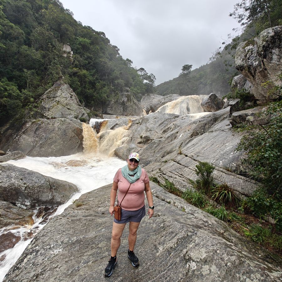 Wir fahren ein paar Minuten weiter zum Ausgangspunkt des Half-Collared Kingfisher Trail. Wir wandern auf einem angelegten Urwald-Weg entlang des Touwsrivier bis zu einem Wasserfall und sehen bunte Vögel und hören ohrenbetäubendes Fröschequaken. Einen Kobalteisvogel, nach dem die Wanderung benannt ist, sehen wir leider nicht. Der Wasserfall ist üblicherweise nur ein kleines Rinnsal, heute tost er aufgrund des Regens über die Felsen. Das Wasser ist rotbräunlich verfärbt, weil eisenhaltige Erde durch den Regen weggeschwemmt wurde. Für die rund acht Kilometer sind wir zweieinhalb Stunden unterwegs. Das größte Abenteuer ist die Flussüberfahrt auf einem Ponton, der sich nur dann bewegt, wenn wir am Seil ziehen – ganz schön anstrengend!