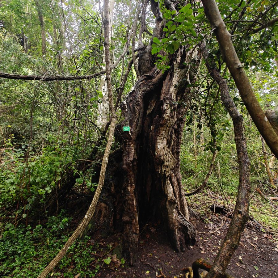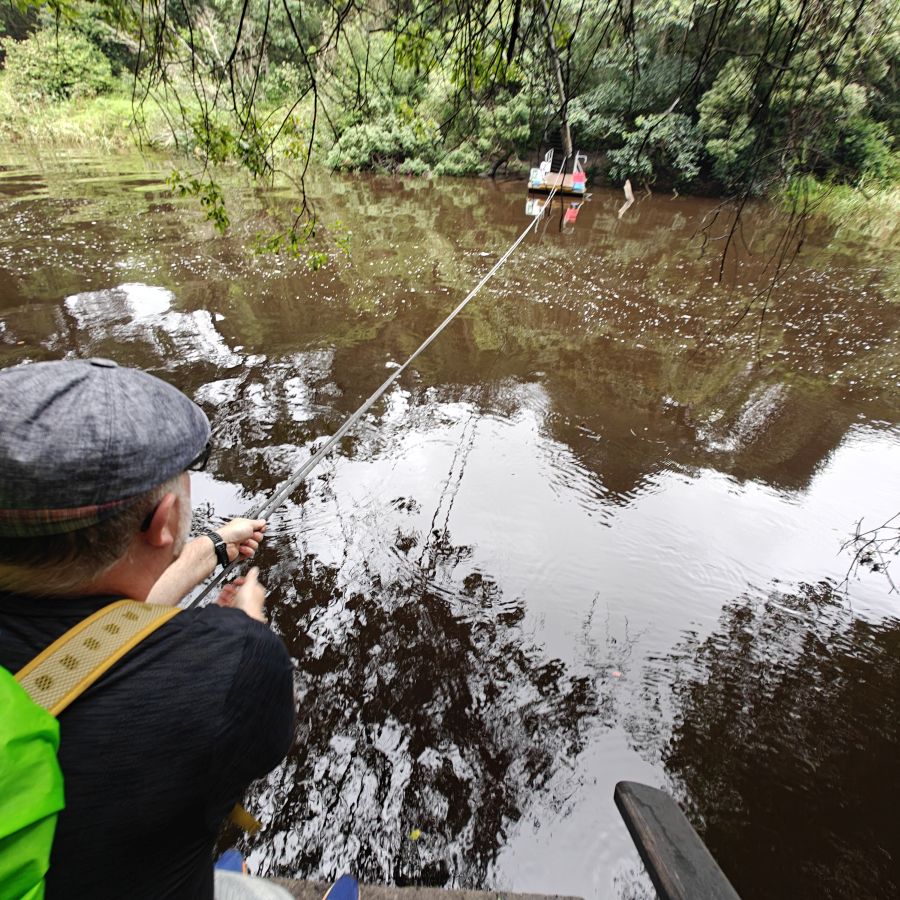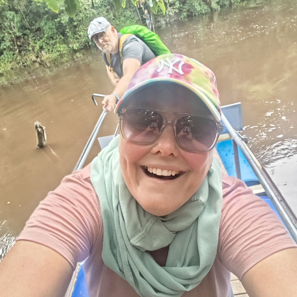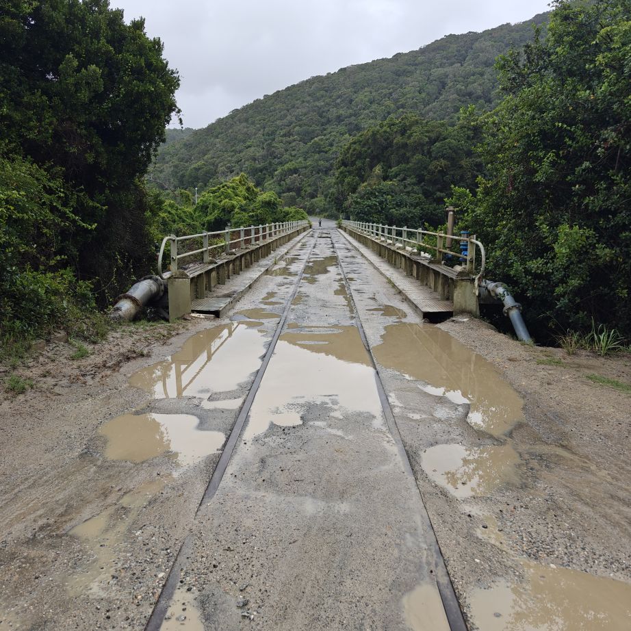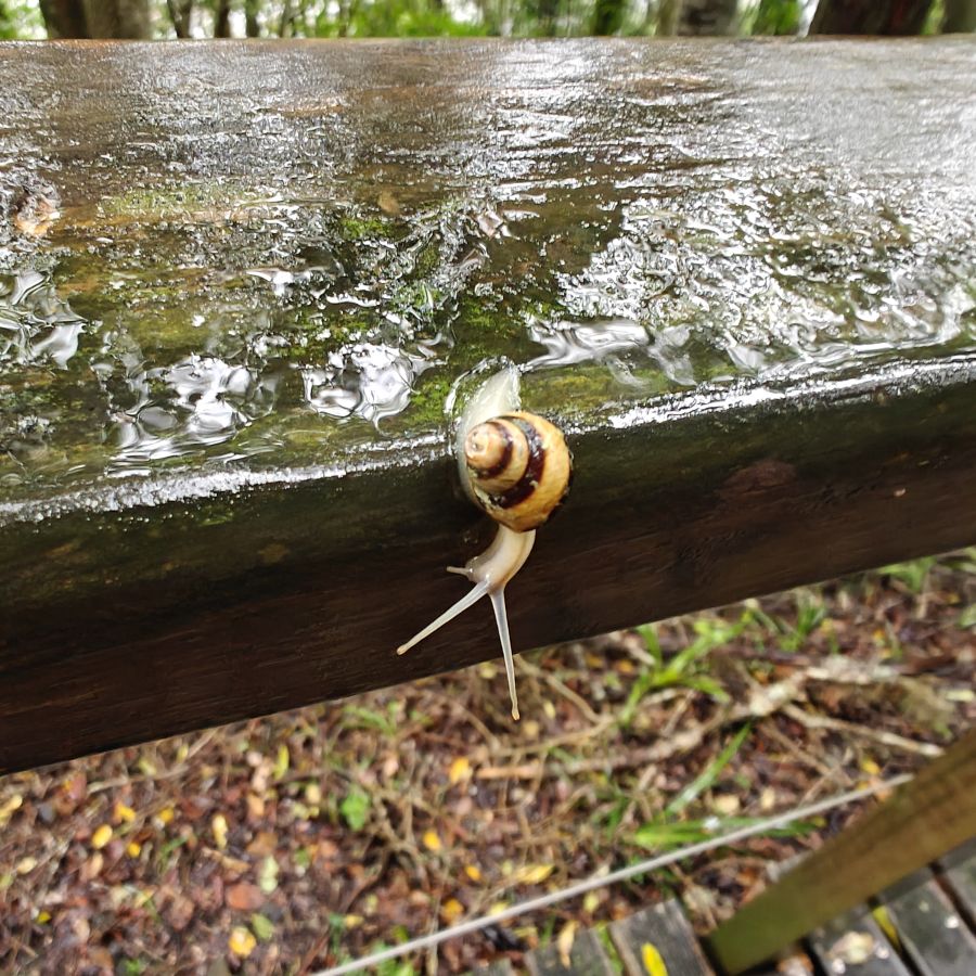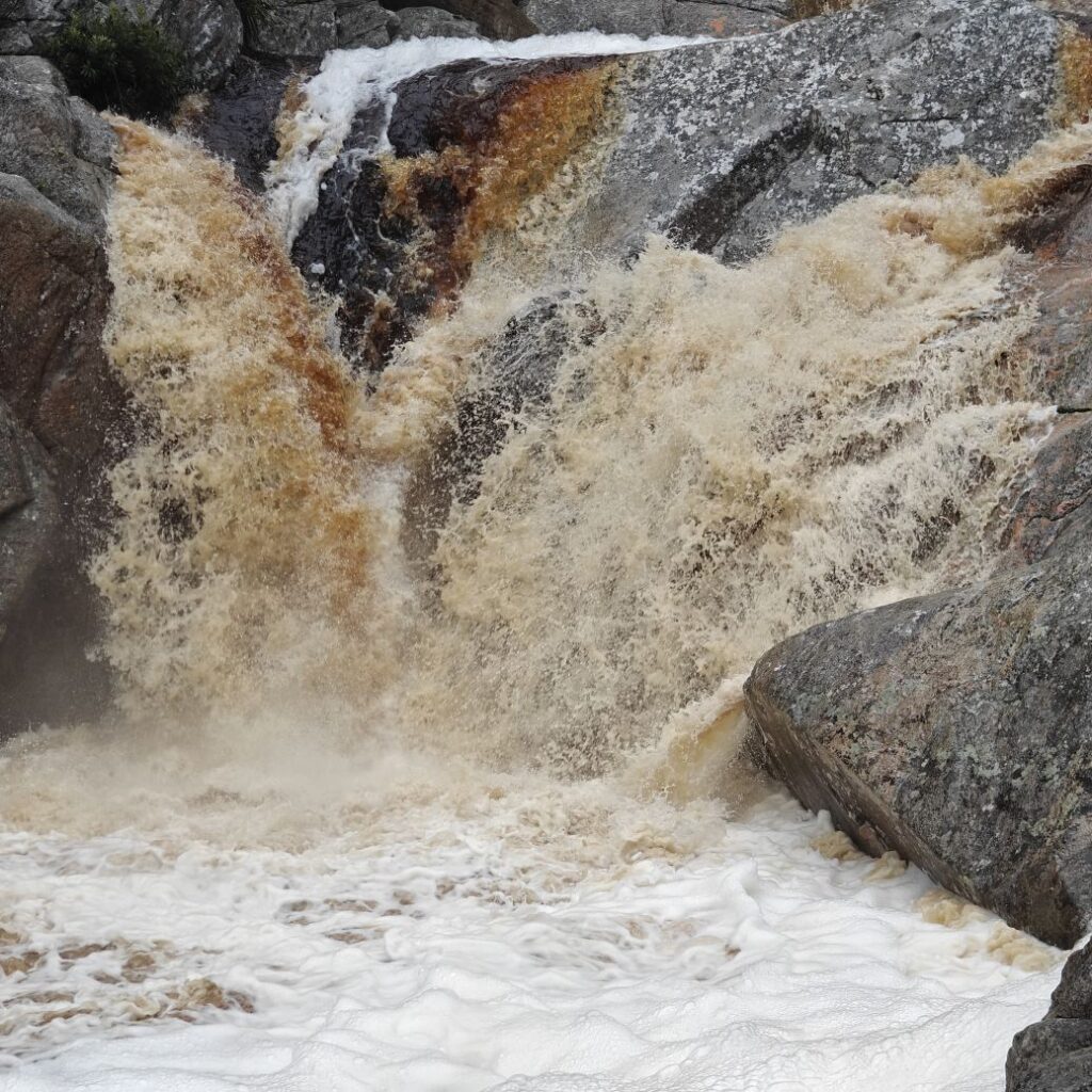 Wir fahren ein paar Minuten weiter zum Ausgangspunkt des Half-Collared Kingfisher Trail. Wir wandern auf einem angelegten Urwald-Weg entlang des Touwsrivier bis zu einem Wasserfall und sehen bunte Vögel und hören ohrenbetäubendes Fröschequaken. Einen Kobalteisvogel, nach dem die Wanderung benannt ist, sehen wir leider nicht. Der Wasserfall ist üblicherweise nur ein kleines Rinnsal, heute tost er aufgrund des Regens über die Felsen. Das Wasser ist rotbräunlich verfärbt, weil eisenhaltige Erde durch den Regen weggeschwemmt wurde. Für die rund acht Kilometer sind wir zweieinhalb Stunden unterwegs. Das größte Abenteuer ist die Flussüberfahrt auf einem Ponton, der sich nur dann bewegt, wenn wir am Seil ziehen – ganz schön anstrengend!