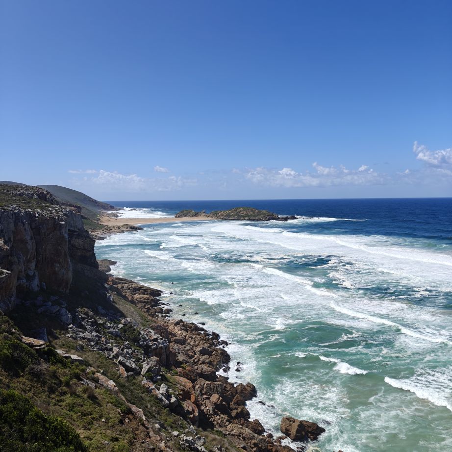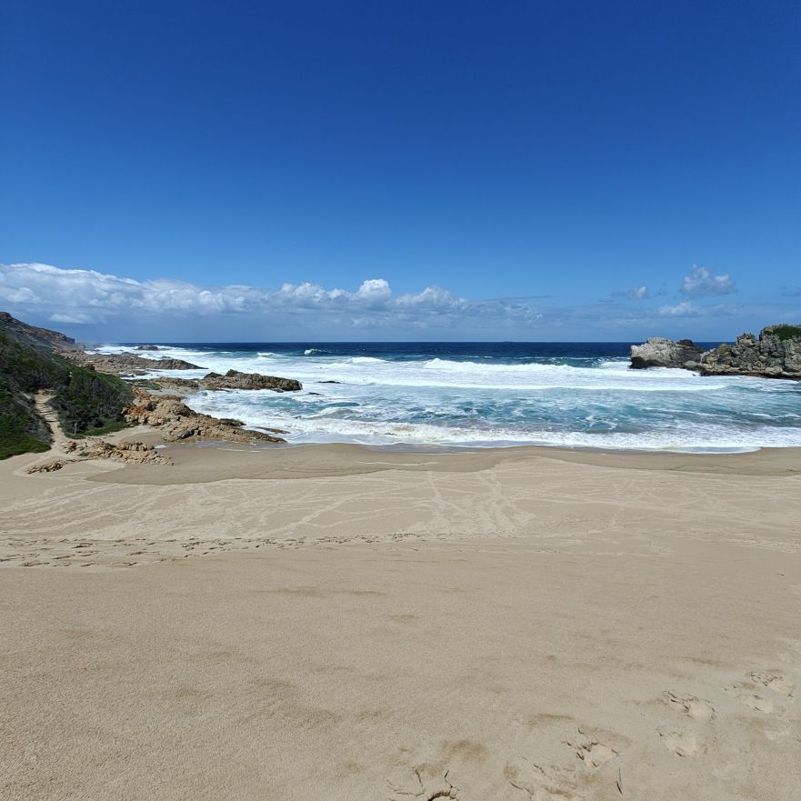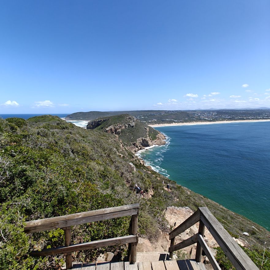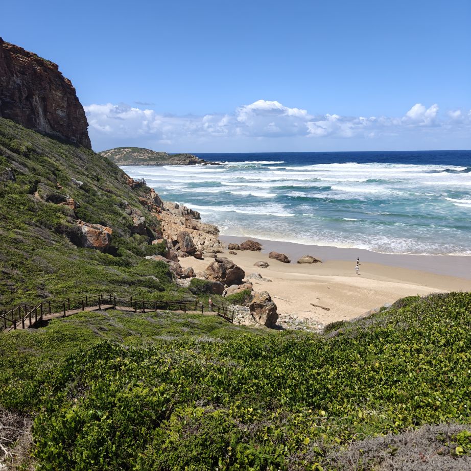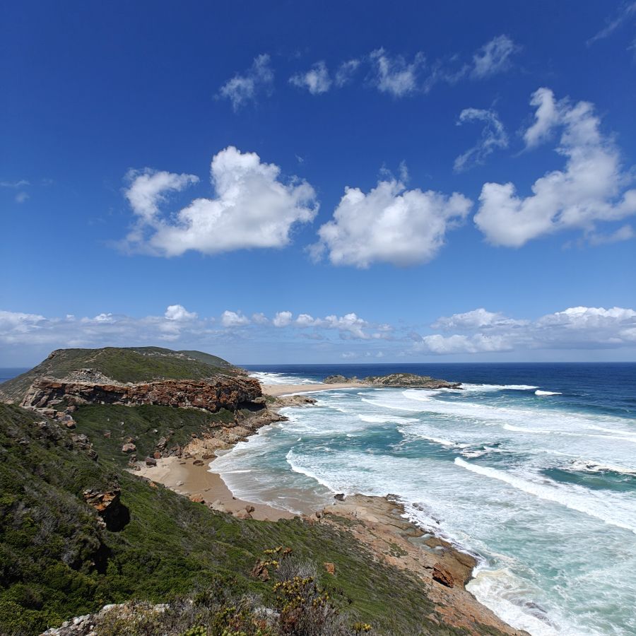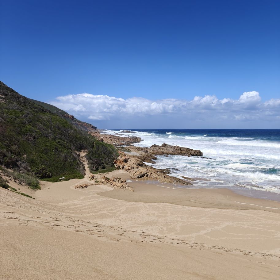 Wir haben eine 5,5 Kilometer lange Wanderung im Robberg Nature Reserve vor uns. Bereits im Vorfeld haben wir einen Tagespass organisiert, diese sind streng limitiert. Der Weg durch das Naturschutzgebiet ist atemberaubend schön. Er führt am nördlichen Kamm der Halbinsel entlang bis zur großen Robbenkolonie, die wir gestern besucht haben. Dann geht es hinunter zur Witsand Sanddüne, weiter zum wunderschönen Strand vor „Die Eiland“ und zurück zum Parkplatz. Für die Strecke haben wir fast zweieinhalb Stunden benötigt, da einige nicht ganz einfache Passagen dabei waren.