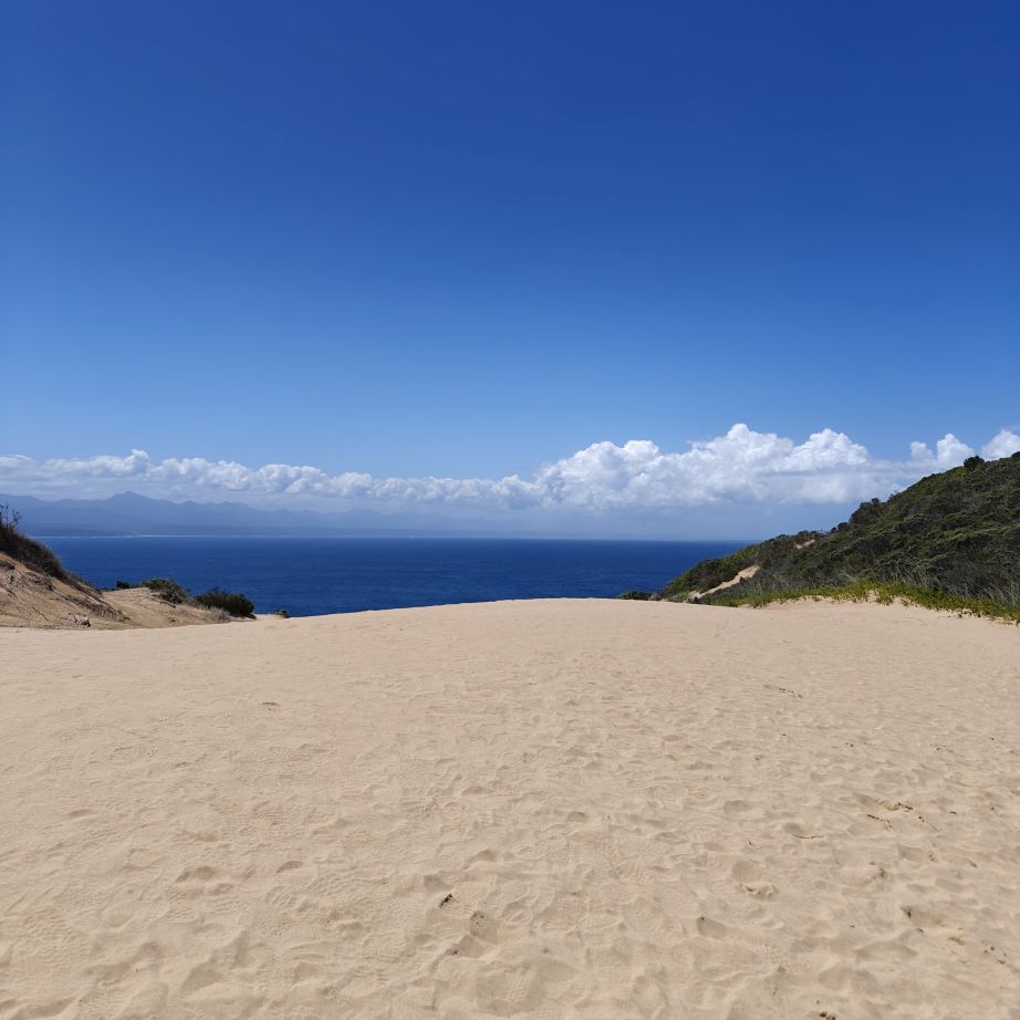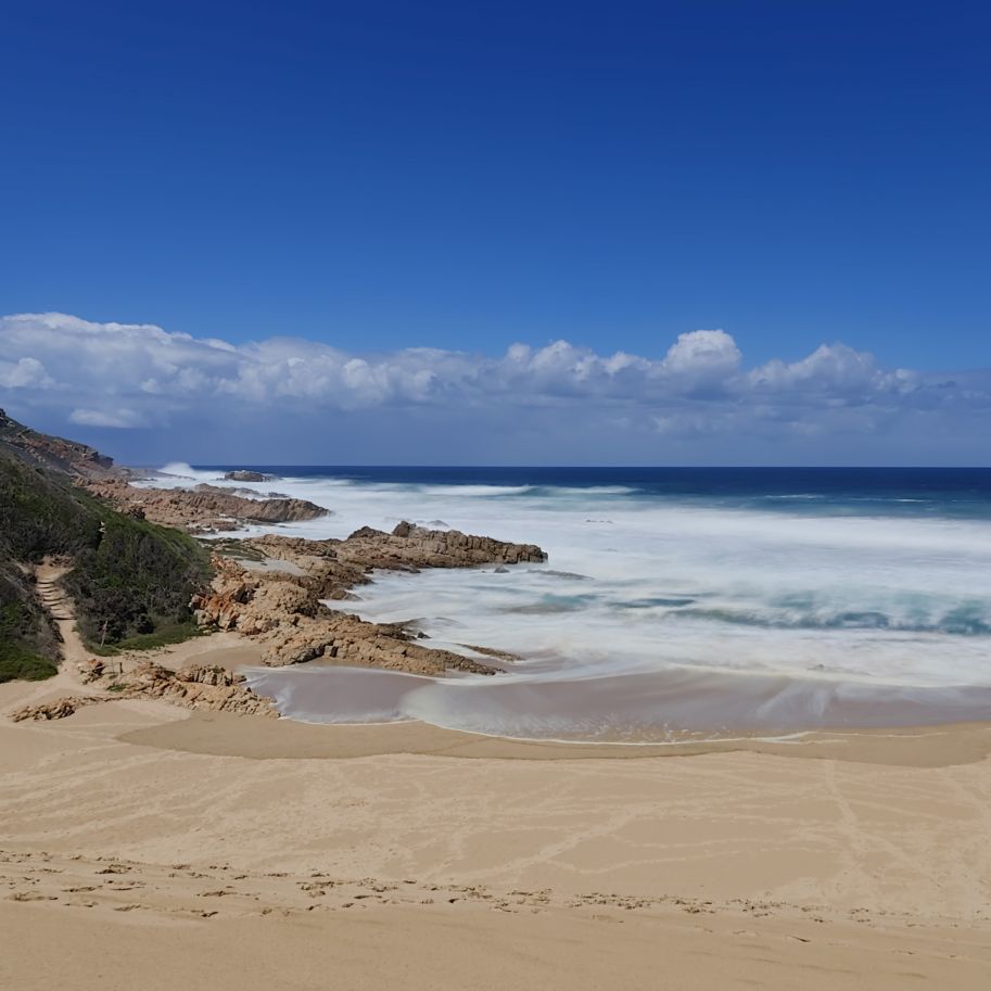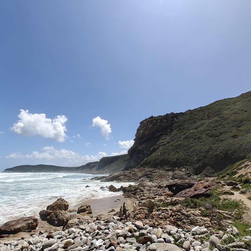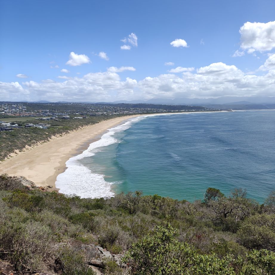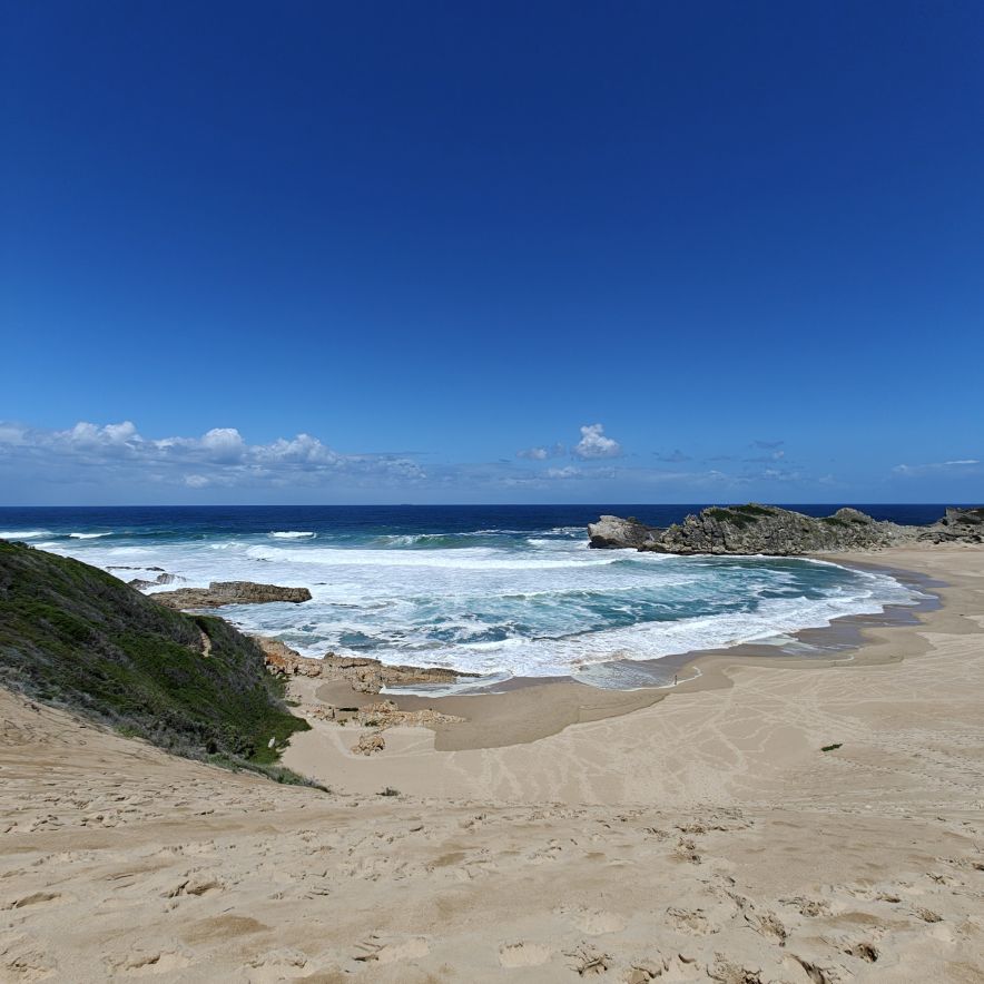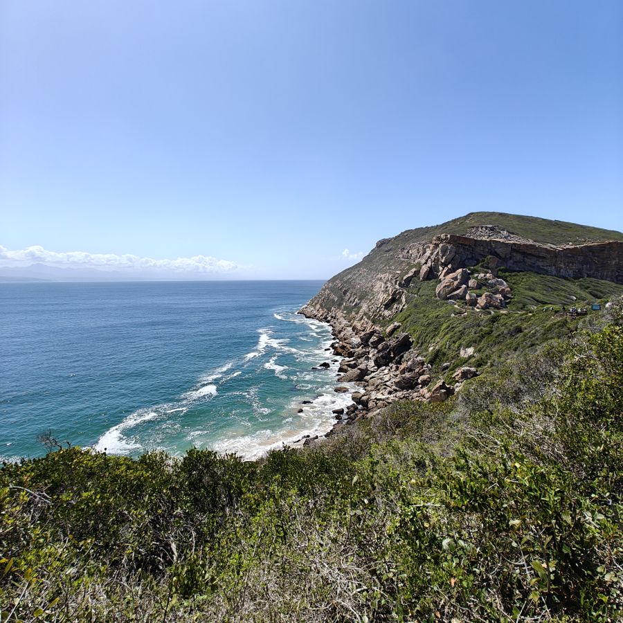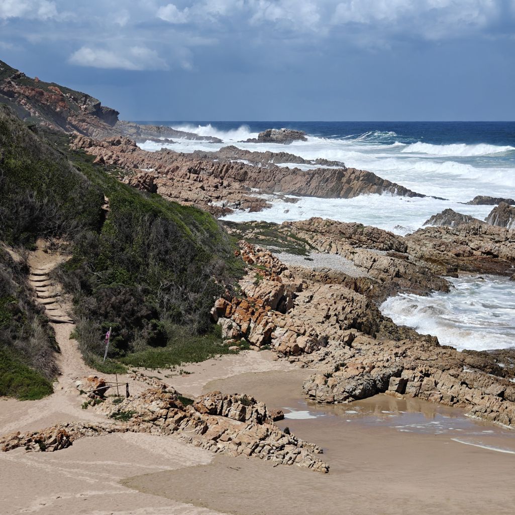 Wir haben eine 5,5 Kilometer lange Wanderung im Robberg Nature Reserve vor uns. Bereits im Vorfeld haben wir einen Tagespass organisiert, diese sind streng limitiert. Der Weg durch das Naturschutzgebiet ist atemberaubend schön. Er führt am nördlichen Kamm der Halbinsel entlang bis zur großen Robbenkolonie, die wir gestern besucht haben. Dann geht es hinunter zur Witsand Sanddüne, weiter zum wunderschönen Strand vor „Die Eiland“ und zurück zum Parkplatz. Für die Strecke haben wir fast zweieinhalb Stunden benötigt, da einige nicht ganz einfache Passagen dabei waren.