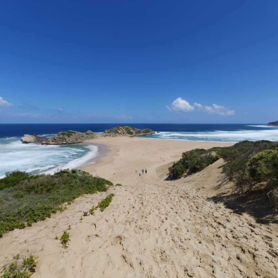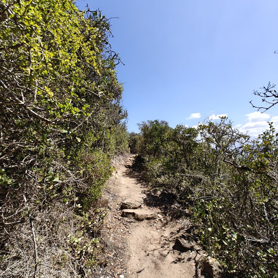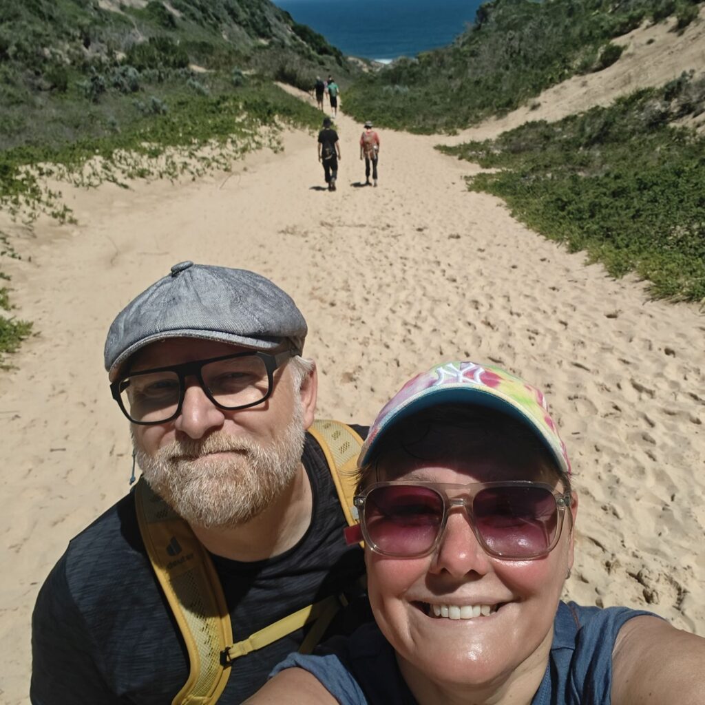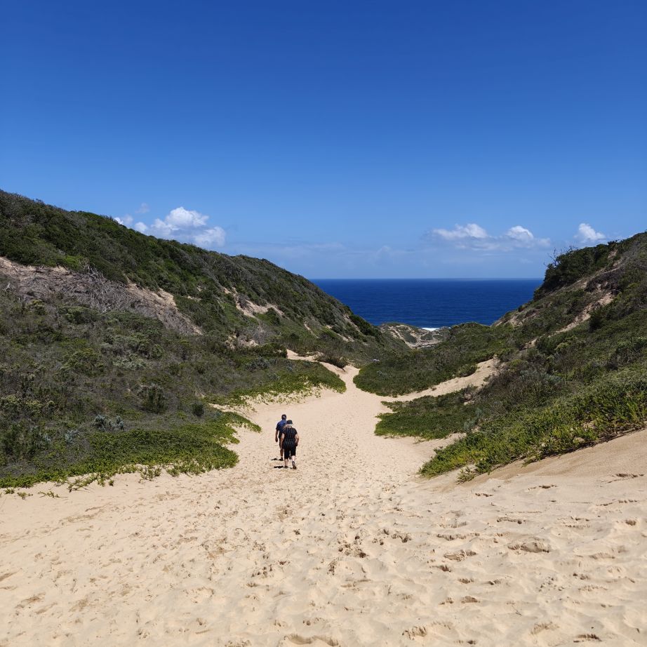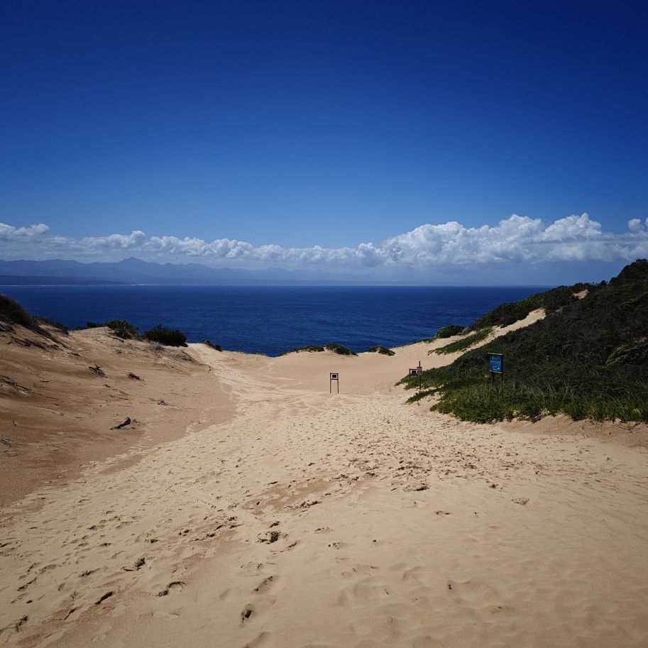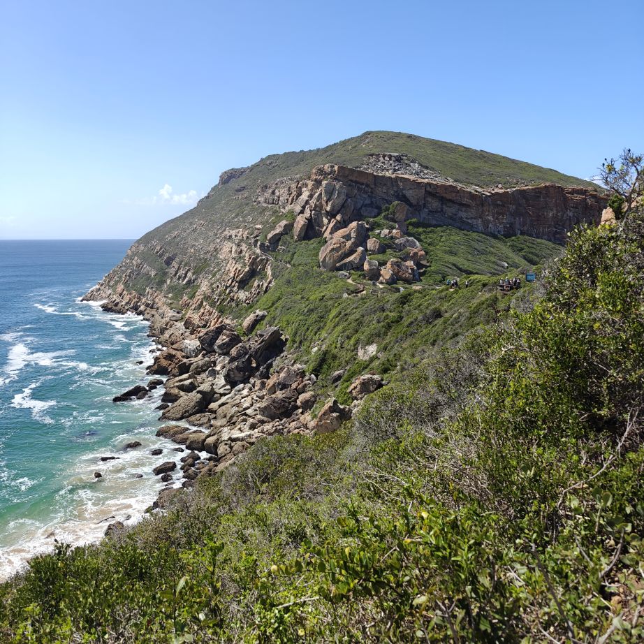 Wir haben eine 5,5 Kilometer lange Wanderung im Robberg Nature Reserve vor uns. Bereits im Vorfeld haben wir einen Tagespass organisiert, diese sind streng limitiert. Der Weg durch das Naturschutzgebiet ist atemberaubend schön. Er führt am nördlichen Kamm der Halbinsel entlang bis zur großen Robbenkolonie, die wir gestern besucht haben. Dann geht es hinunter zur Witsand Sanddüne, weiter zum wunderschönen Strand vor „Die Eiland“ und zurück zum Parkplatz. Für die Strecke haben wir fast zweieinhalb Stunden benötigt, da einige nicht ganz einfache Passagen dabei waren.