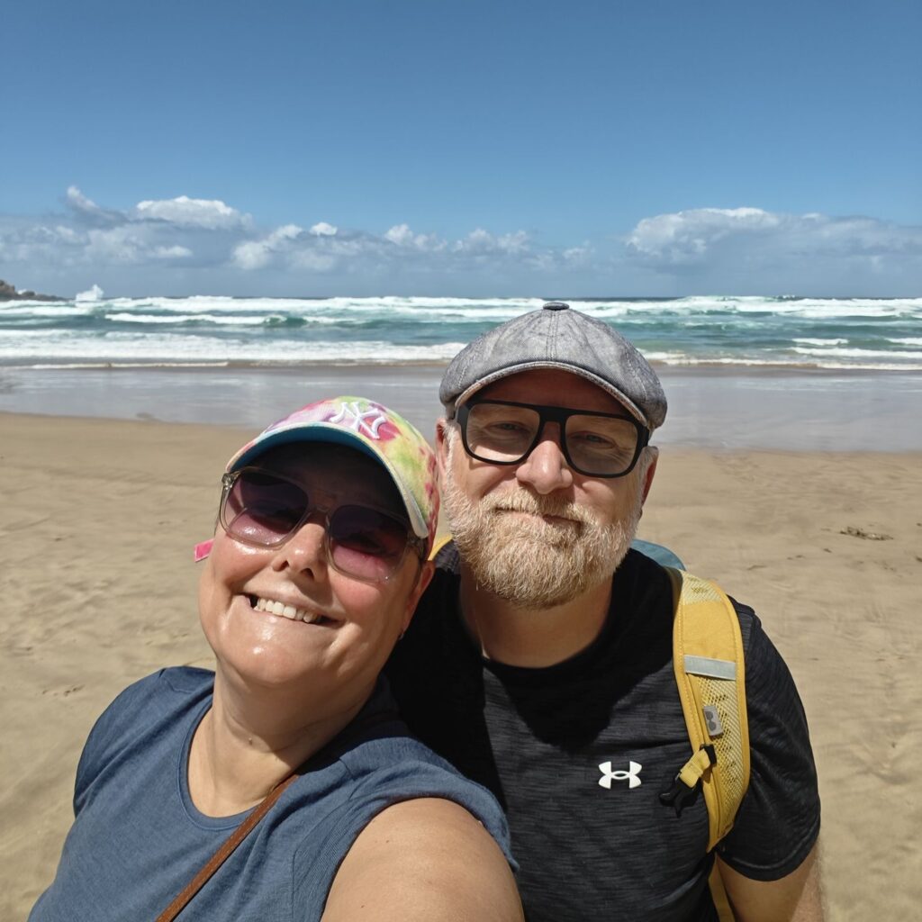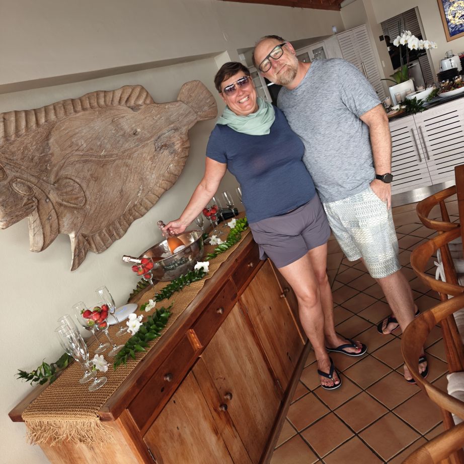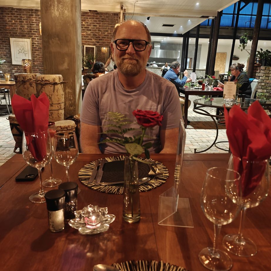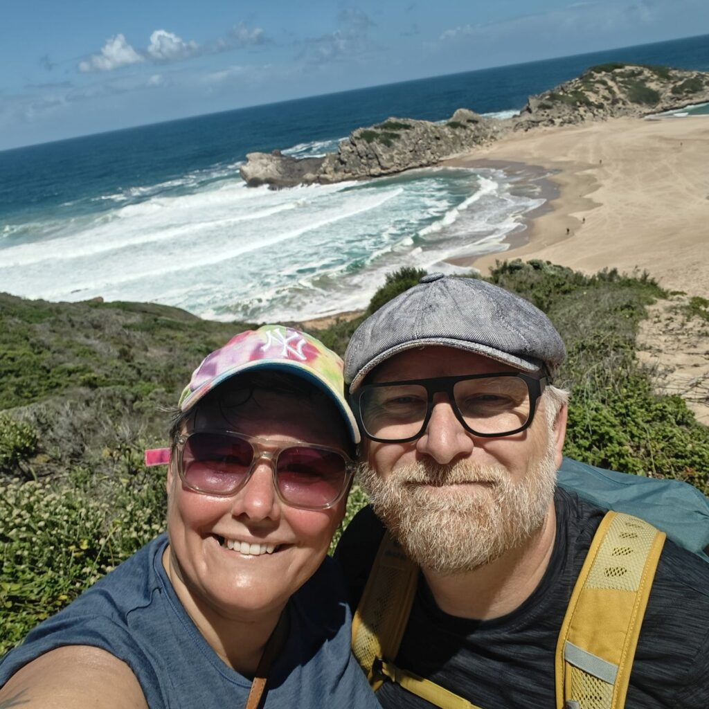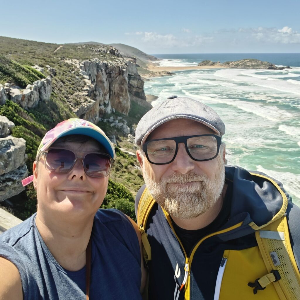 Der Chef unserer Unterkunft erinnert uns daran, dass heute Valentinstag ist. Er begrüßt uns mit zwei Gläsern Sekt und veranstaltet ein Fotoshooting mit uns für die Facebookseite der Periwinkle Lodge. Wir frühstücken noch einmal vorzüglich auf der Terrasse und checken aus. Christoph ist wieder fit. Unser erstes Ziel für heute ist gerade einmal sechs Kilometer entfernt. Wir parken am Parkplatz des Robberg Nature Reserve, wo Claudia bereits gestern mit Robben geschwommen ist.