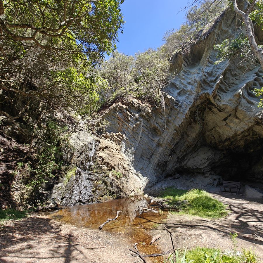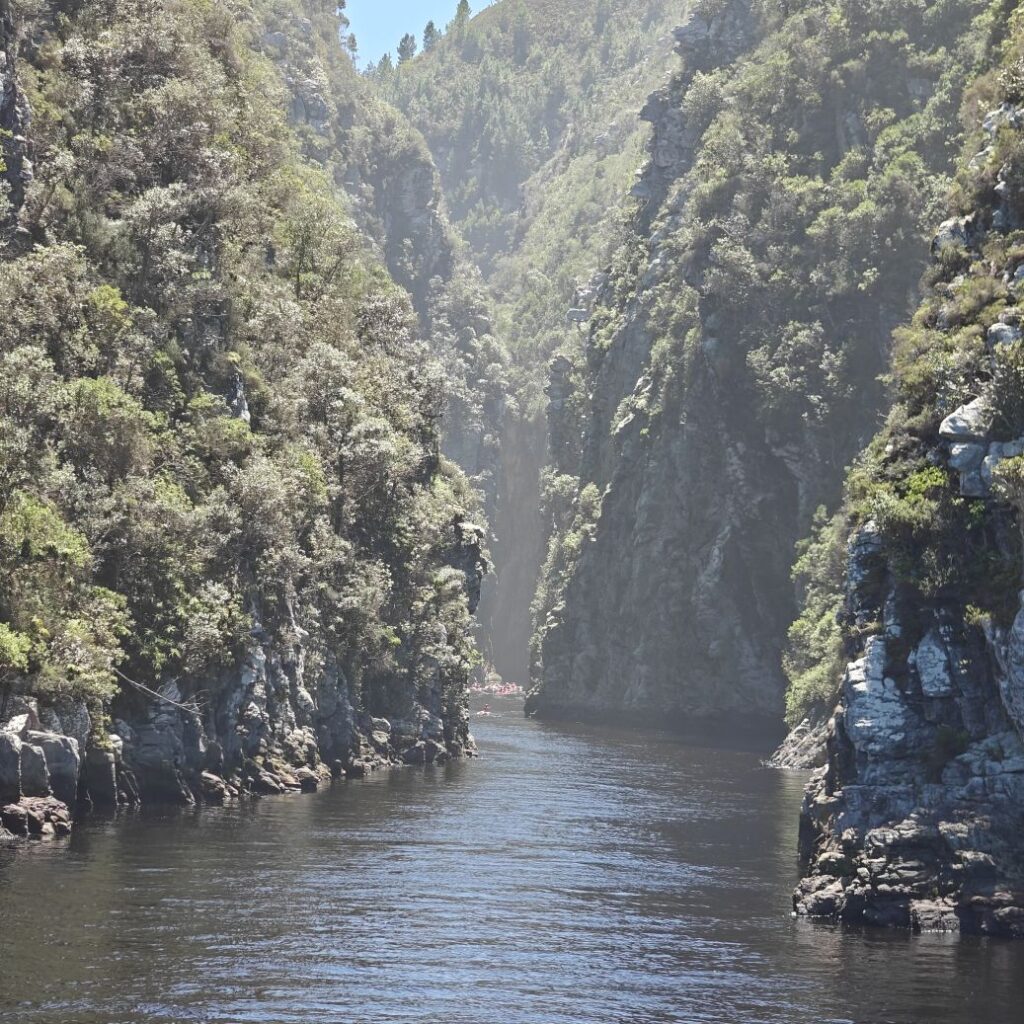 Der Mouth Trail startet neben dem Restaurant mit schöner Aussicht auf die Ostkap-Küste und führt auf einem kurvenreichen Spaziergang durch den Urwald zur Mündung des Storms Rivier. Diese überqueren wir auf einer 77 Meter langen Hängebrücke und können die Stormsriver Mouth Cave (Khoisan Heritage Site) sehen. Am Spirit of Tsitsikamma-Bootssteg kehren wir um.