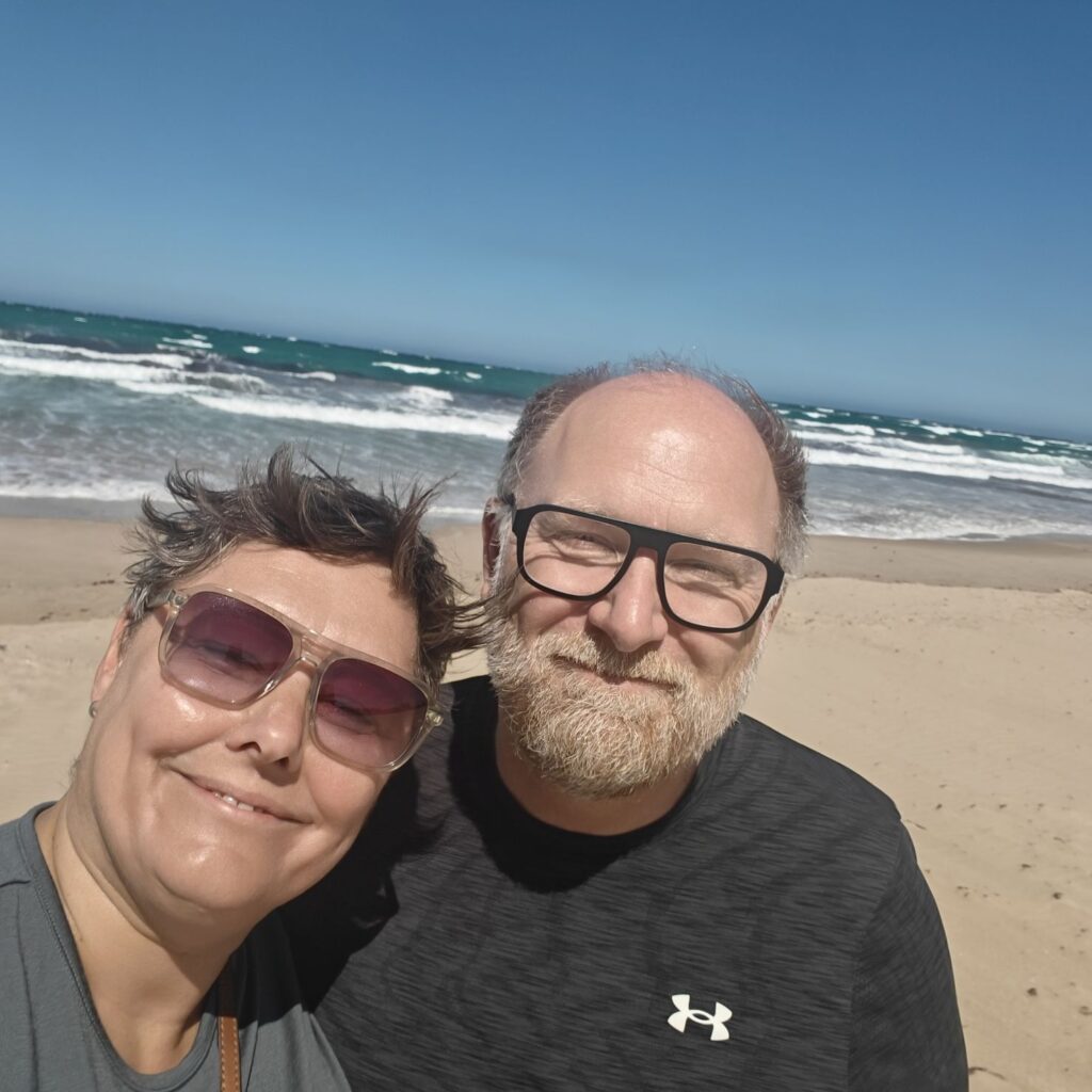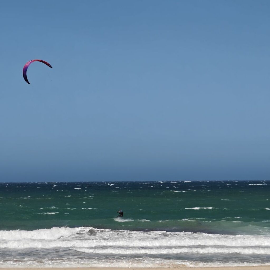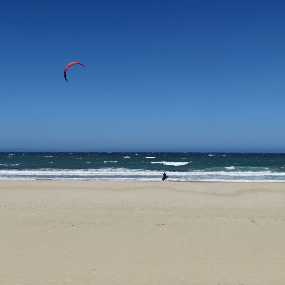 Es ist sehr windig, Surferinnen oder Surfer sind weit und breit keine zu sehen. Ein Kitesurfer bereitet sich gerade auf seinen Wellenritt vor, wir beobachten ihn, wie er sich nach unendlich langen Vorbereitungen in die Wellen stürzt.
