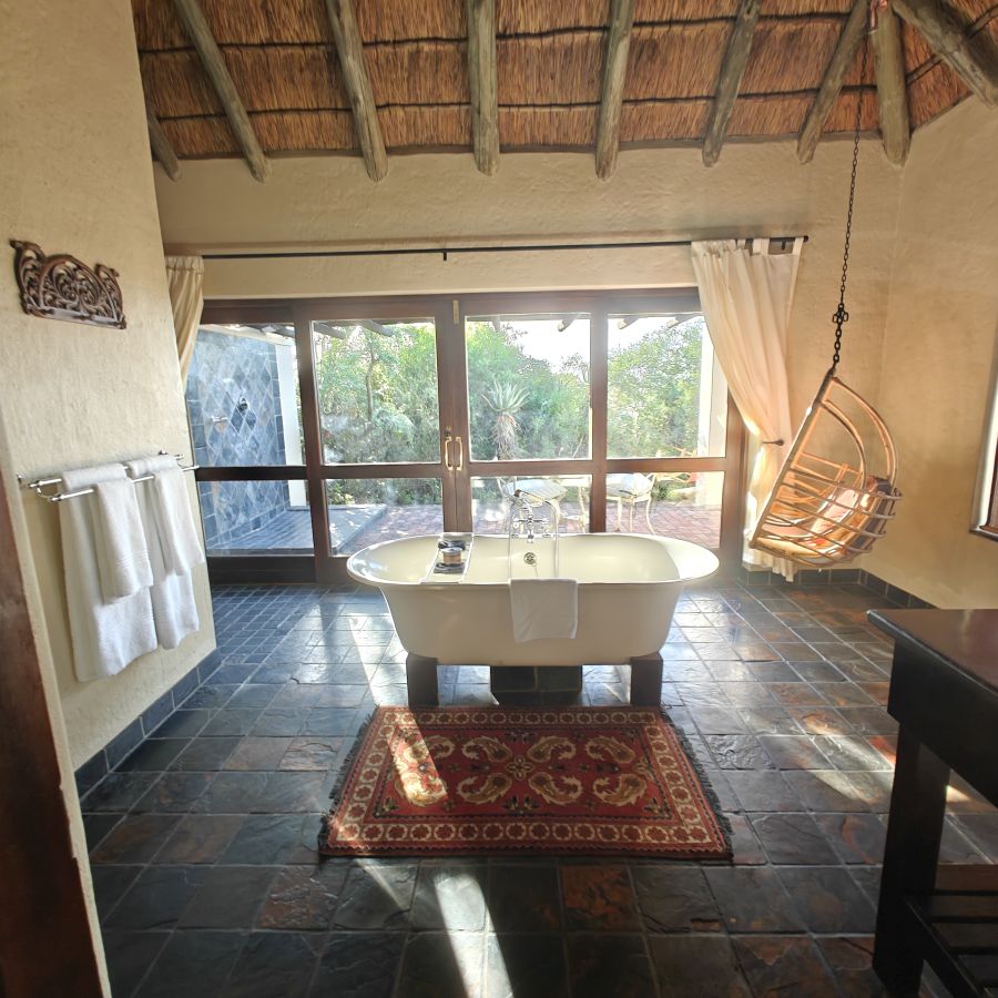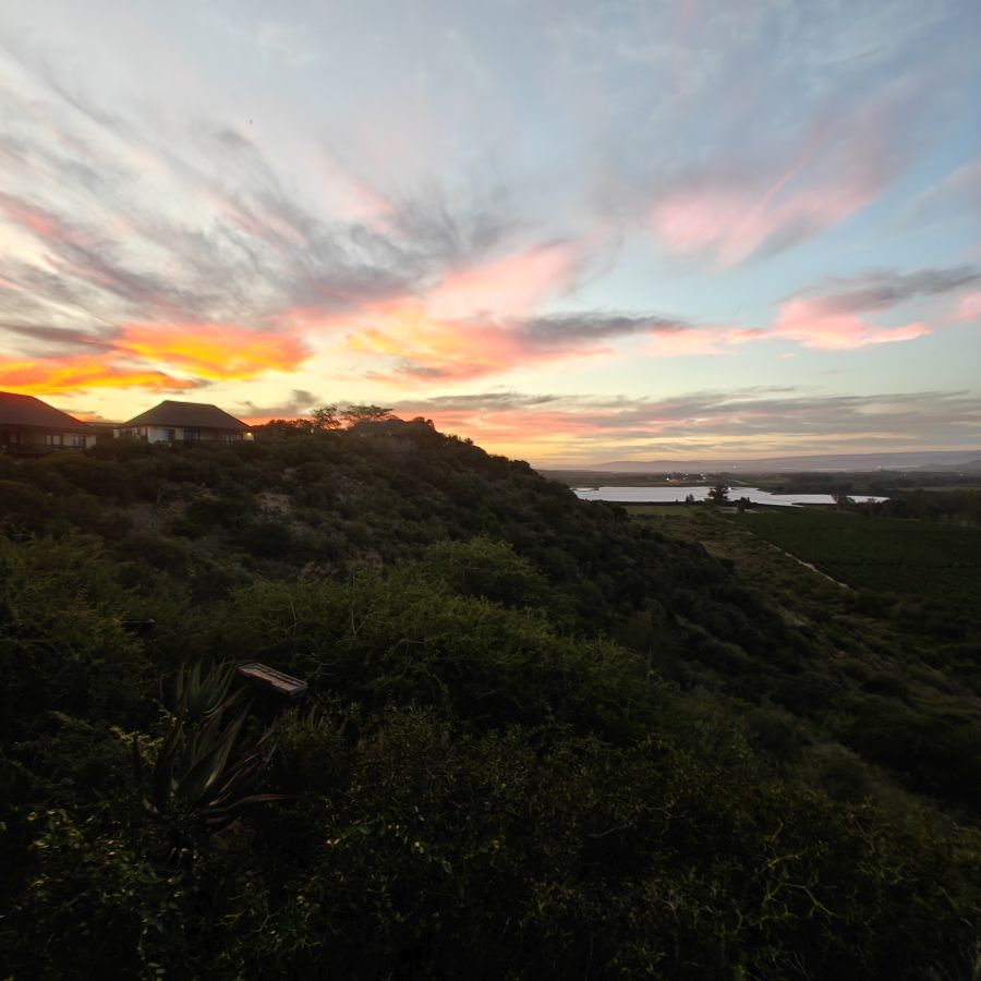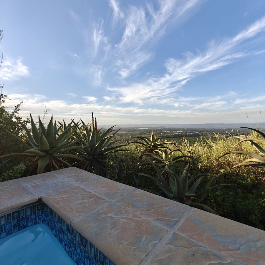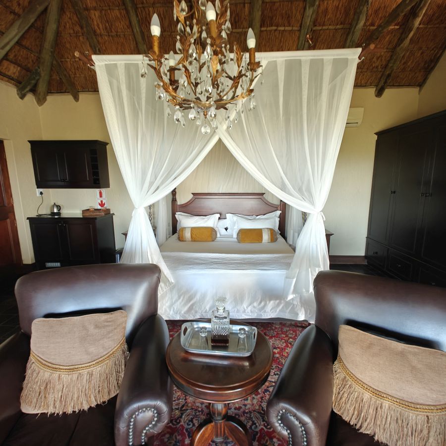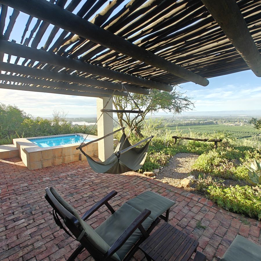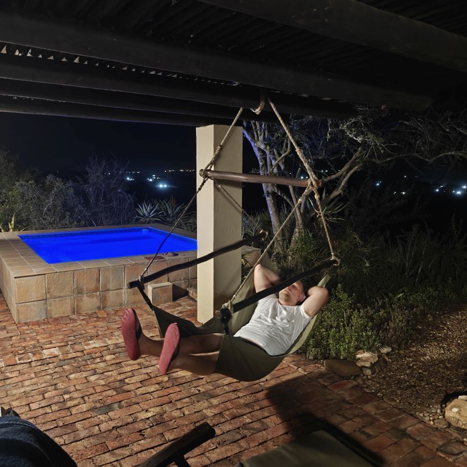 Wir fahren weiter zum östlichsten Punkt unserer Route Richtung Addo Elephant Nationalpark. Gebucht haben wir eine Unterkunft etwas außerhalb des Nationalparks. Die Hitgeheim Country Lodge liegt ruhig auf einer Anhöhe und ist nur über eine 22 Kilometer lange Schotterpiste zu erreichen. Die Anlage ist riesengroß, dabei hat sie nur 16 Zimmer. Unser Superior De Lux Room ist geräumig und hat einen privaten Pool. Wir haben vor dem Abendessen noch kurz Zeit, uns im kühlen Wasser abzukühlen. Am Abend essen wir nach einem Sundowner auf der Terrasse im exzellenten hauseigenen Restaurant.