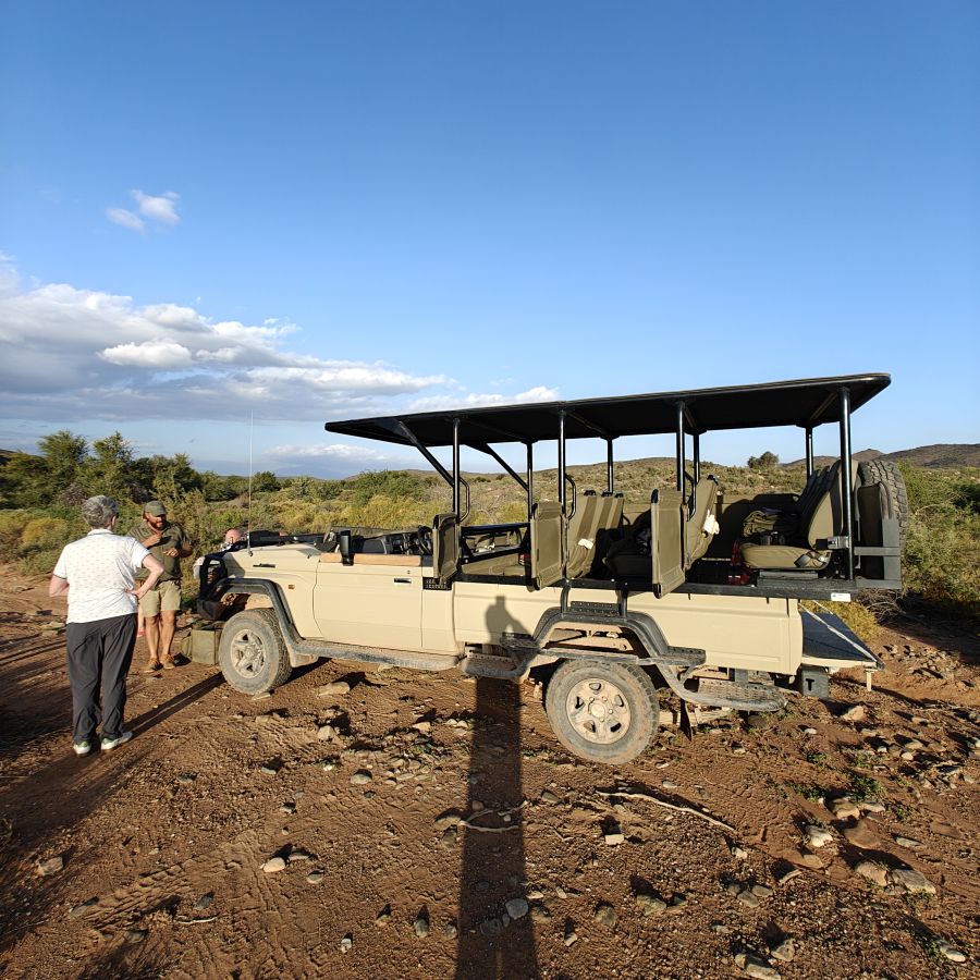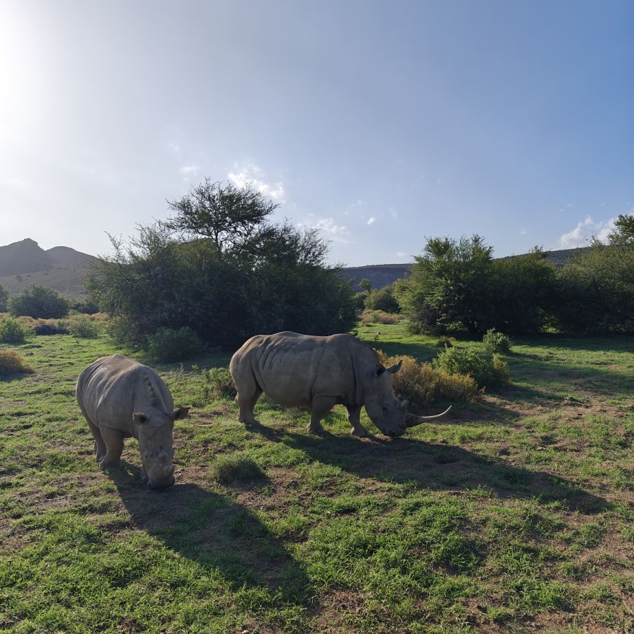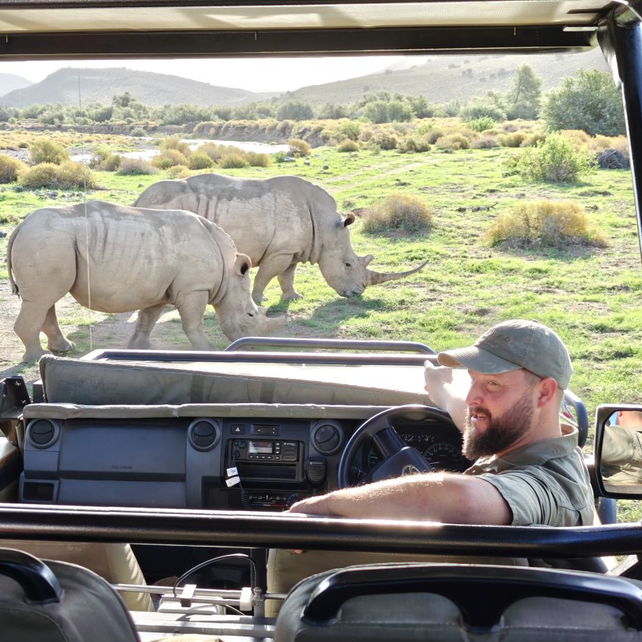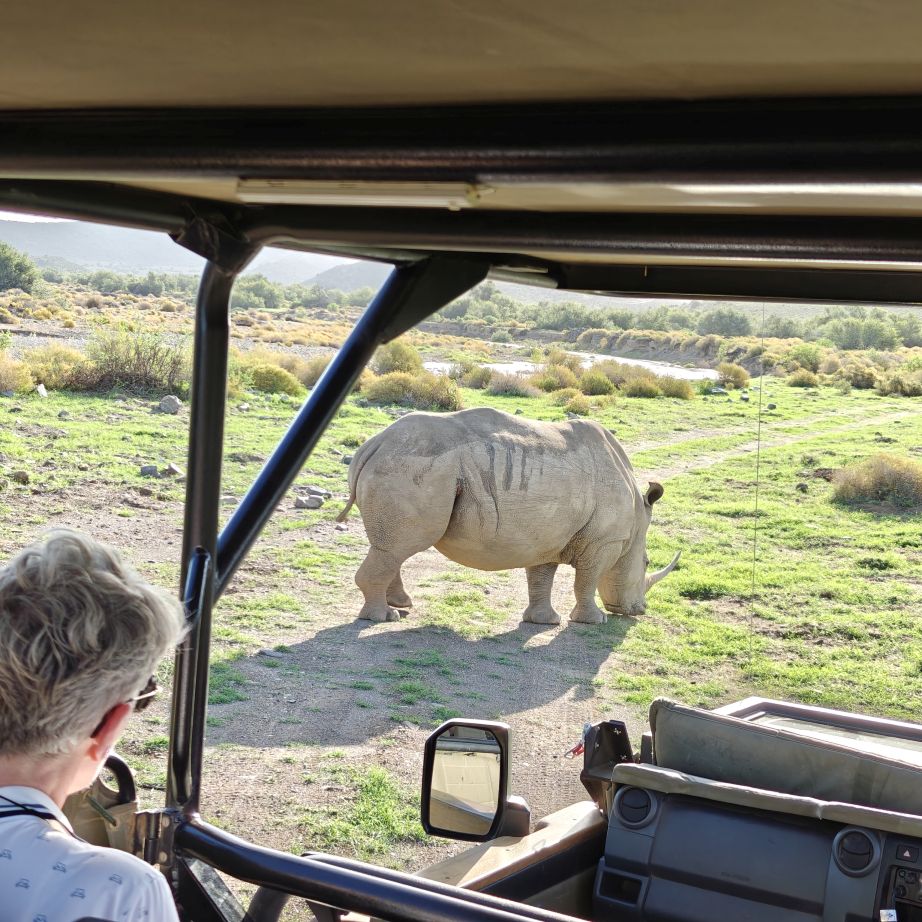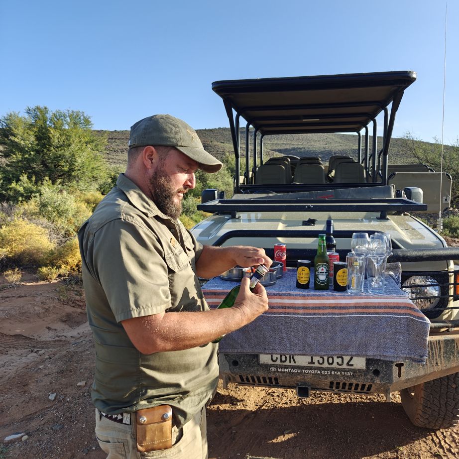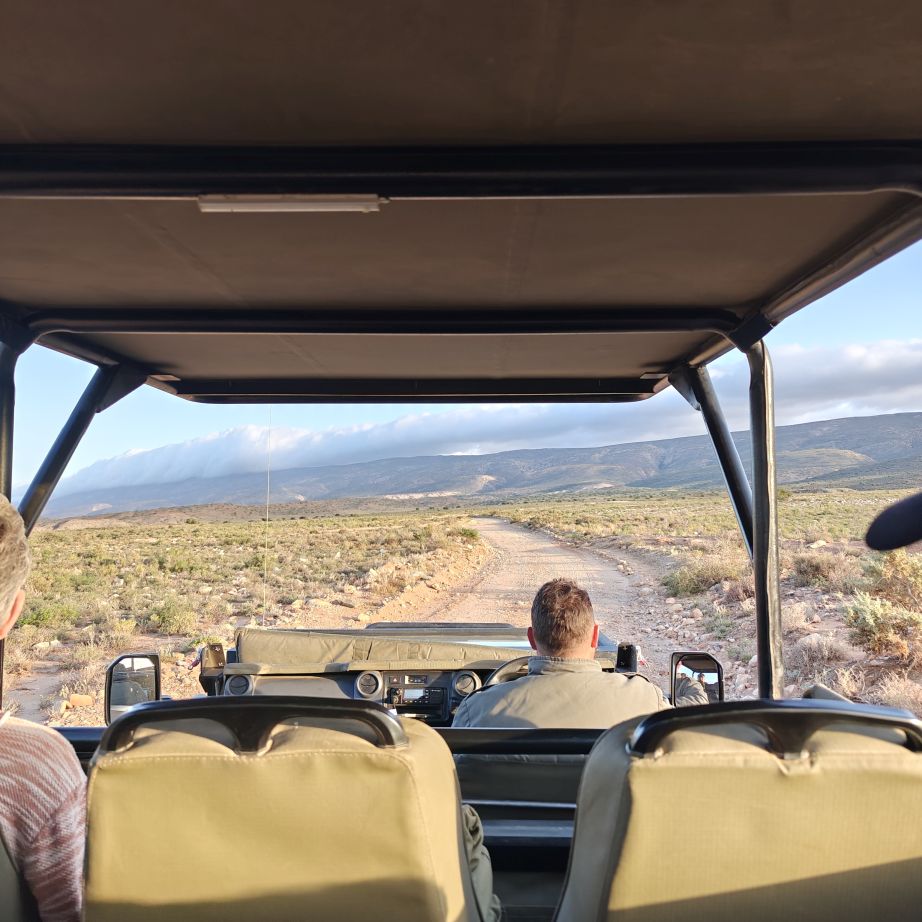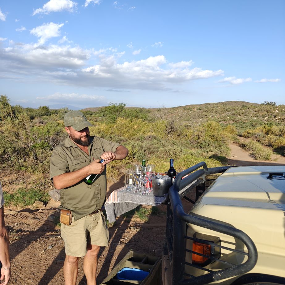 Wir starten mit einem Mittagessen – es gibt kapmalaisches Bobotie. Anschließend relaxen wir am Infinity-Pool. Am späten Nachmittag brechen wir zu unserer ersten Safari auf. Unser Guide Jordan fährt uns mit einem komfortablen Safariauto über holprige Pisten durch das Reservat. Wir sehen zwei Rhinozerosse, einen Schakal, verschiedene Antilopenarten, eine Schildkröte und eine Journey Giraffen. Ganz in der Nähe dieser anmutigen Tiere machen wir halt für einen Sundowner. Mit uns unterwegs sind eine Amerikanerin und ein Paar aus Frankreich.