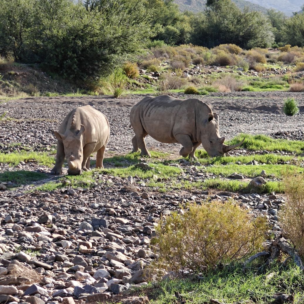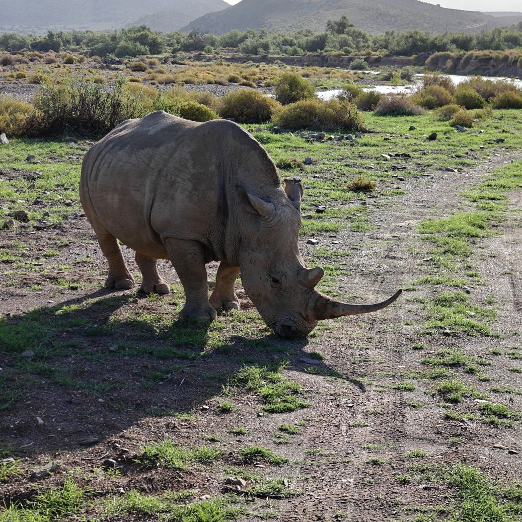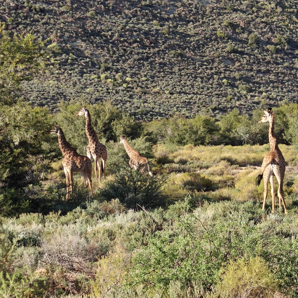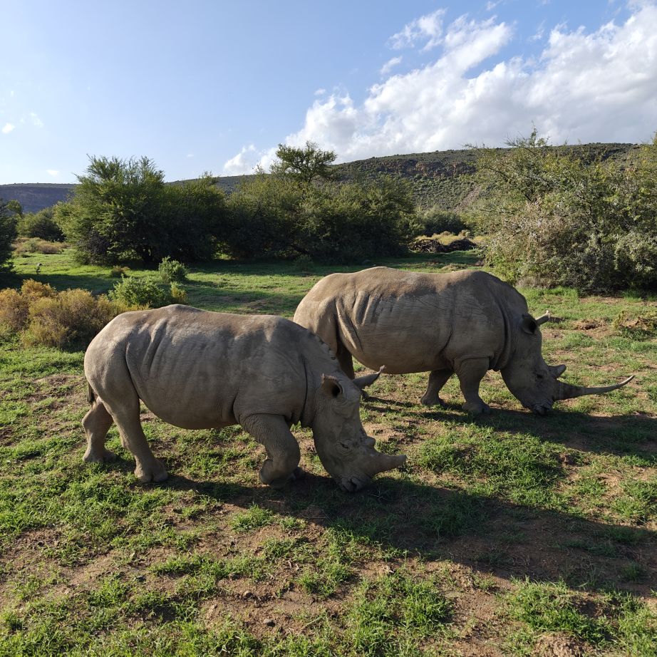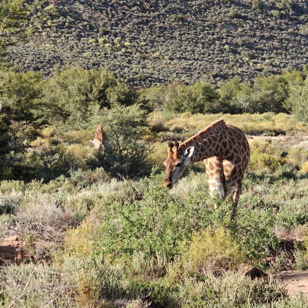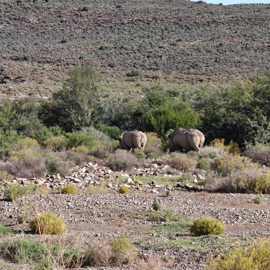 Wir starten mit einem Mittagessen – es gibt kapmalaisches Bobotie. Anschließend relaxen wir am Infinity-Pool. Am späten Nachmittag brechen wir zu unserer ersten Safari auf. Unser Guide Jordan fährt uns mit einem komfortablen Safariauto über holprige Pisten durch das Reservat. Wir sehen zwei Rhinozerosse, einen Schakal, verschiedene Antilopenarten, eine Schildkröte und eine Journey Giraffen. Ganz in der Nähe dieser anmutigen Tiere machen wir halt für einen Sundowner. Mit uns unterwegs sind eine Amerikanerin und ein Paar aus Frankreich.