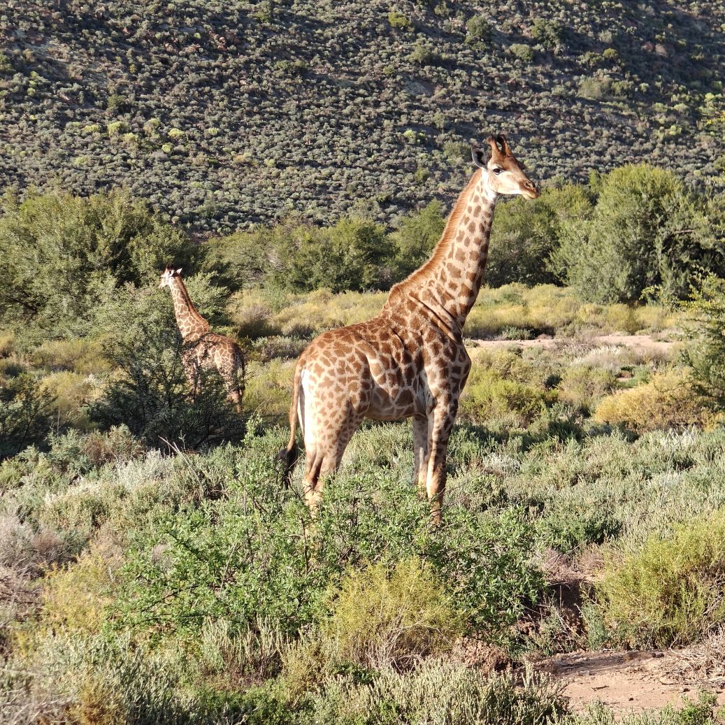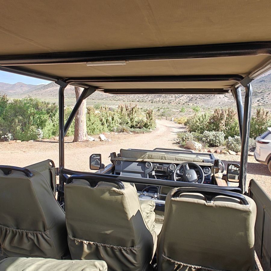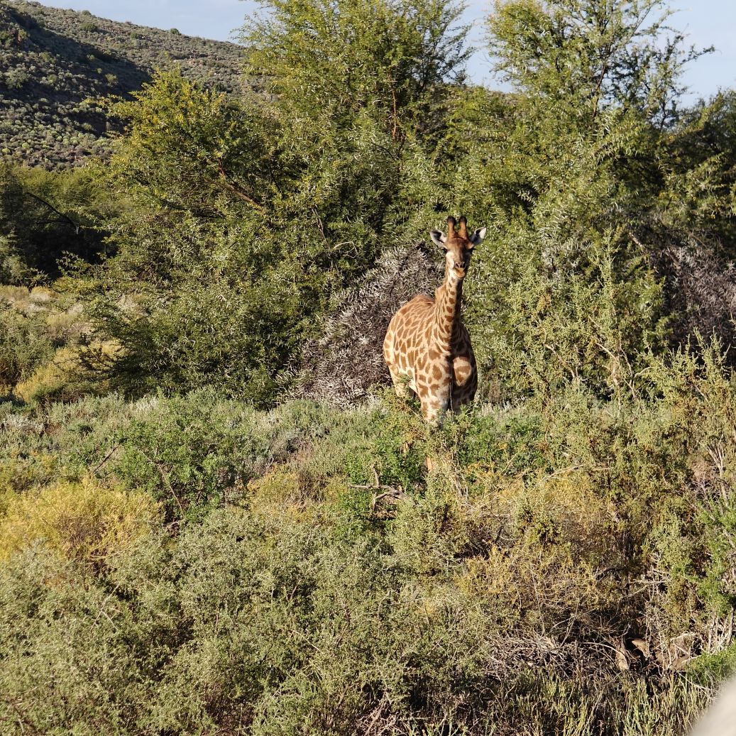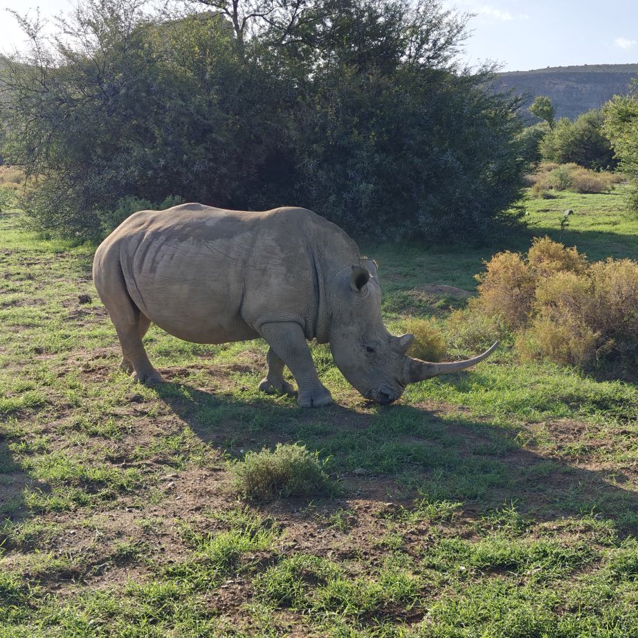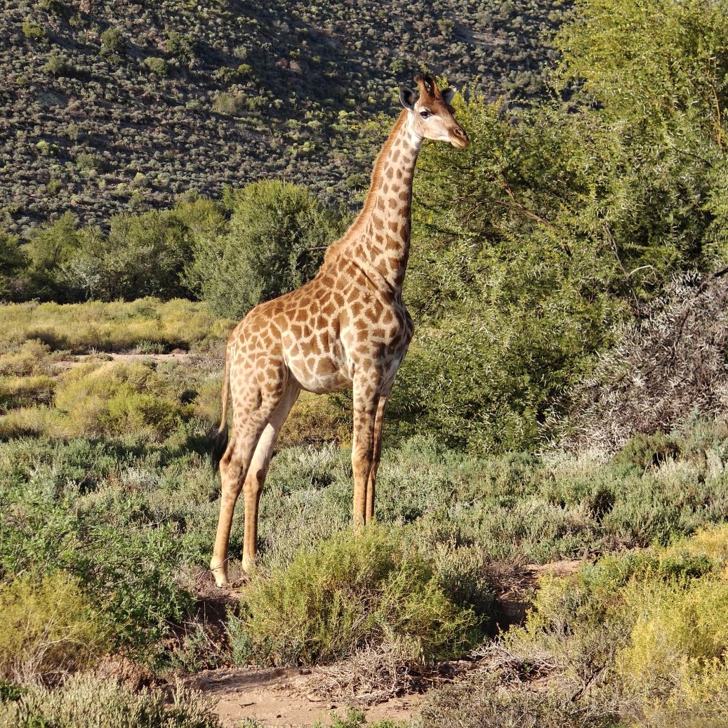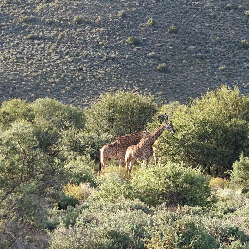 Wir starten mit einem Mittagessen – es gibt kapmalaisches Bobotie. Anschließend relaxen wir am Infinity-Pool. Am späten Nachmittag brechen wir zu unserer ersten Safari auf. Unser Guide Jordan fährt uns mit einem komfortablen Safariauto über holprige Pisten durch das Reservat. Wir sehen zwei Rhinozerosse, einen Schakal, verschiedene Antilopenarten, eine Schildkröte und eine Journey Giraffen. Ganz in der Nähe dieser anmutigen Tiere machen wir halt für einen Sundowner. Mit uns unterwegs sind eine Amerikanerin und ein Paar aus Frankreich.