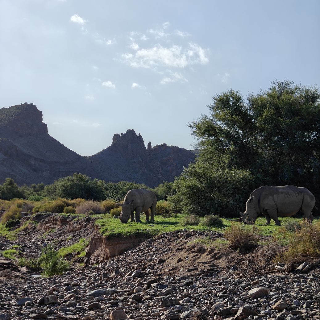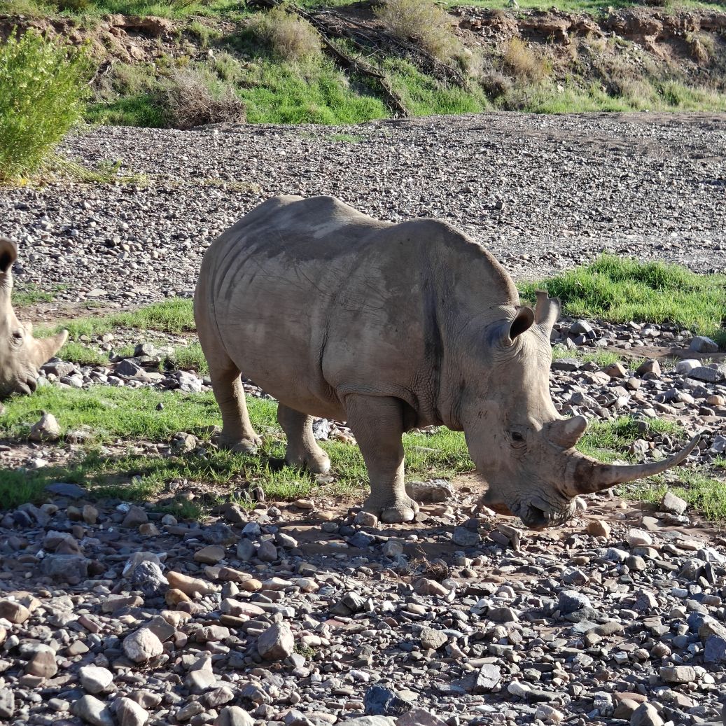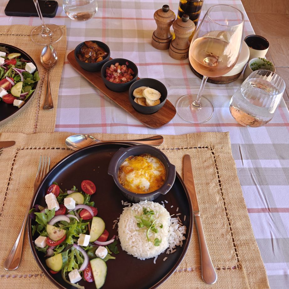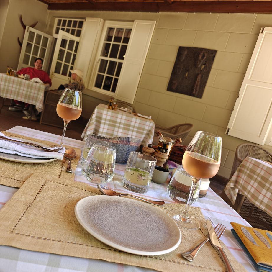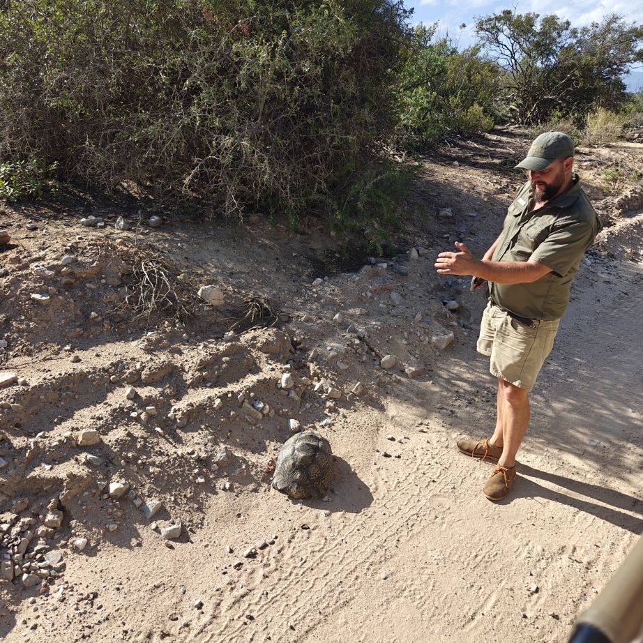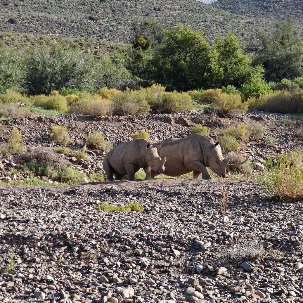 Wir starten mit einem Mittagessen – es gibt kapmalaisches Bobotie. Anschließend relaxen wir am Infinity-Pool. Am späten Nachmittag brechen wir zu unserer ersten Safari auf. Unser Guide Jordan fährt uns mit einem komfortablen Safariauto über holprige Pisten durch das Reservat. Wir sehen zwei Rhinozerosse, einen Schakal, verschiedene Antilopenarten, eine Schildkröte und eine Journey Giraffen. Ganz in der Nähe dieser anmutigen Tiere machen wir halt für einen Sundowner. Mit uns unterwegs sind eine Amerikanerin und ein Paar aus Frankreich.