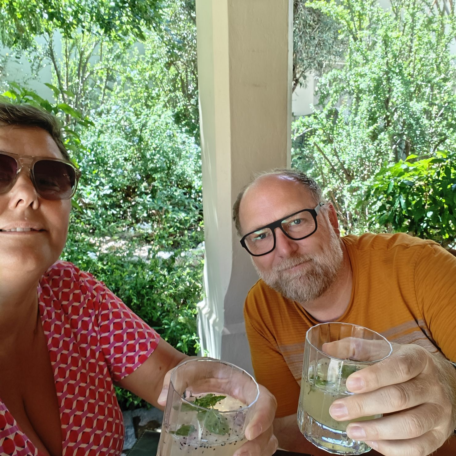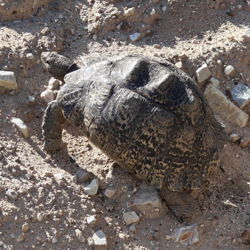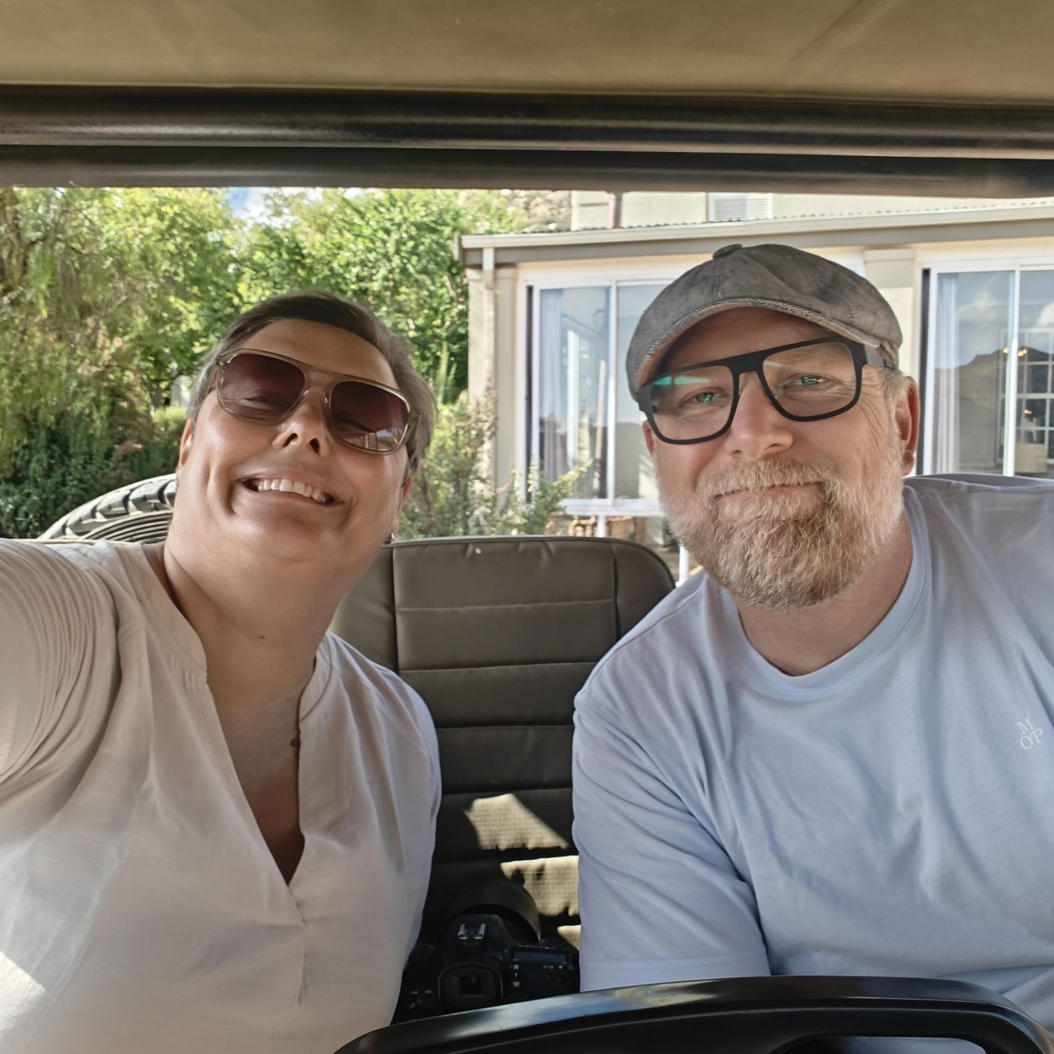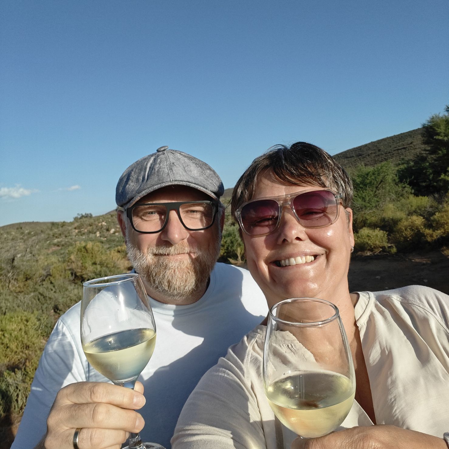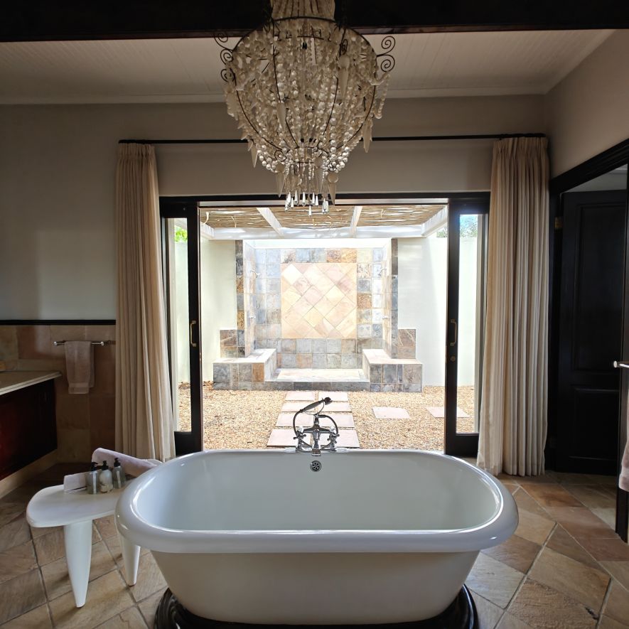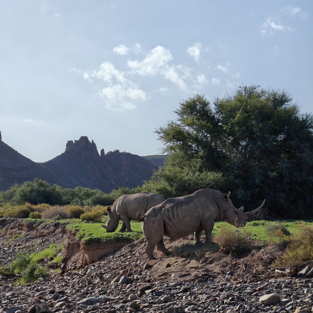 Wir starten mit einem Mittagessen – es gibt kapmalaisches Bobotie. Anschließend relaxen wir am Infinity-Pool. Am späten Nachmittag brechen wir zu unserer ersten Safari auf. Unser Guide Jordan fährt uns mit einem komfortablen Safariauto über holprige Pisten durch das Reservat. Wir sehen zwei Rhinozerosse, einen Schakal, verschiedene Antilopenarten, eine Schildkröte und eine Journey Giraffen. Ganz in der Nähe dieser anmutigen Tiere machen wir halt für einen Sundowner. Mit uns unterwegs sind eine Amerikanerin und ein Paar aus Frankreich.