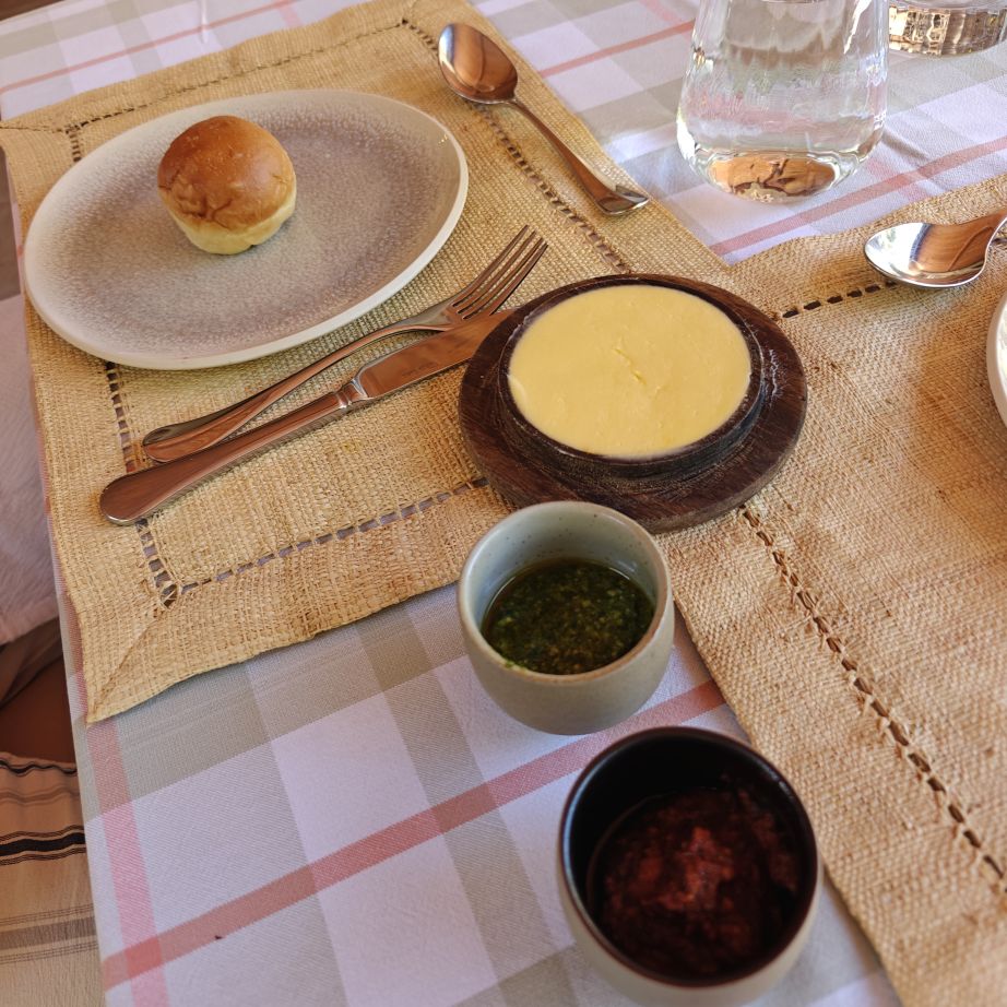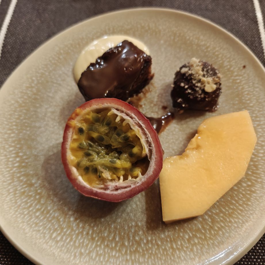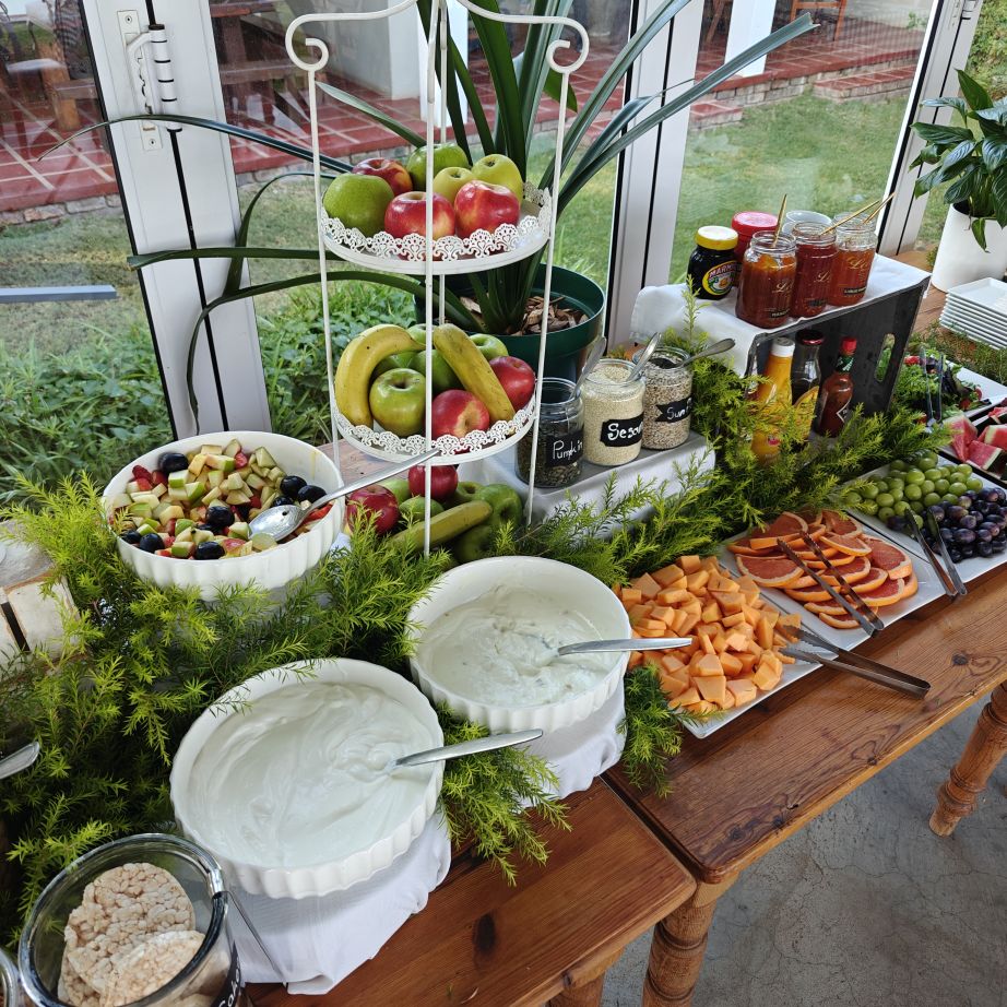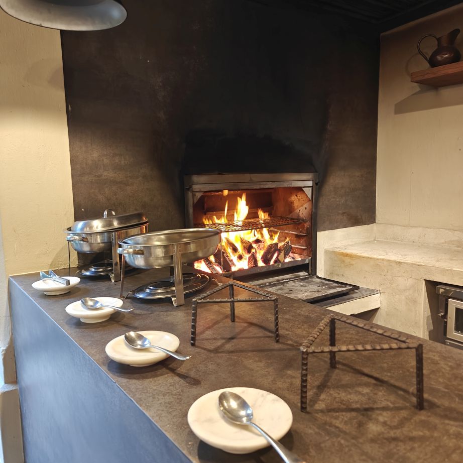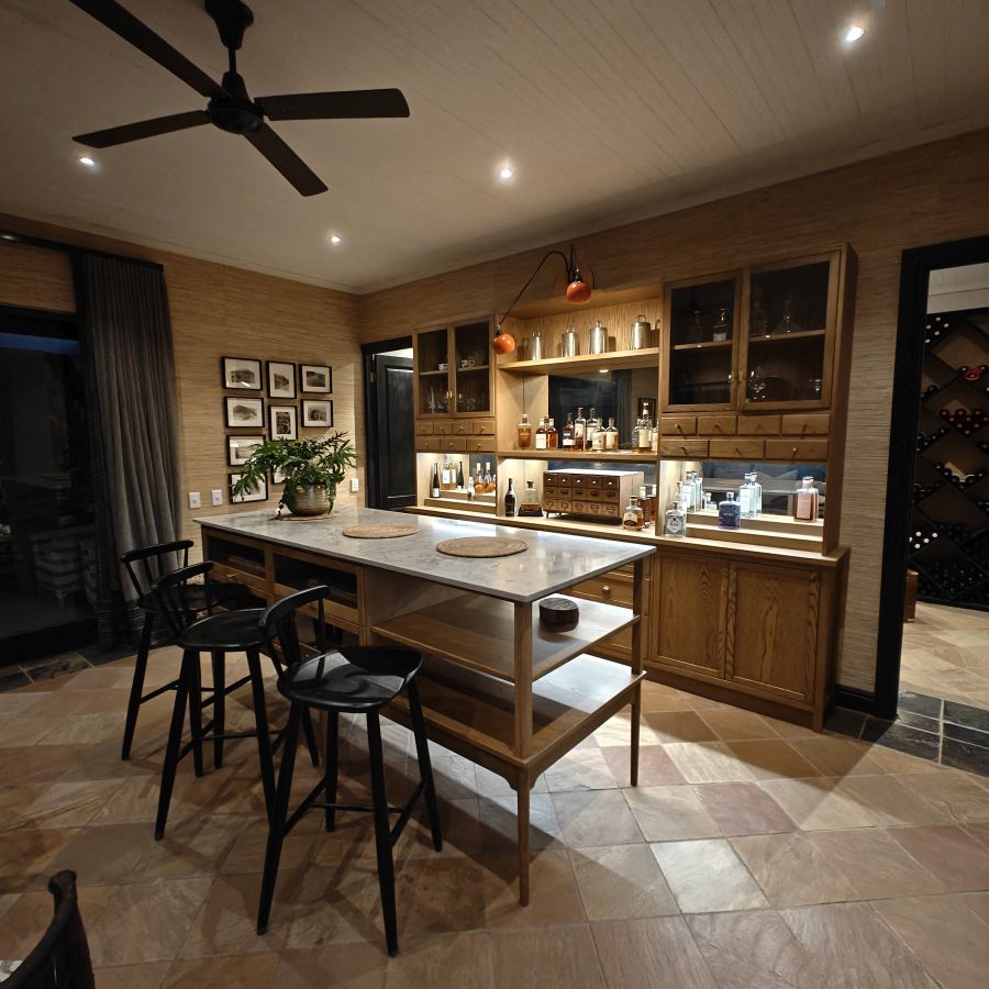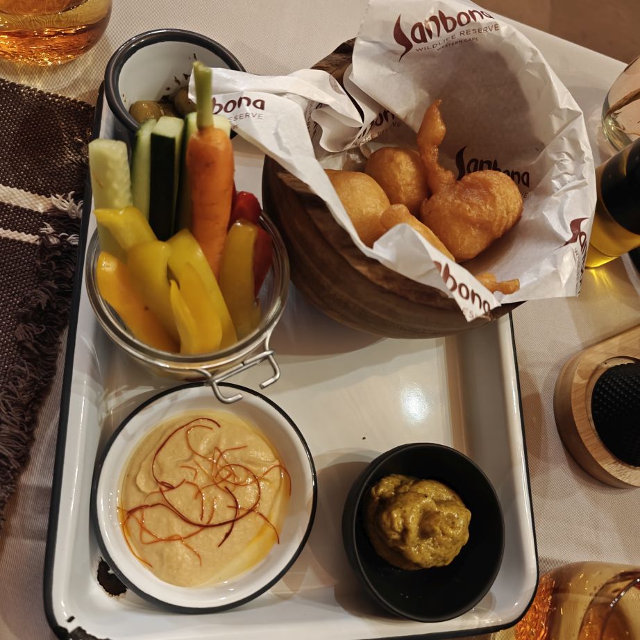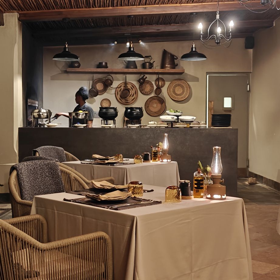Wir starten mit einem Mittagessen – es gibt kapmalaisches Bobotie. Anschließend relaxen wir am Infinity-Pool. Am späten Nachmittag brechen wir zu unserer ersten Safari auf. Unser Guide Jordan fährt uns mit einem komfortablen Safariauto über holprige Pisten durch das Reservat. Wir sehen zwei Rhinozerosse, einen Schakal, verschiedene Antilopenarten, eine Schildkröte und eine Journey Giraffen. Ganz in der Nähe dieser anmutigen Tiere machen wir halt für einen Sundowner. Mit uns unterwegs sind eine Amerikanerin und ein Paar aus Frankreich.