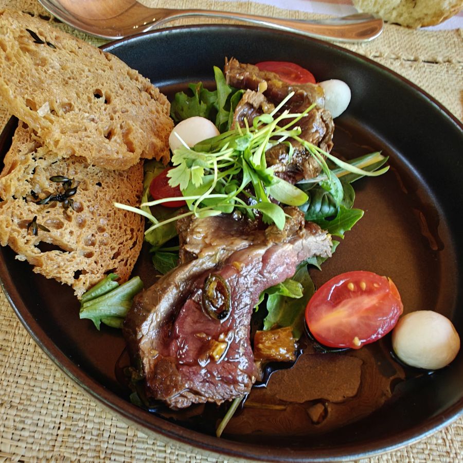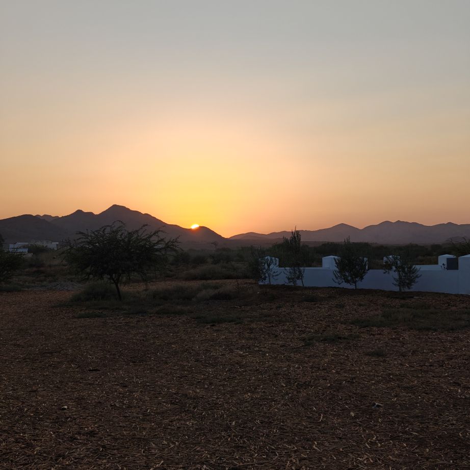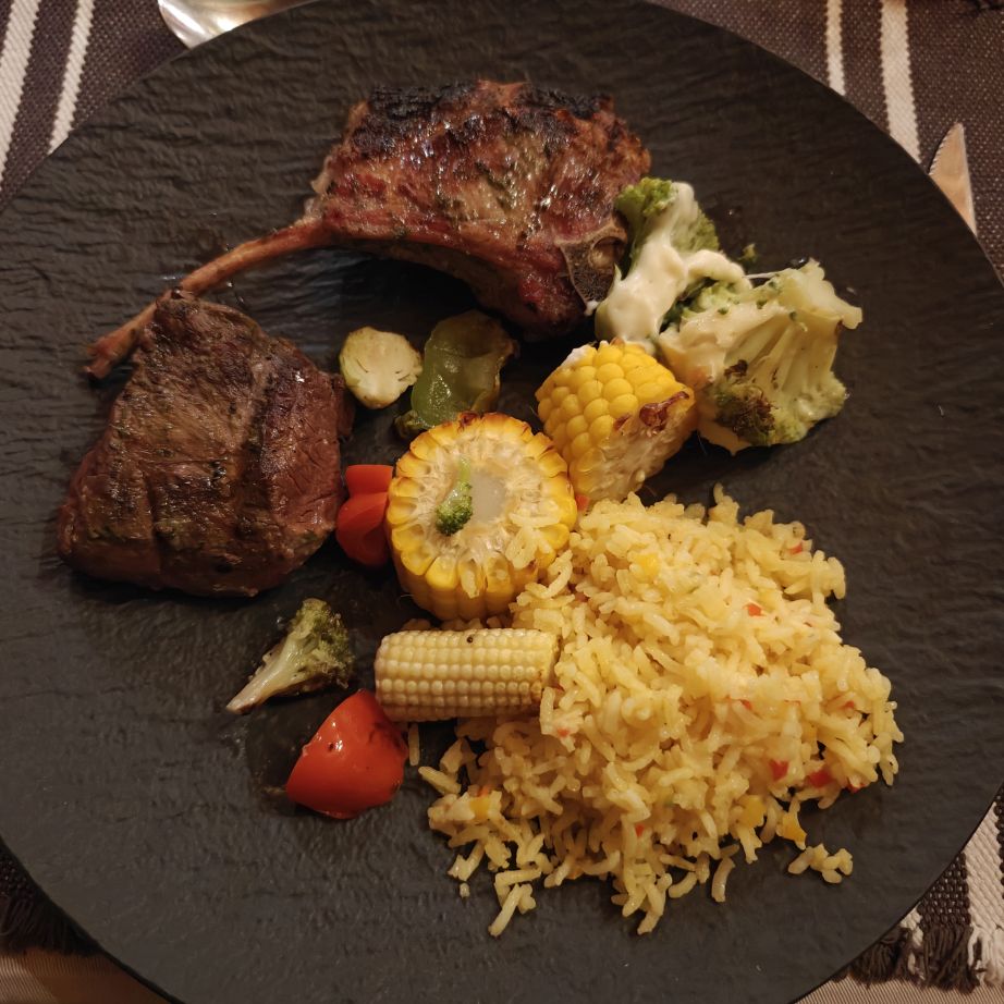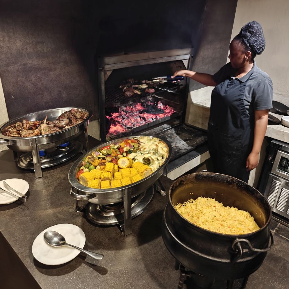 Zurück in der Lodge machen wir uns frisch für das Abendessen. Heute steht ein Braai-Abend auf dem Programm. Kudu und Lamm vom Holzkohlegrill schmecken köstlich. Dazu gibt es Reis und Salat. Dann gehen wir schlafen, denn unsere zweite Safarifahrt wird morgen in aller Frühe stattfinden.