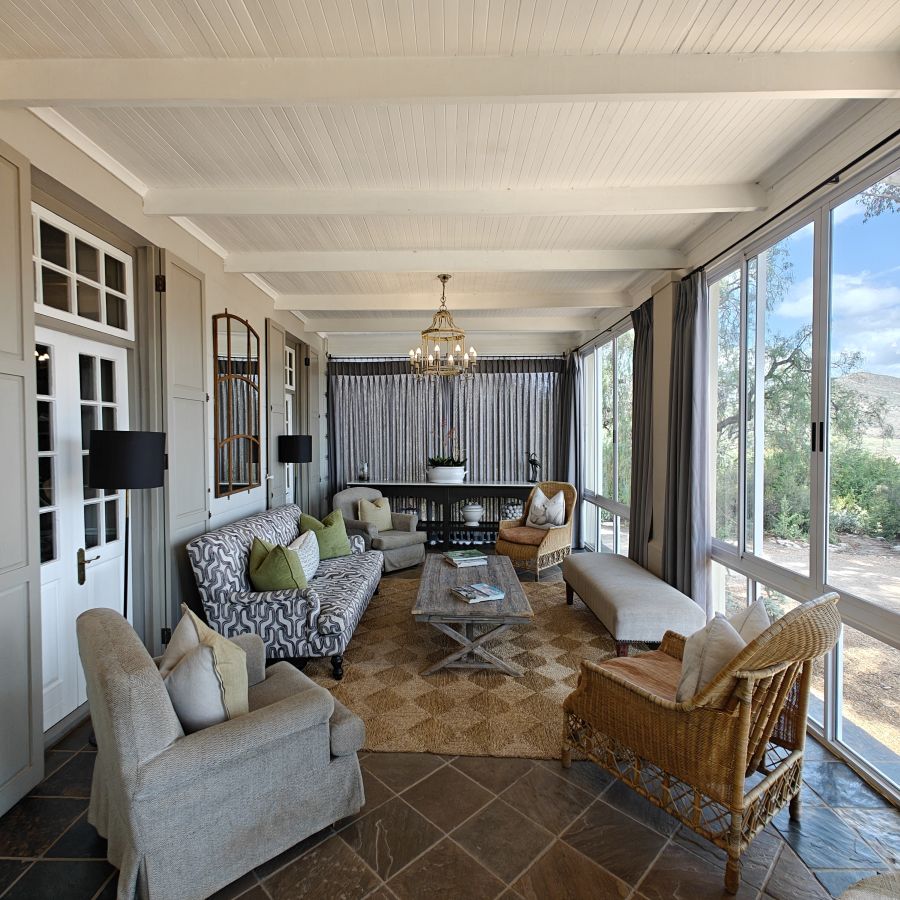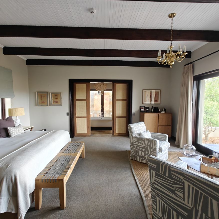 Es liegt am Fuße der Warmwaterberg Mountain Range im Herzen der kleinen Karoo und ist eines der wenigen Reservate weltweit, das weiße Löwen in freier Wildbahn beheimatet. Wir erreichen das Gate über eine Schotterpiste, danach liegen weitere 20 Minuten Fahrt auf der holprigen Straße zur Welcome Lounge vor uns. Eigentlich hatten wir geplant, uns von dort aus zur Unterkunft shutteln zu lassen. Da wir früh dran sind und auf die anderen Gäste warten müssten, bekommen wir die Erlaubnis, selbst zu fahren. Noch einmal 30 Minuten Schotterpiste später sind wir in Tilney Manor angelangt, ein Paradies mit sechs Zimmern mitten in der Wildnis. Es ist eine der drei Luxus-Lodges der im Sanbona Reserve. Das Reservat selbst befindet sich in Besitz einer Non-Profit-Organisation, die sich dem Erhalt des Reservats und dem Naturschutz verschrieben hat. Die Lodges befinden sich in Privatbesitz. Die Anlage ist unglaubliche 62 000 Hektar groß und beheimatet die „Big Five“.