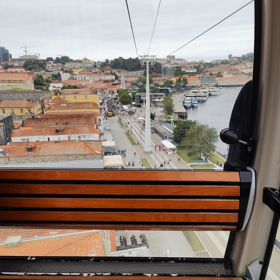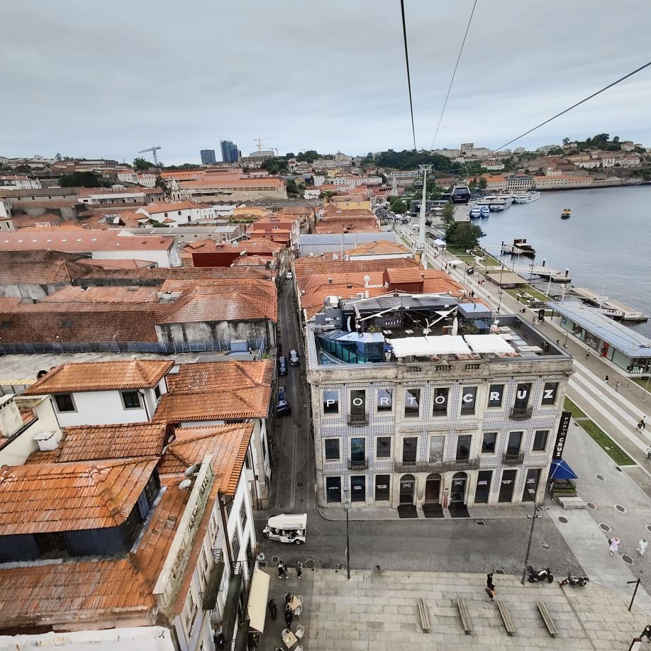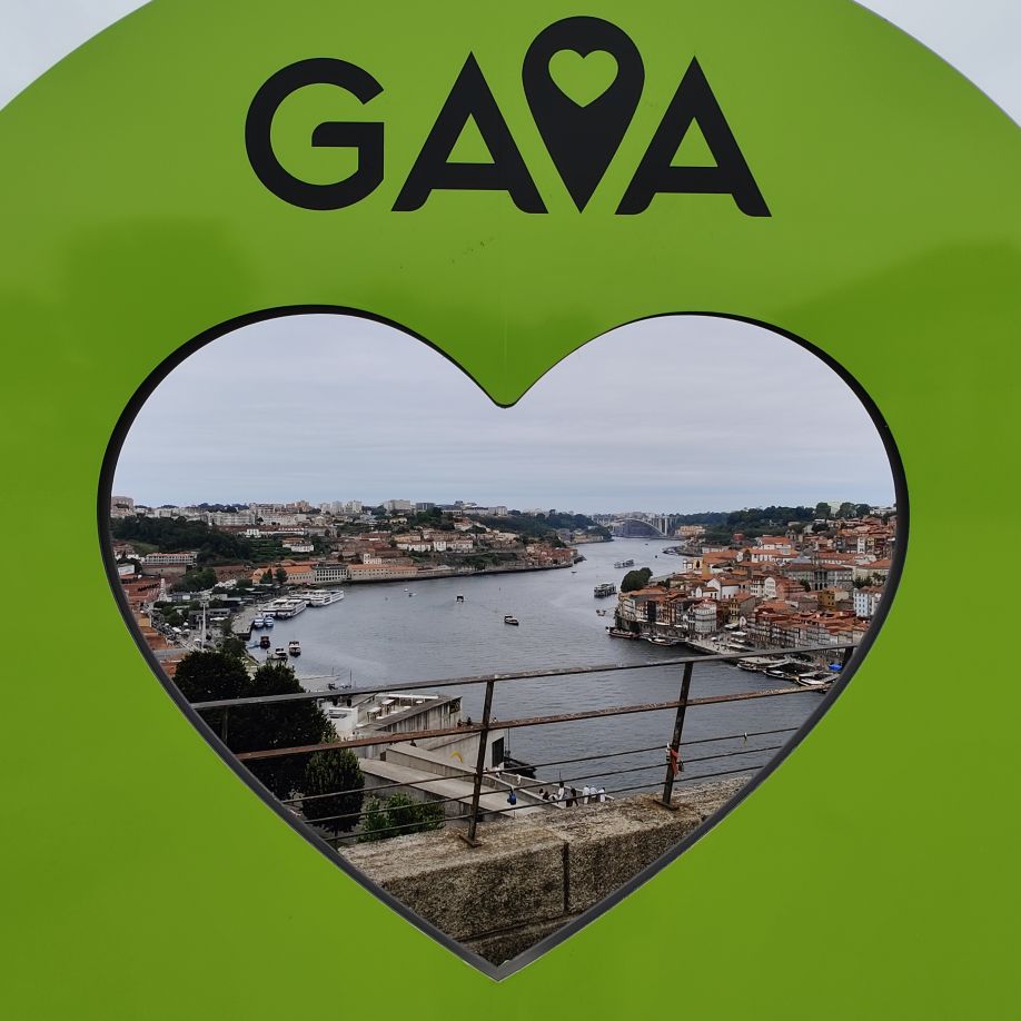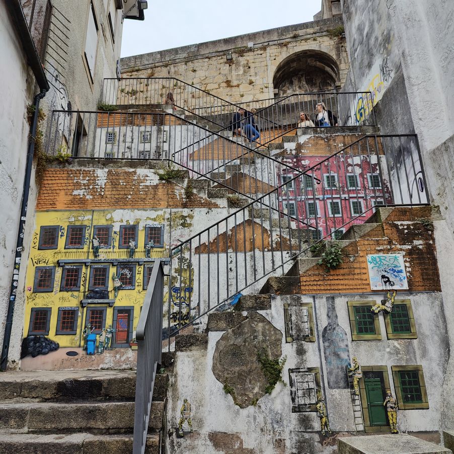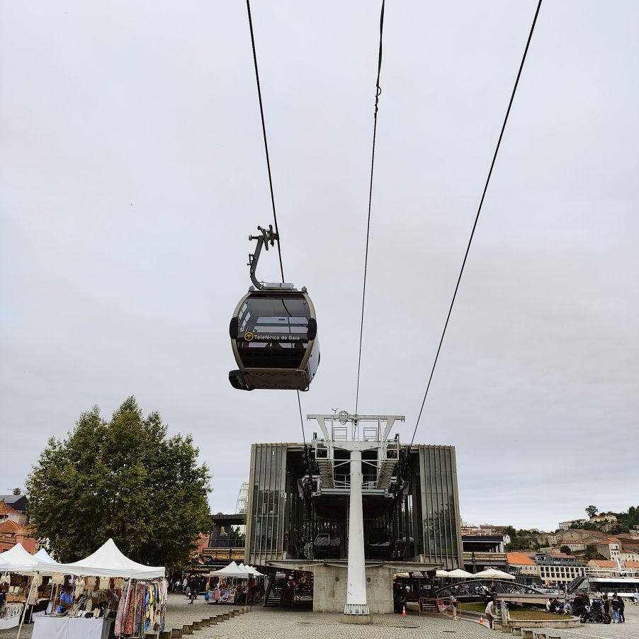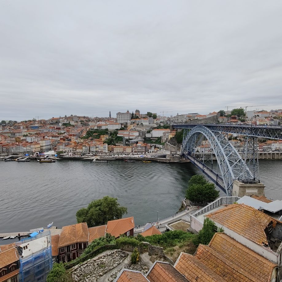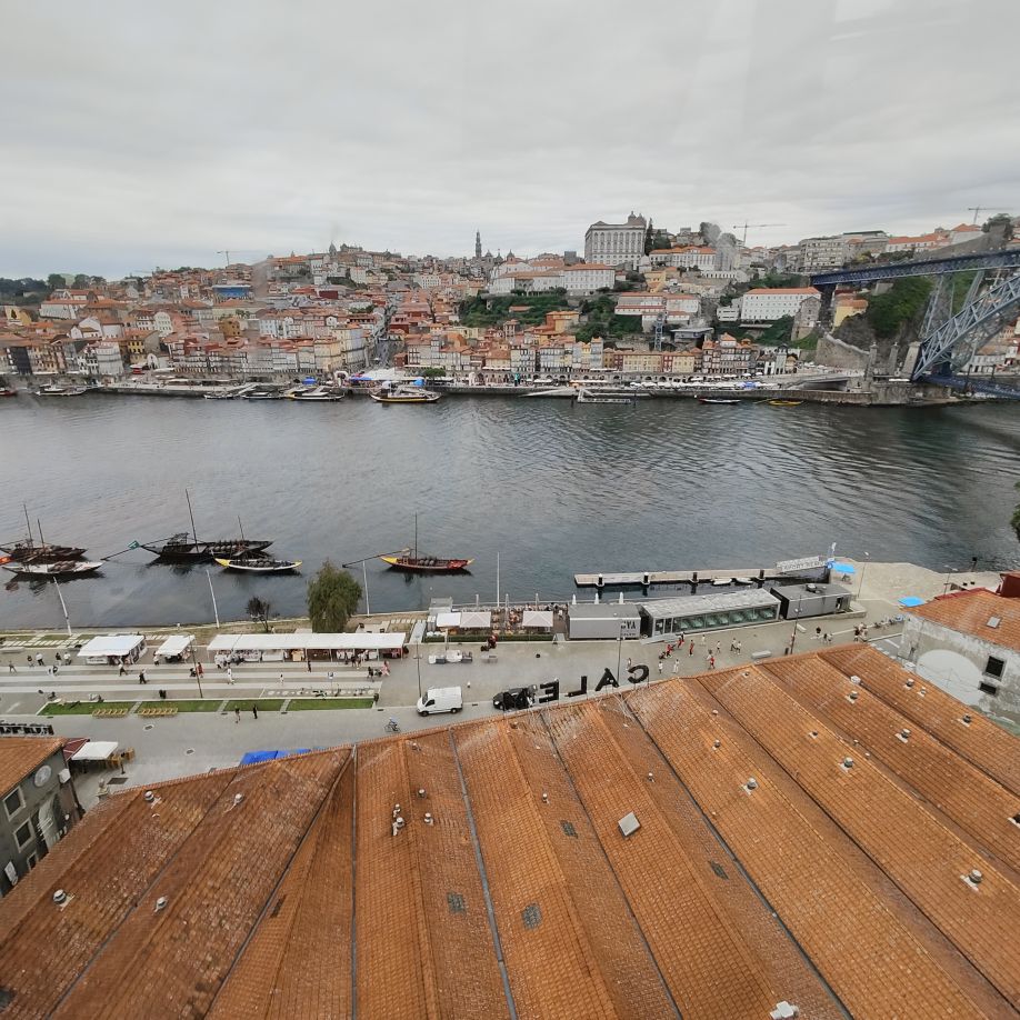 Am späten Vormittag spazieren wir Richtung Talstation der Teleférico de Gaia mit einem Abstecher zum „Half Rabbit“, einer StreetArt-Installation aus Schrott, das vom richtigen Blickwinkel aus wie ein überdimensionaler Hase aussieht. Dann fahren wir mit der Gondel zur Bergstation beim Jardim de Morro. Der Himmel ist wolkenverhangen, was gerade richtig für unseren Ausflug ist, aber nicht für den Ausblick. Wir gehen zum höchsten Aussichtspunkt, zum Kloster Serra do Pilar, von dem wir gut auf die Brücke und Porto sehen und ebenso die Dächer der Portweinkeller in Vila Nova im Blick haben. Das Kloster kann derzeit wegen Renovierungsarbeiten nicht besichtigt werden. So suchen wir uns den kürzesten Weg hinunter zum Cais de Gaia und spazieren entlang der Cafés, Portweinkeller und Straßenstände zum Restaurant Ar de Rio, wo wir einen kleinen Mittagssnack zu uns nehmen.