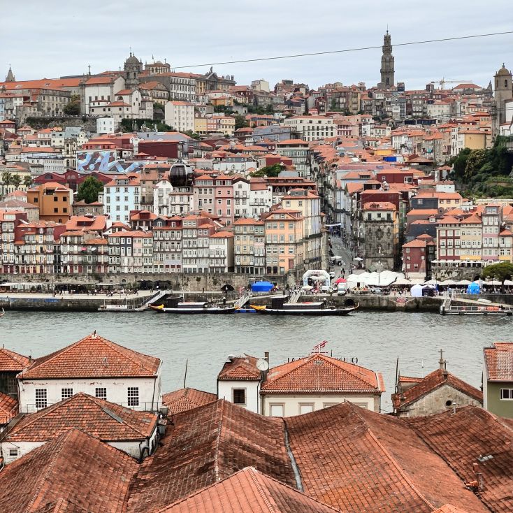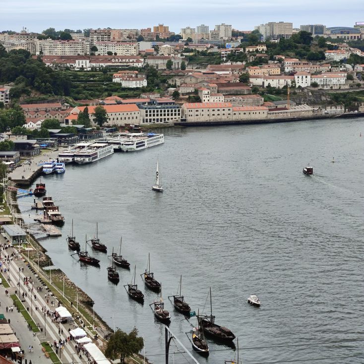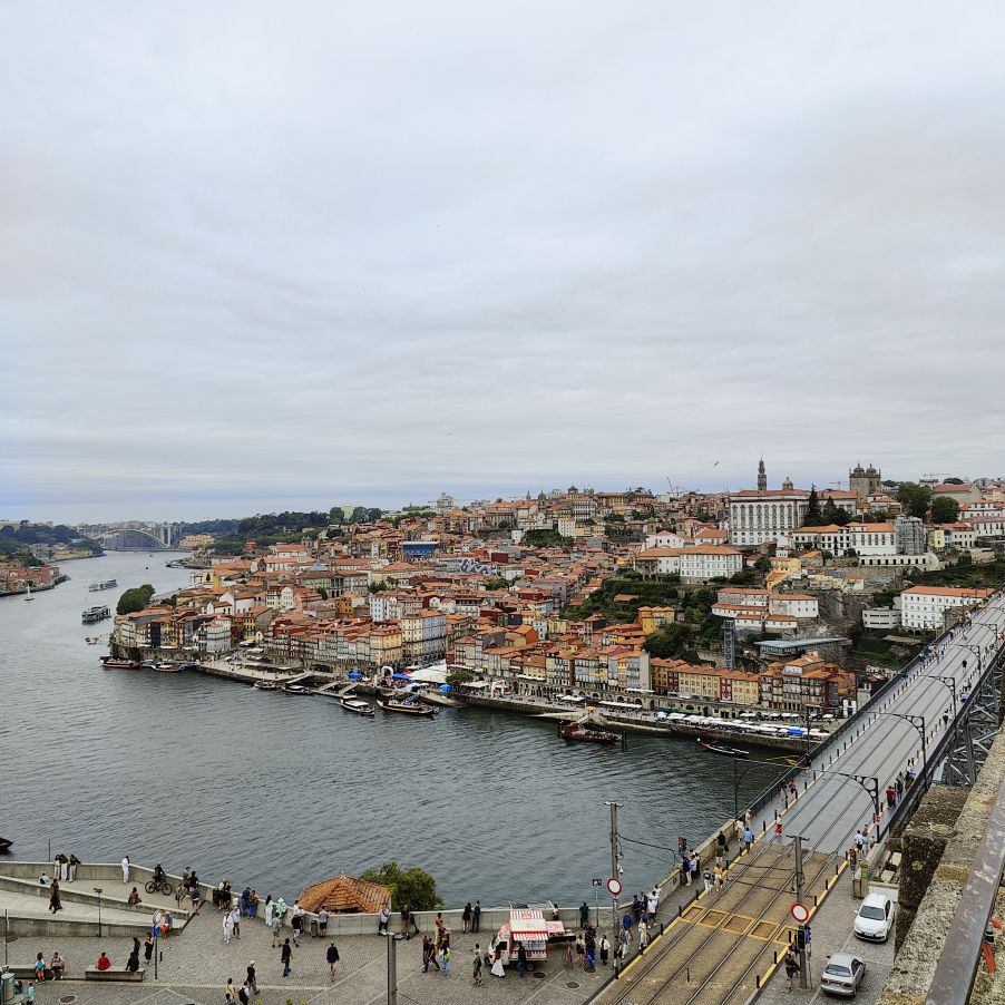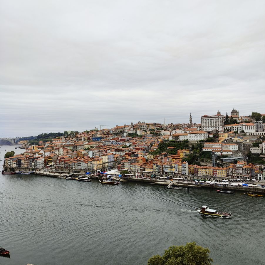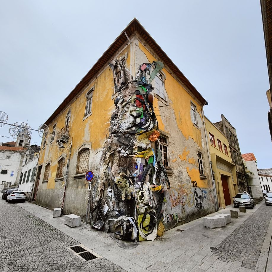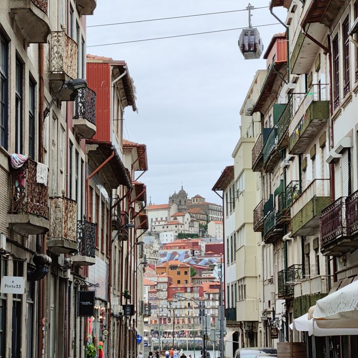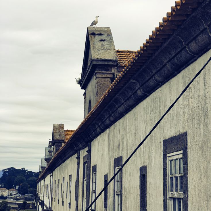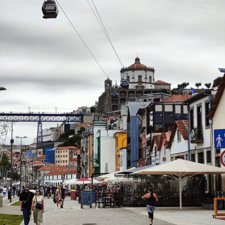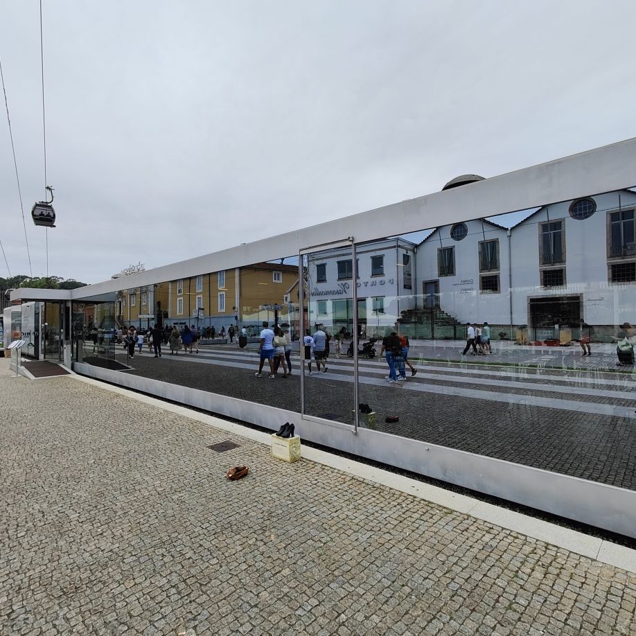 Am späten Vormittag spazieren wir Richtung Talstation der Teleférico de Gaia mit einem Abstecher zum „Half Rabbit“, einer StreetArt-Installation aus Schrott, das vom richtigen Blickwinkel aus wie ein überdimensionaler Hase aussieht. Dann fahren wir mit der Gondel zur Bergstation beim Jardim de Morro. Der Himmel ist wolkenverhangen, was gerade richtig für unseren Ausflug ist, aber nicht für den Ausblick. Wir gehen zum höchsten Aussichtspunkt, zum Kloster Serra do Pilar, von dem wir gut auf die Brücke und Porto sehen und ebenso die Dächer der Portweinkeller in Vila Nova im Blick haben. Das Kloster kann derzeit wegen Renovierungsarbeiten nicht besichtigt werden. So suchen wir uns den kürzesten Weg hinunter zum Cais de Gaia und spazieren entlang der Cafés, Portweinkeller und Straßenstände zum Restaurant Ar de Rio, wo wir einen kleinen Mittagssnack zu uns nehmen.
