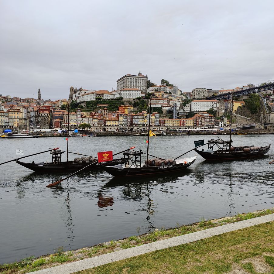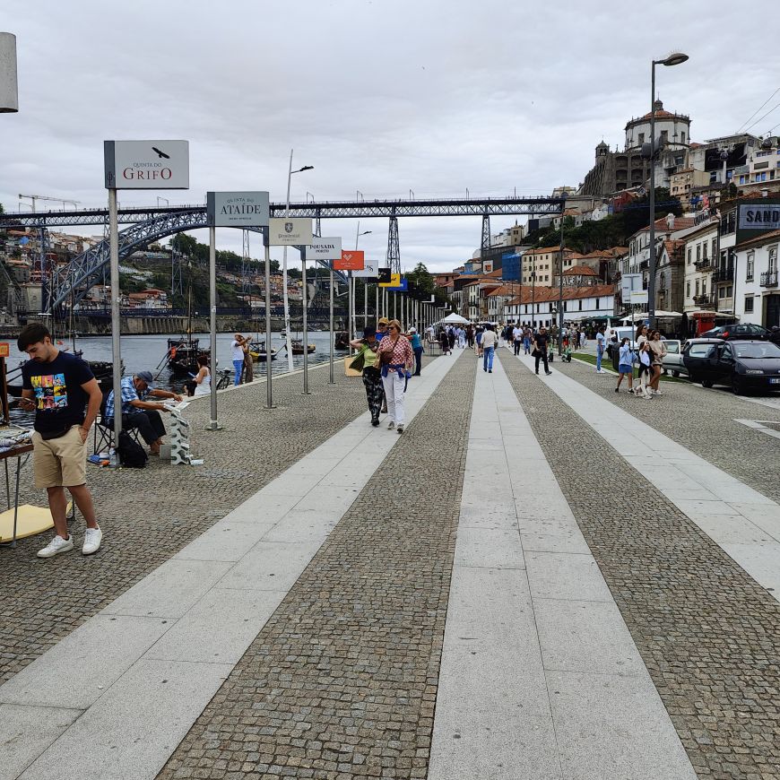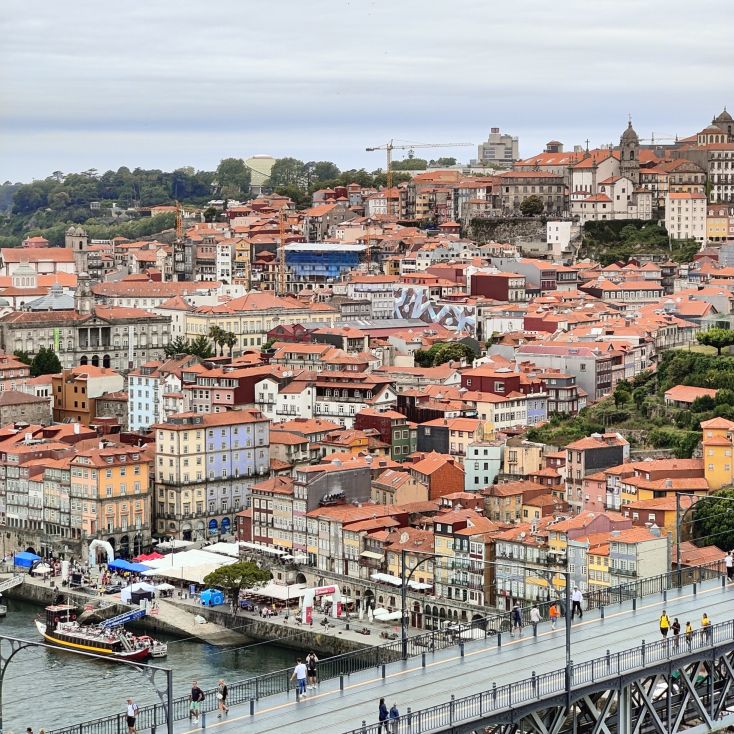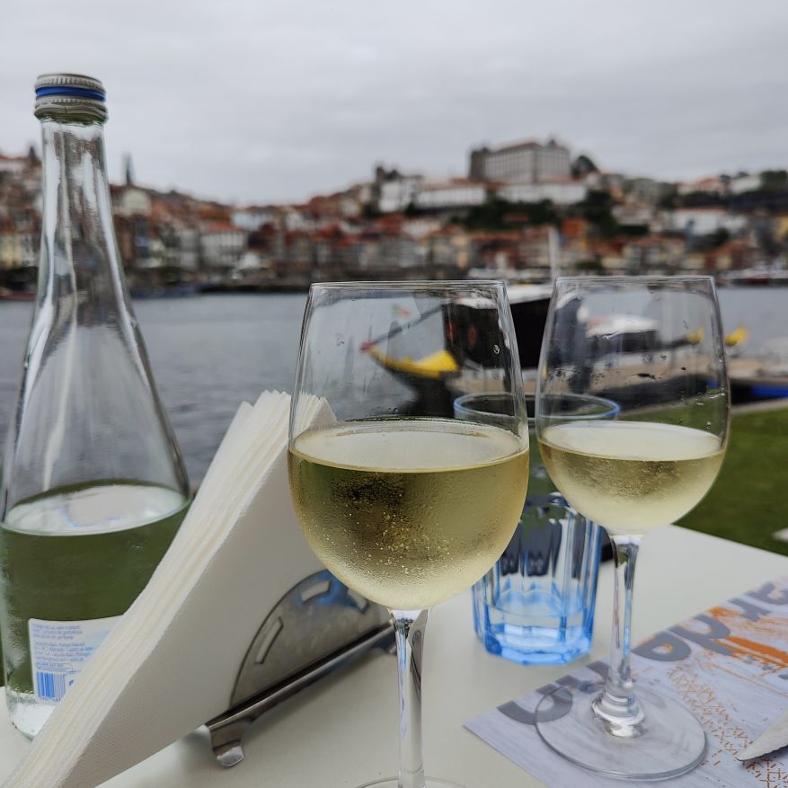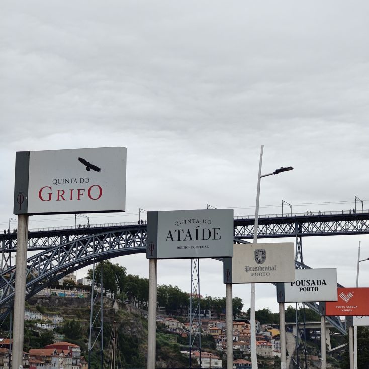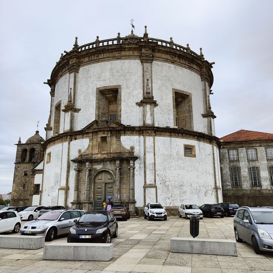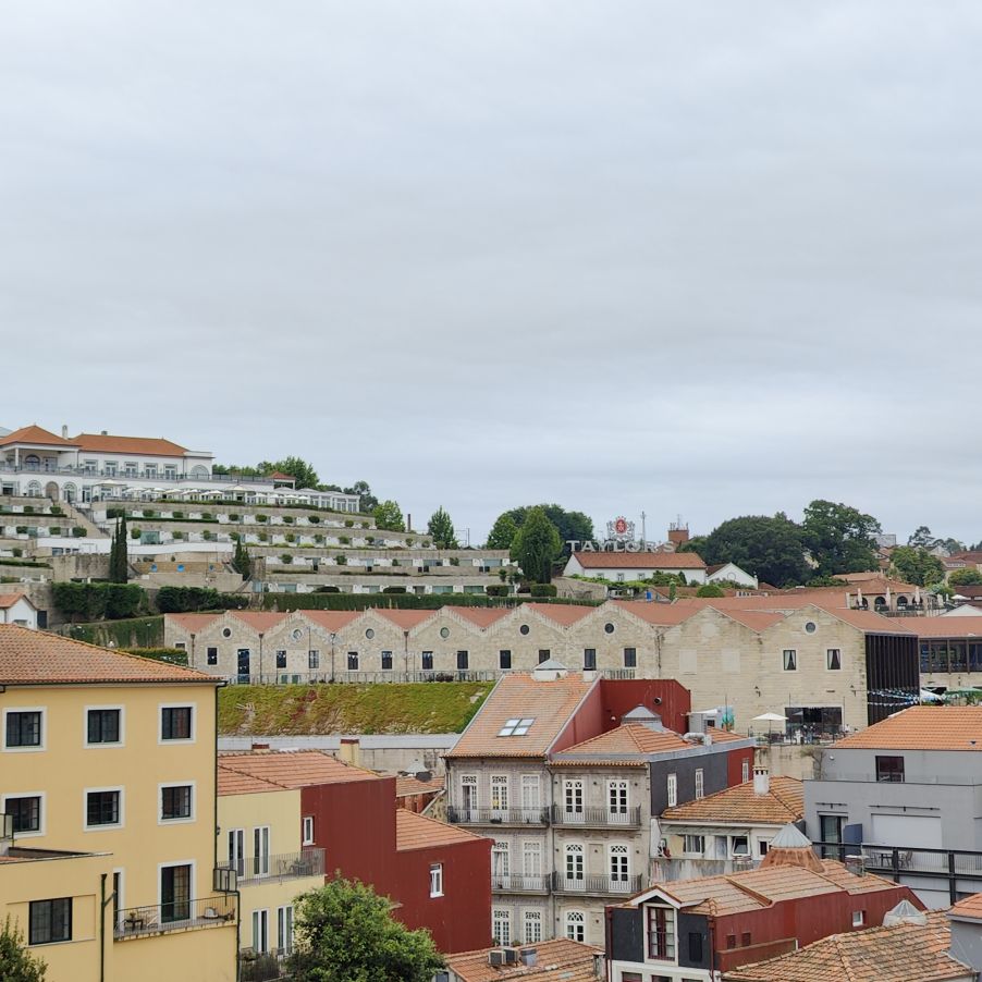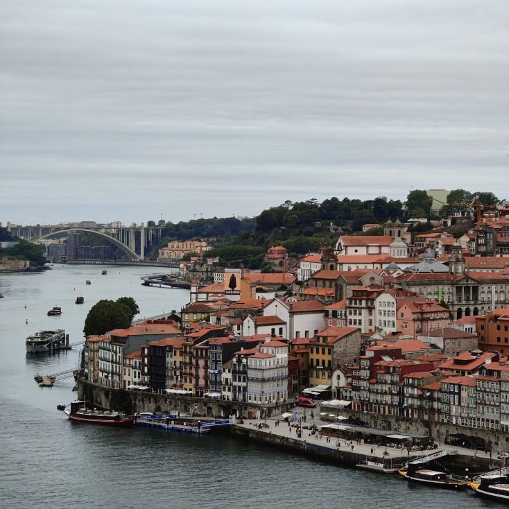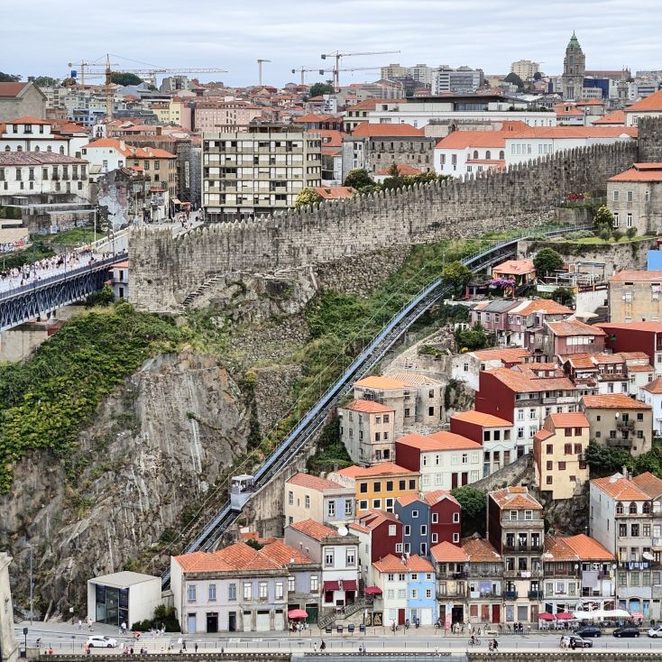 Am späten Vormittag spazieren wir Richtung Talstation der Teleférico de Gaia mit einem Abstecher zum „Half Rabbit“, einer StreetArt-Installation aus Schrott, das vom richtigen Blickwinkel aus wie ein überdimensionaler Hase aussieht. Dann fahren wir mit der Gondel zur Bergstation beim Jardim de Morro. Der Himmel ist wolkenverhangen, was gerade richtig für unseren Ausflug ist, aber nicht für den Ausblick. Wir gehen zum höchsten Aussichtspunkt, zum Kloster Serra do Pilar, von dem wir gut auf die Brücke und Porto sehen und ebenso die Dächer der Portweinkeller in Vila Nova im Blick haben. Das Kloster kann derzeit wegen Renovierungsarbeiten nicht besichtigt werden. So suchen wir uns den kürzesten Weg hinunter zum Cais de Gaia und spazieren entlang der Cafés, Portweinkeller und Straßenstände zum Restaurant Ar de Rio, wo wir einen kleinen Mittagssnack zu uns nehmen.