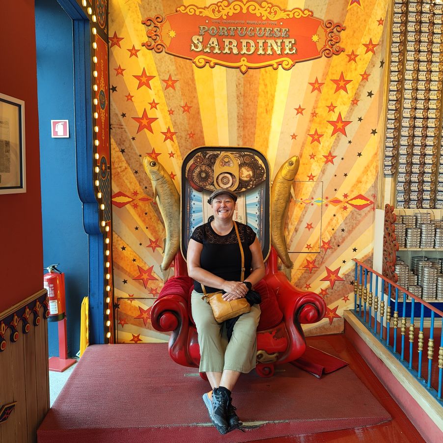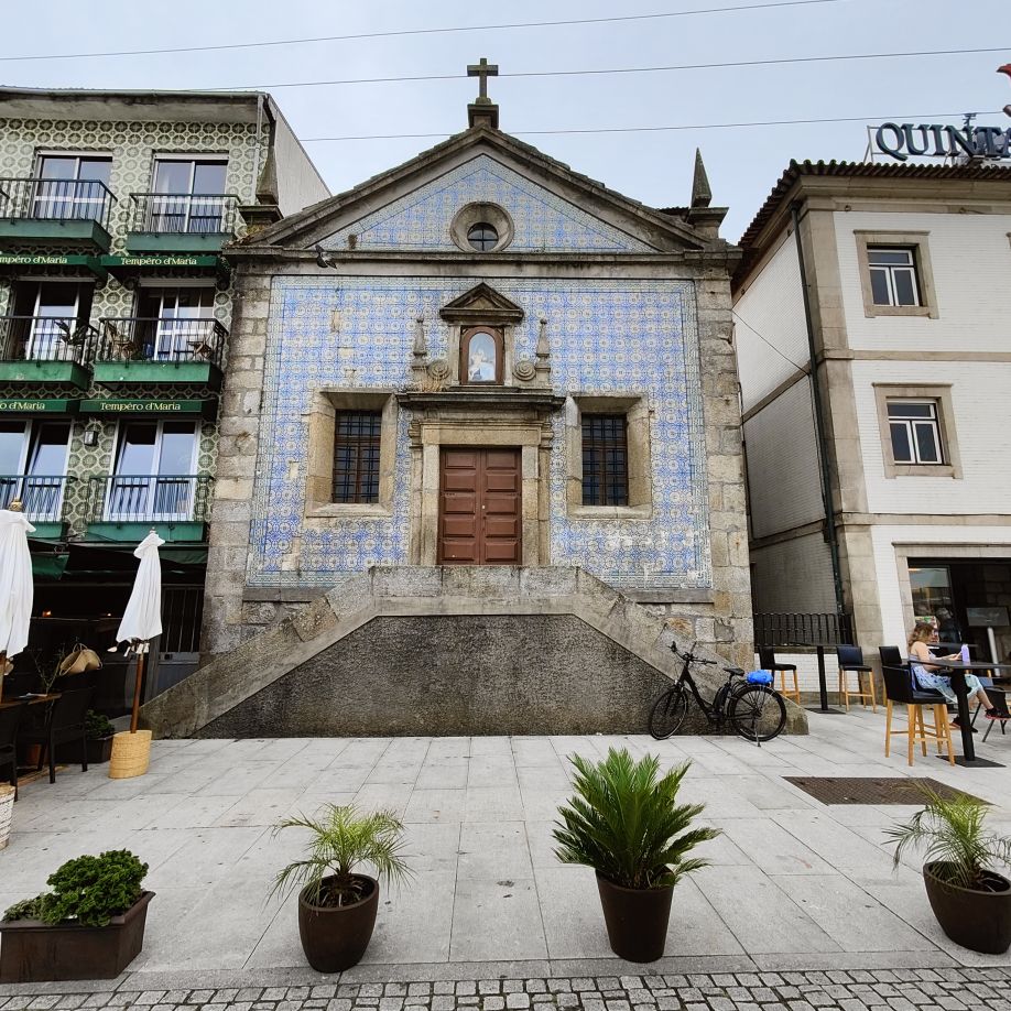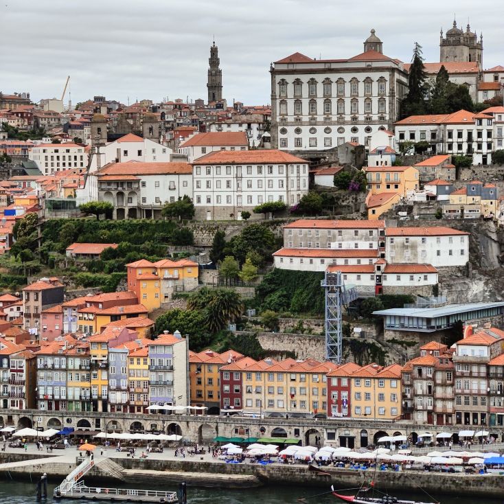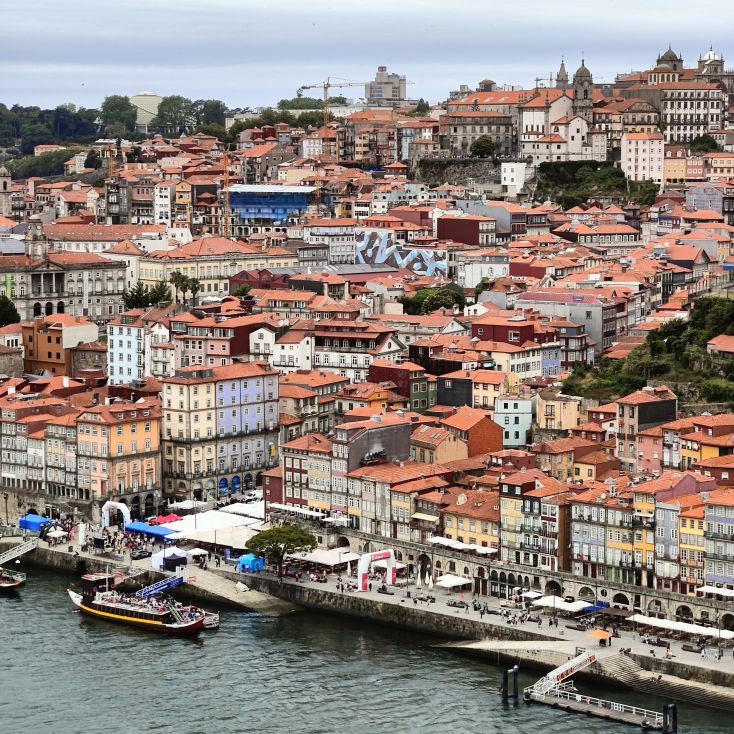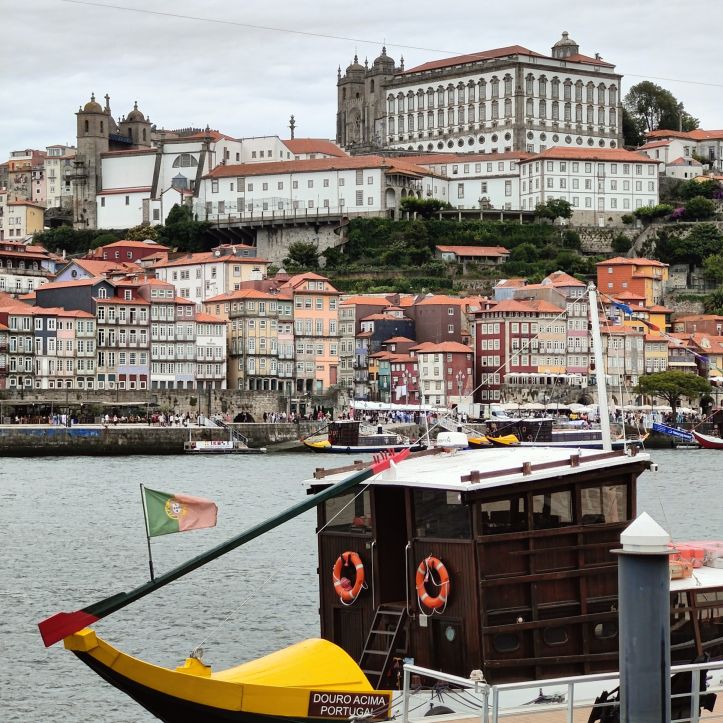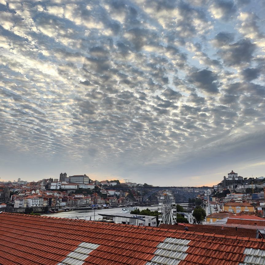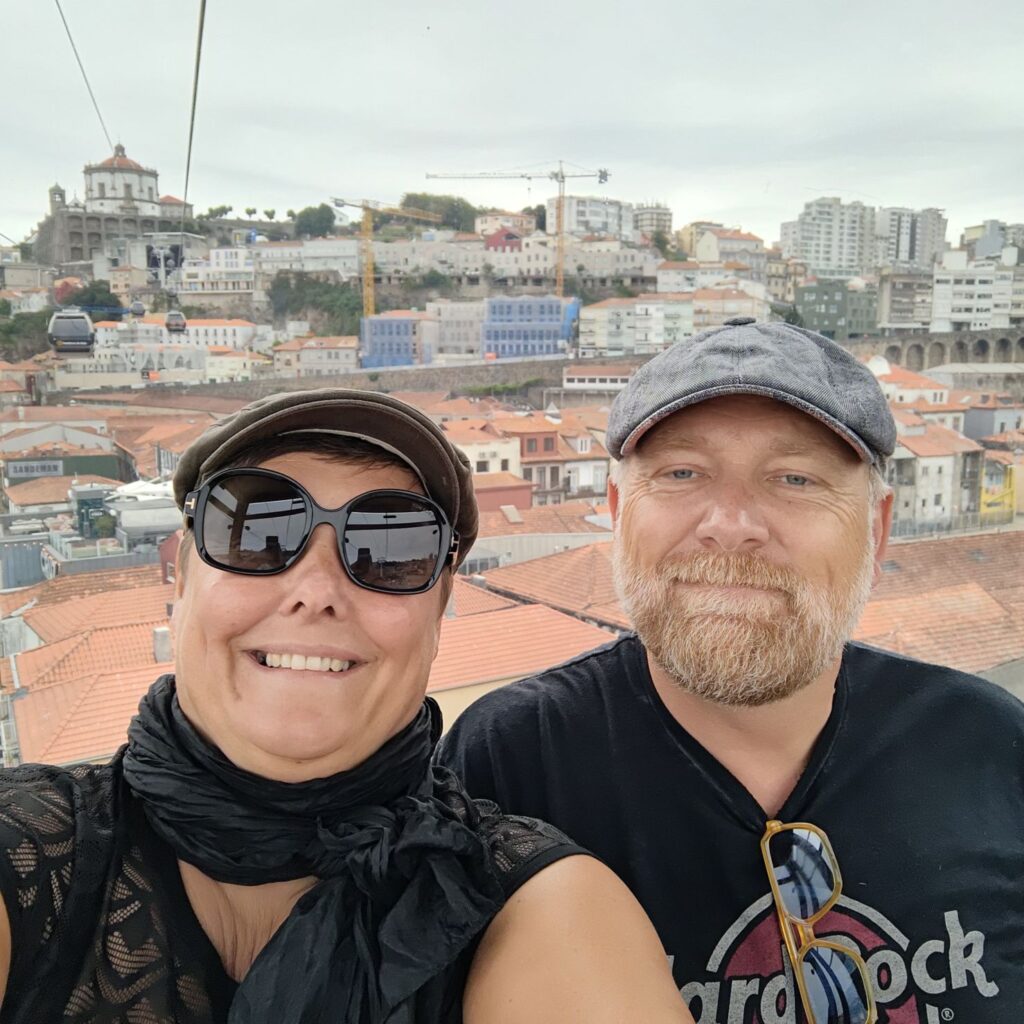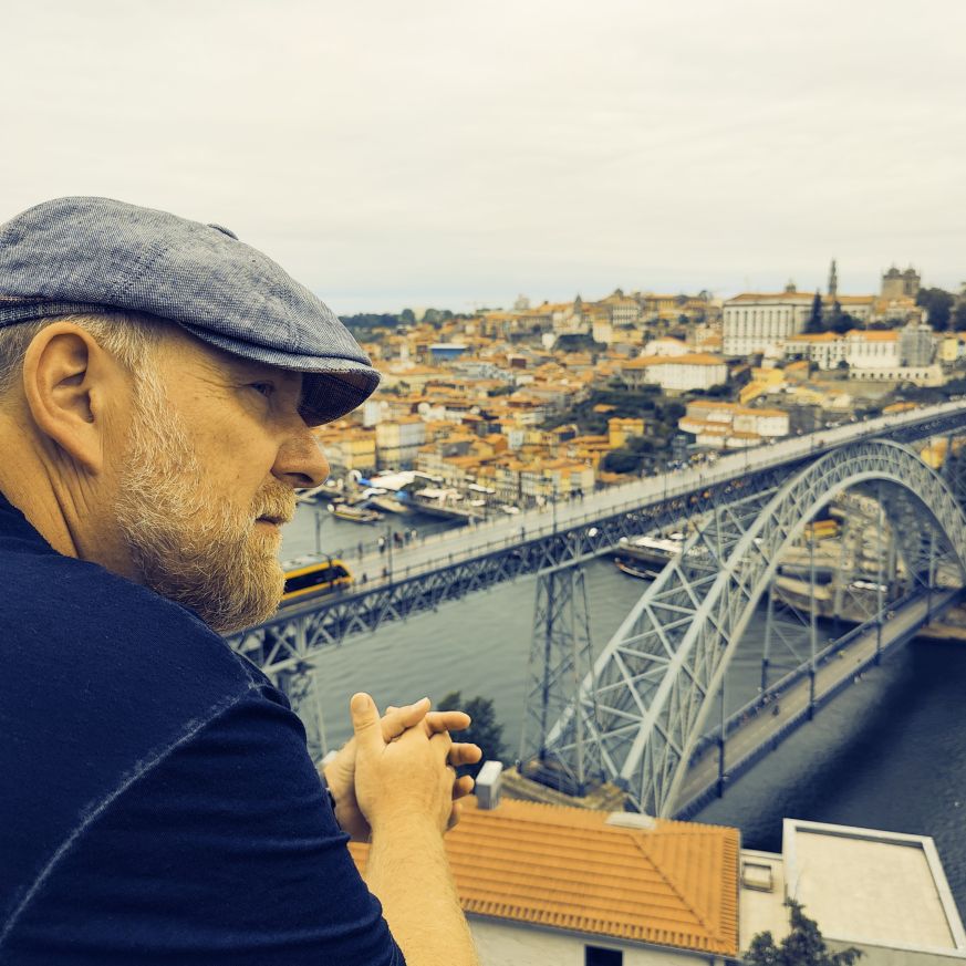 Am späten Vormittag spazieren wir Richtung Talstation der Teleférico de Gaia mit einem Abstecher zum „Half Rabbit“, einer StreetArt-Installation aus Schrott, das vom richtigen Blickwinkel aus wie ein überdimensionaler Hase aussieht. Dann fahren wir mit der Gondel zur Bergstation beim Jardim de Morro. Der Himmel ist wolkenverhangen, was gerade richtig für unseren Ausflug ist, aber nicht für den Ausblick. Wir gehen zum höchsten Aussichtspunkt, zum Kloster Serra do Pilar, von dem wir gut auf die Brücke und Porto sehen und ebenso die Dächer der Portweinkeller in Vila Nova im Blick haben. Das Kloster kann derzeit wegen Renovierungsarbeiten nicht besichtigt werden. So suchen wir uns den kürzesten Weg hinunter zum Cais de Gaia und spazieren entlang der Cafés, Portweinkeller und Straßenstände zum Restaurant Ar de Rio, wo wir einen kleinen Mittagssnack zu uns nehmen.