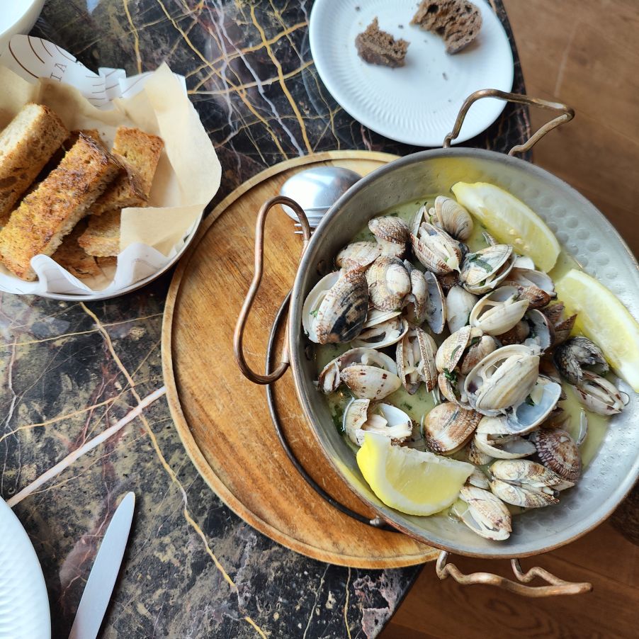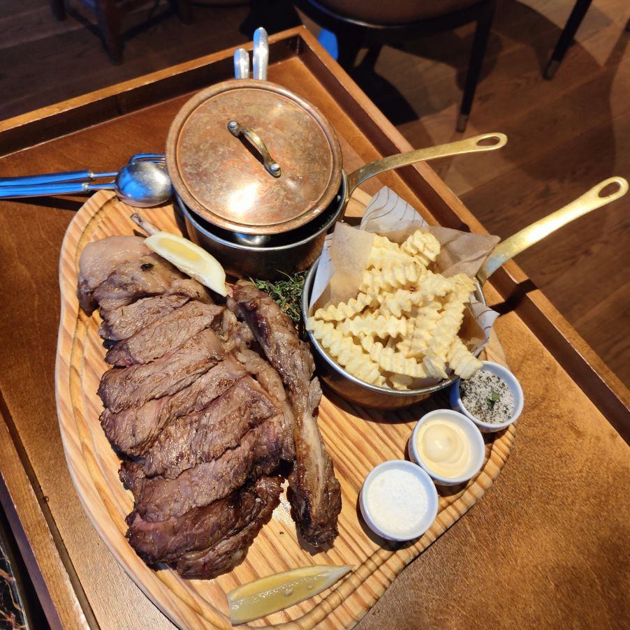 Unser letztes Abendessen nehmen wir ebenfalls im Hotel zu uns – der Frühstücksraum ist abends ein feines Restaurant. Wir teilen uns die weltbesten Muscheln, eine Koriandersuppe, einen Umber und ein Tomahawk-Steak und sind danach so satt, dass wir nicht einmal das Wort Nachspeise denken können.