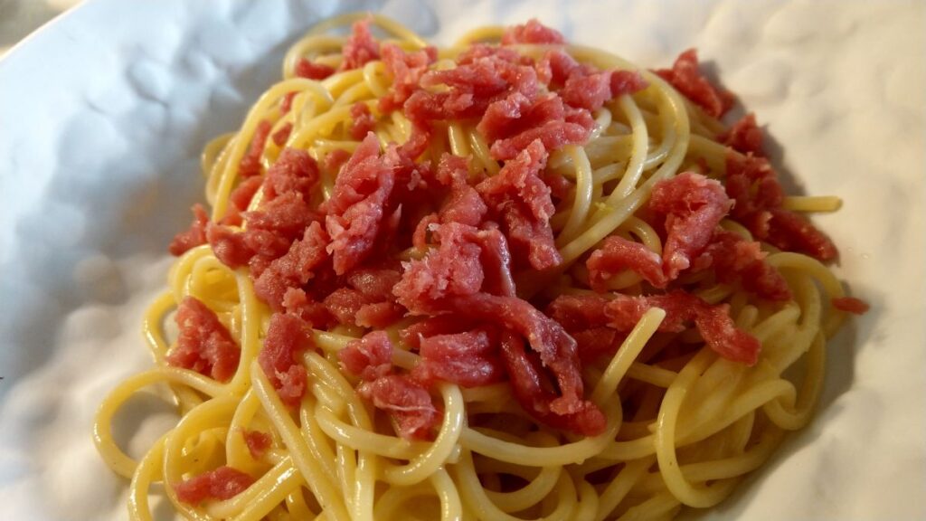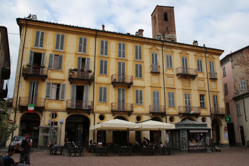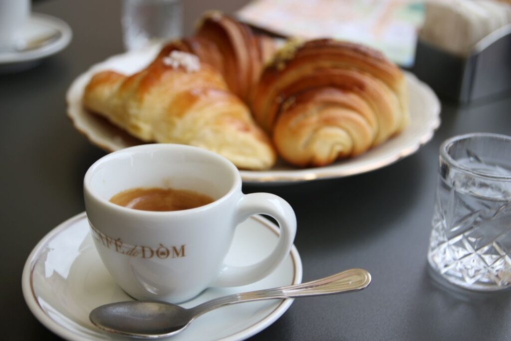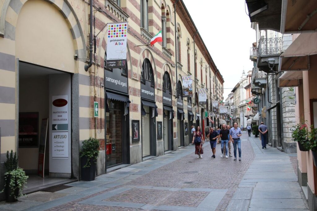 Unser Frühstück besteht heute – ganz italienisch – aus einem Espresso und einem Cornetto in einem Café. Dann machen wir noch einmal einen Rundgang durch die Innenstadt von Alba, um einzukaufen. Wir nehmen Creme die Nocciole, Tartufi dolce, Caffarel Gianduja, Wurst, Käse und frische Pasta mit.