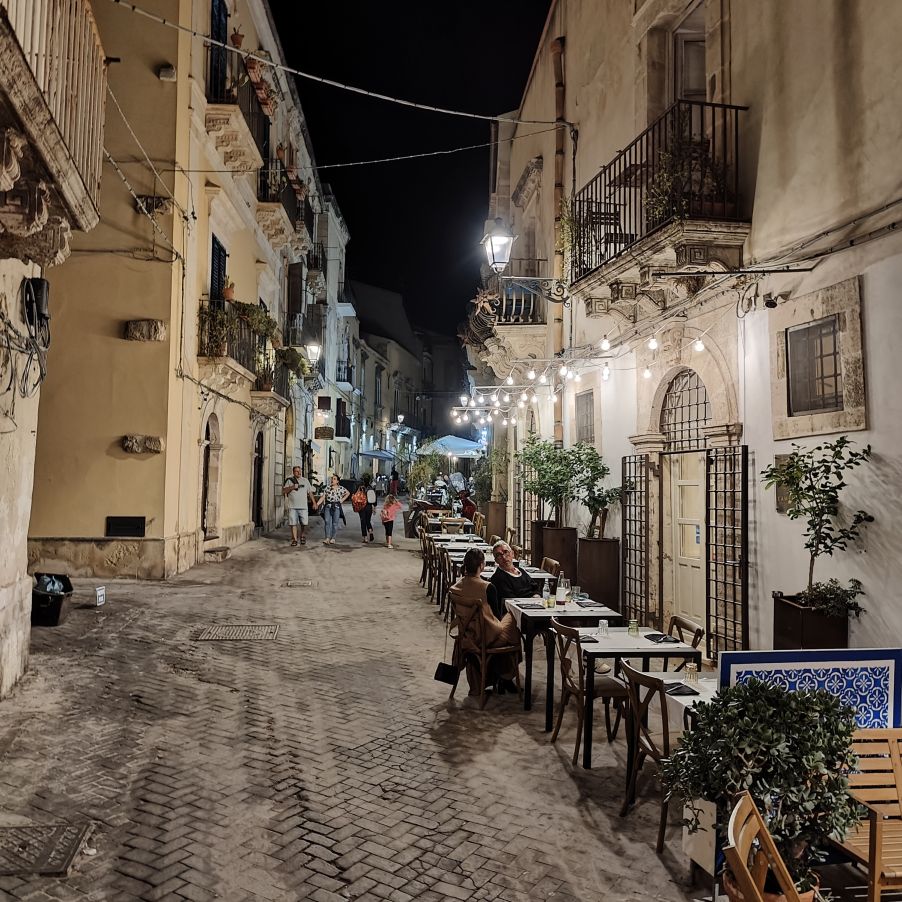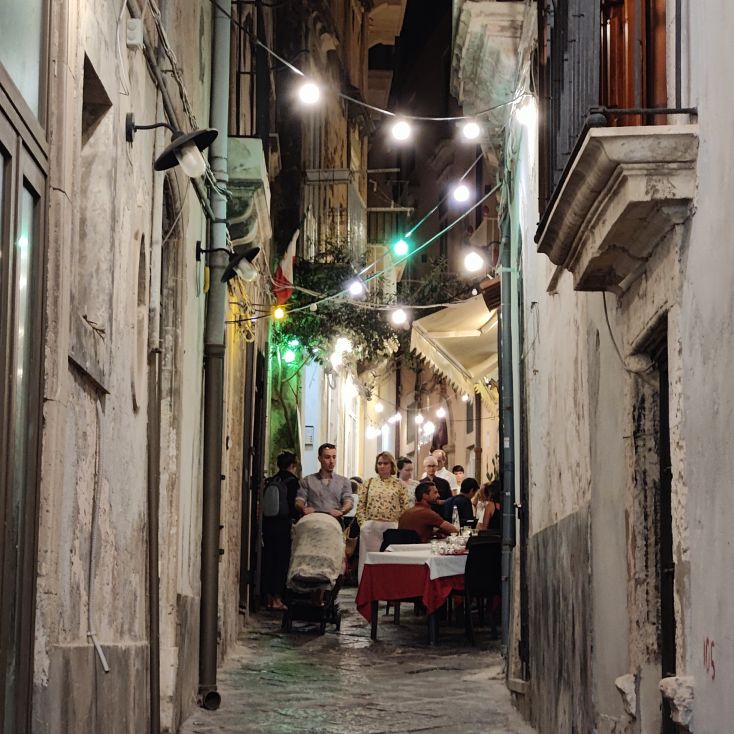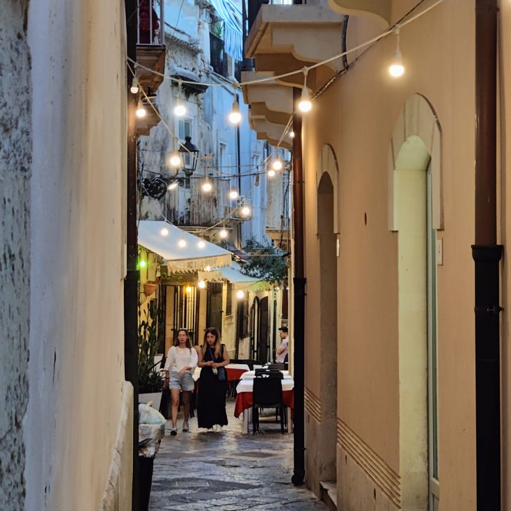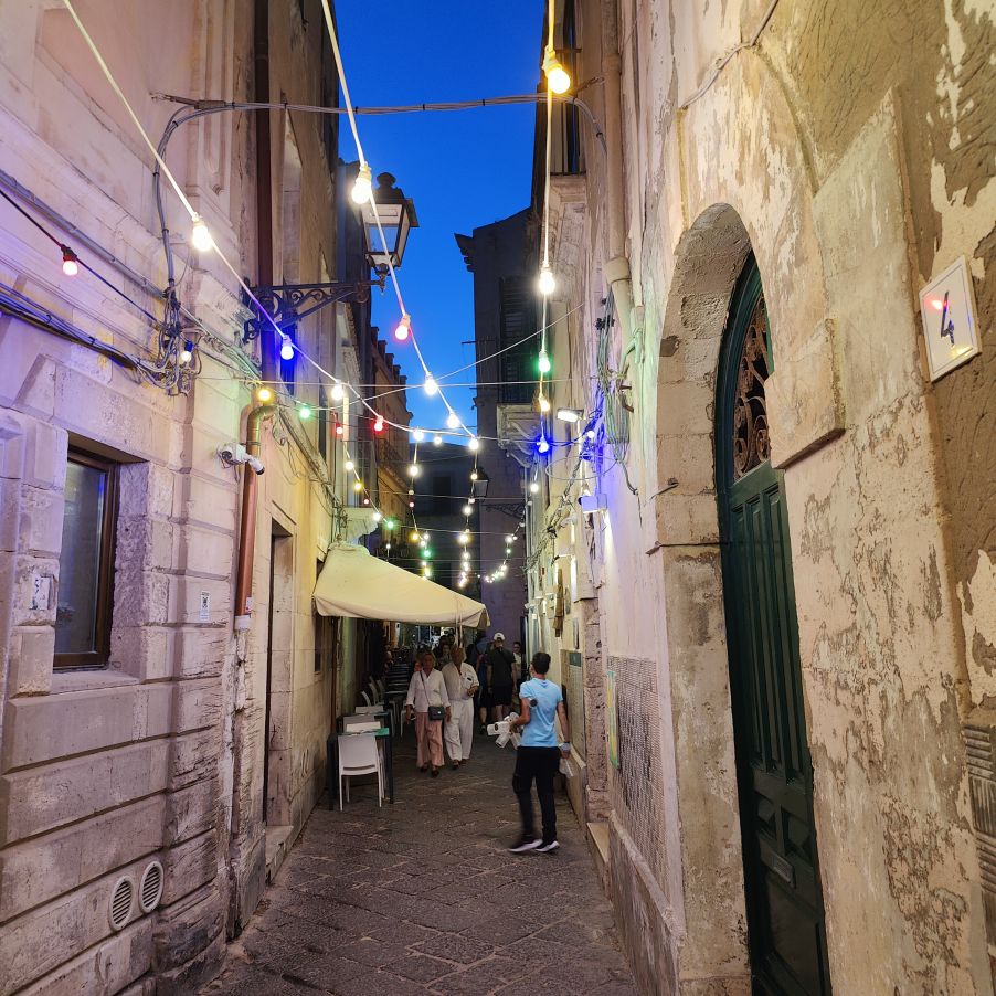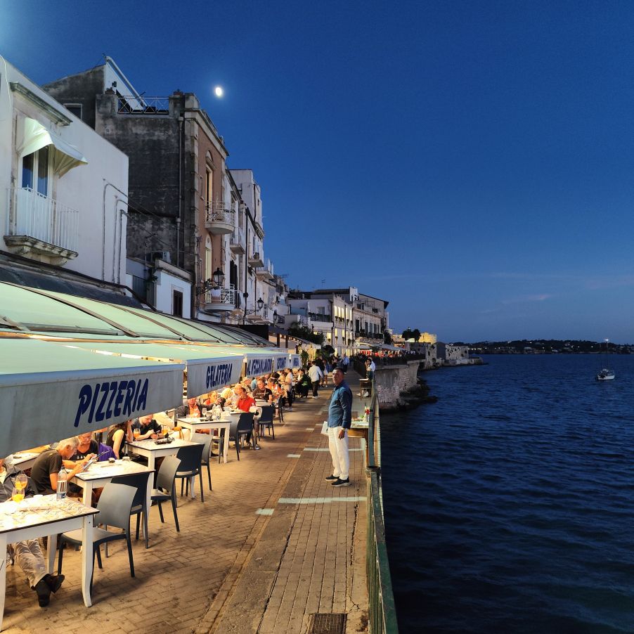 Am Abend verabschieden wir uns und schlendern weiter durch die engen Gassen der Altstadt. Pünktlich zur blauen Stunde genehmigen wir uns noch einen Drink in einer kleinen Bar am Pier und gehen dann zu Fuß zum Restaurant, das wir für den heutigen Abend gebucht haben: das mit einem Michelin-Stern dekorierte Cortile Spirito Santo. Wir essen ein großartiges Menü und fahren erst spätabends zurück ins Hotel.
