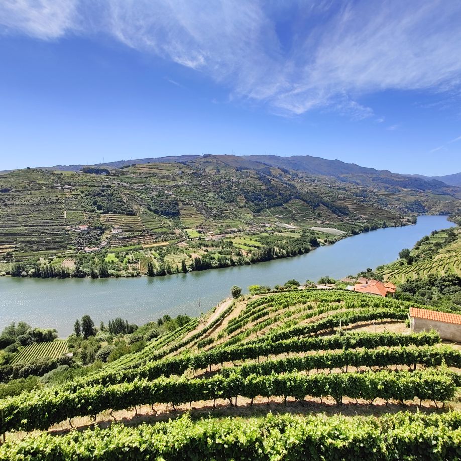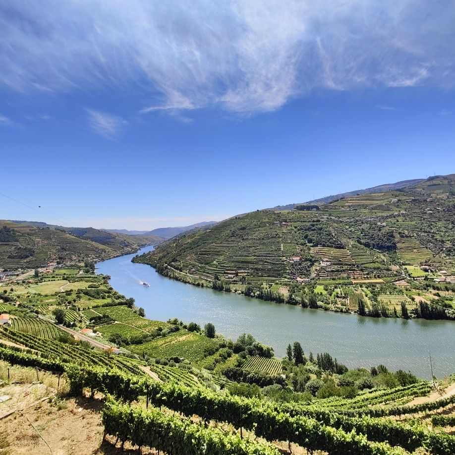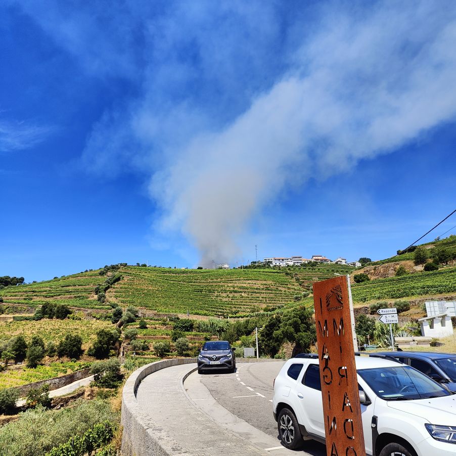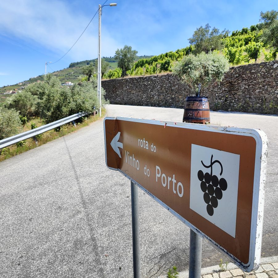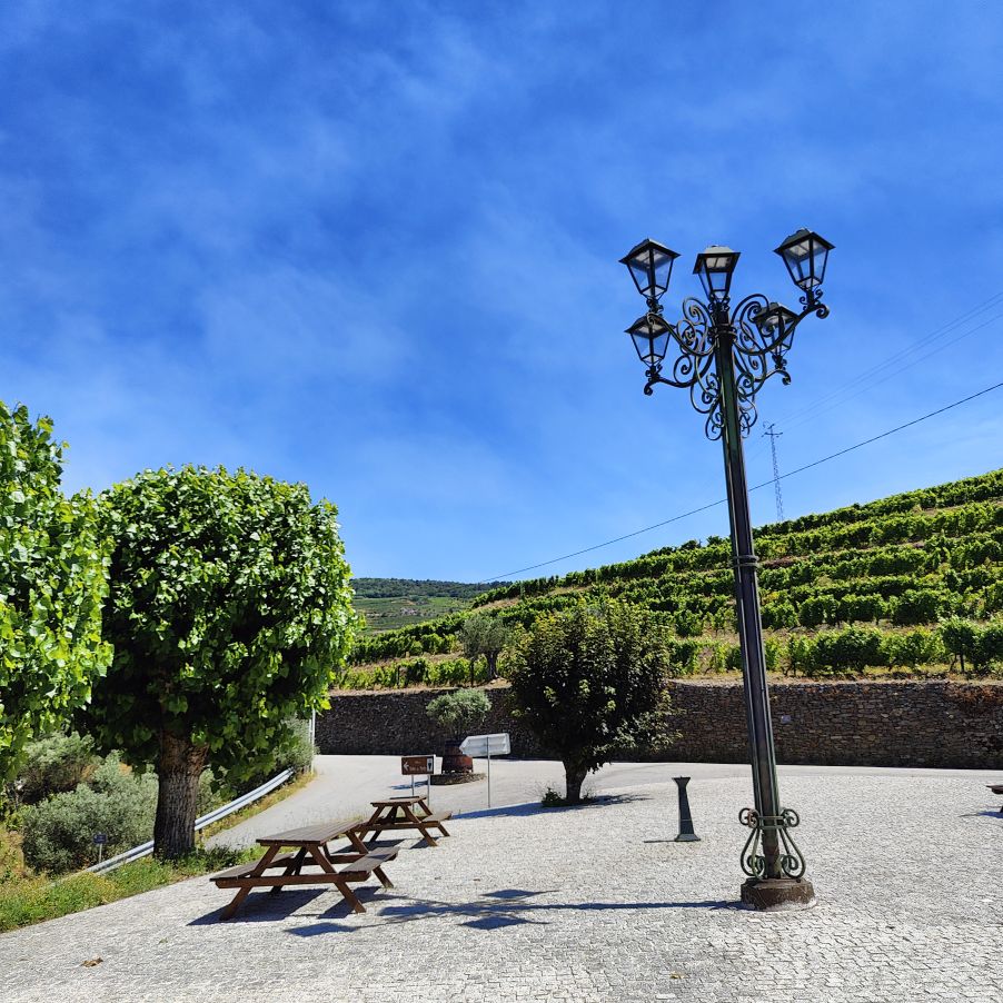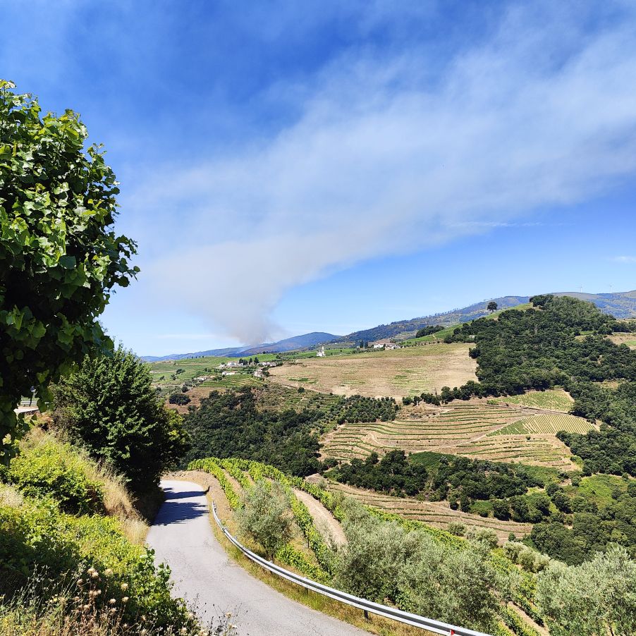 Dann fahren wir 100 Kilometer Richtung Osten nach Péso da Régua. Einen ersten Zwischenstopp machen wir in Mesão Frio, wo wir erstmals einen Blick auf den Douro erhaschen. Auf einem Hügel in der Nähe brennt es und wir beobachten den Lösch-Hubschrauber, der das Wasser zur Brandbekämpfung aus dem Fluss schöpft. Dann geht es weiter zum höher gelegenen Miradouro de Santo António, wo wir ebenfalls einen fantastischen Ausblick Richtung Osten auf die Weinberge und den Douro haben. Dann fahren wir die letzten Kilometer nach Péso da Régua, das als das Tor ins Douro-Tal gilt. Die Straßen sind abenteuerlich – eng, steil und holprig. Christoph lenkt den Dacia gekonnt 400 Höhenmeter auf drei Kilometer Straße nach unten. In Péso da Régua angekommen, besuchen wir das Museo do Douro und essen anschließend eine Kleinigkeit im „Castas e Pratos“.
