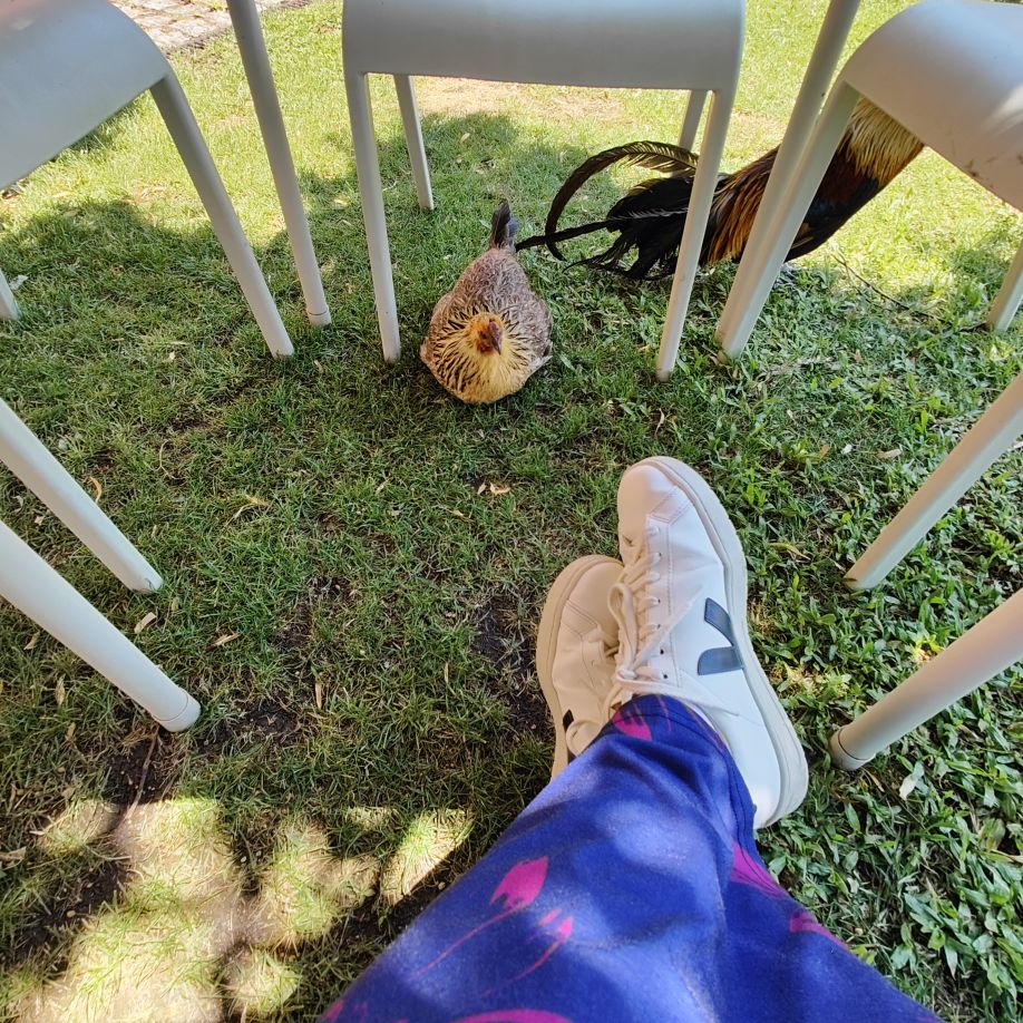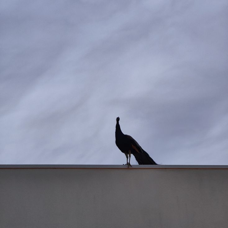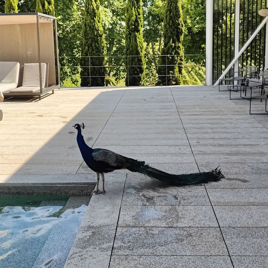 Draußen ist es sehr warm und wir kühlen uns im Pool ab. Wir bekommen Besuch von einem Pfau, der hier auf der Quinta gemeinsam mit vier anderen lebt.