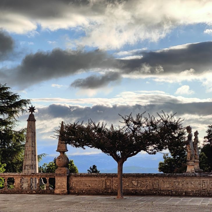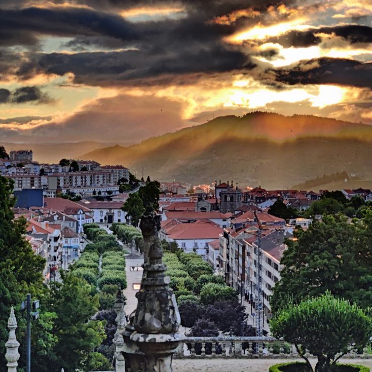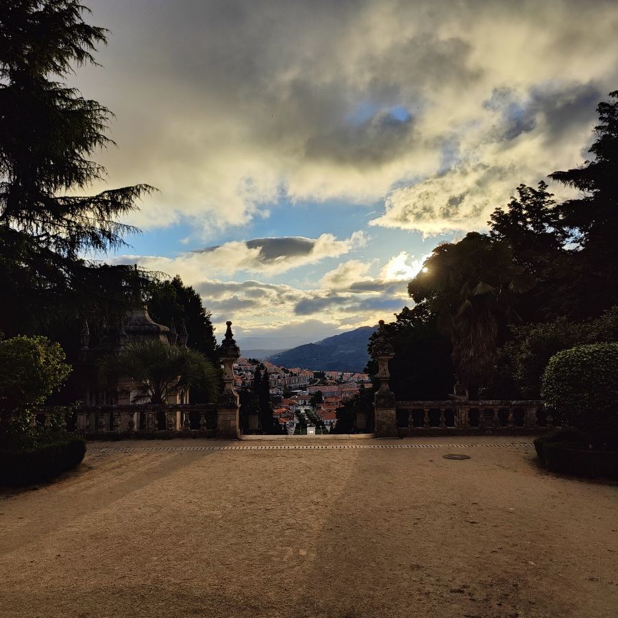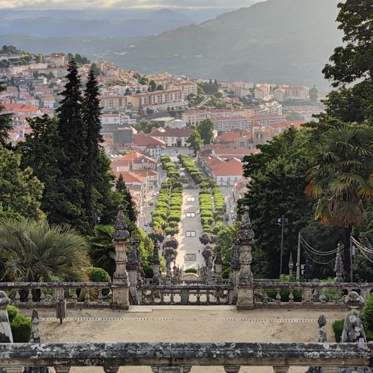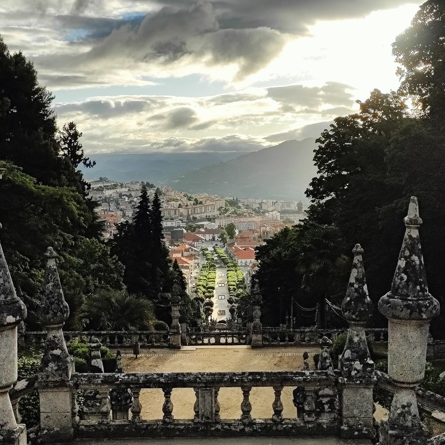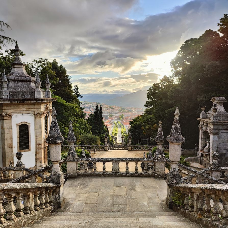 Die aufgehende Sonne beleuchtet die Treppen exakt im 180 Grad Winkel, wir gehen bis ganz hinauf und haben einen großartigen Ausblick auf Lamego.
