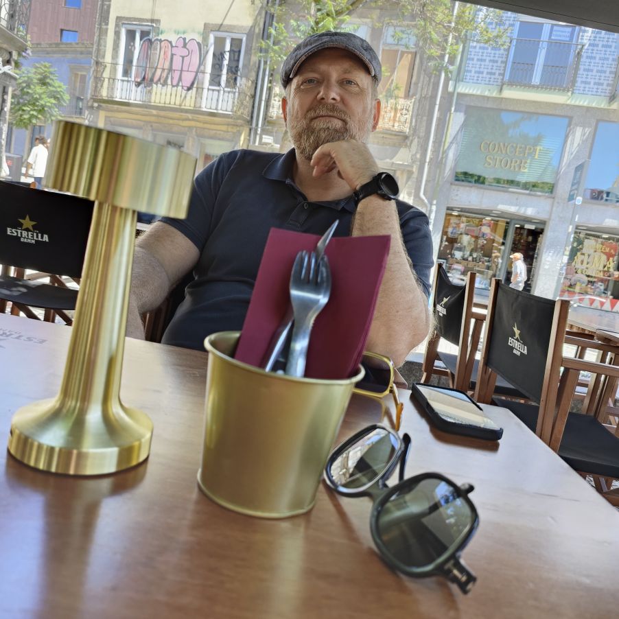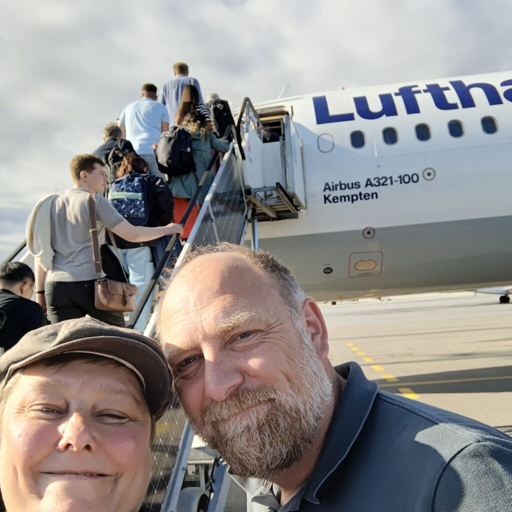 Um 3:00 Uhr geht’s los: wir fahren nach München und sind drei Stunden später am Flughafen angelangt. Wir haben wie immer das Parkhaus P20 mit dem E-Ladeservice reserviert und übergeben das Auto. Am Flughafen frühstücken wir Weißwurst mit Brezen, dazu ein schönes Weißbier – schmeckt um halb acht Uhr morgens erstaunlich gut. Am Gate angelangt, ist auch schon das Boarding in Gange. Der Flug ist etwas verspätet, um 8:55 heben wir ab Richtung Südwesten. Wir fliegen nördlich entlang der Alpen und haben einen wunderbaren Ausblick etwa auf den Montblanc. Die Route führt uns über Lyon, Toulouse und Nordspanien. Nach exakt drei Stunden landen wir am Flughafen Porto. Es ist erst 10:55, denn Porto liegt in einer anderen Zeitzone.