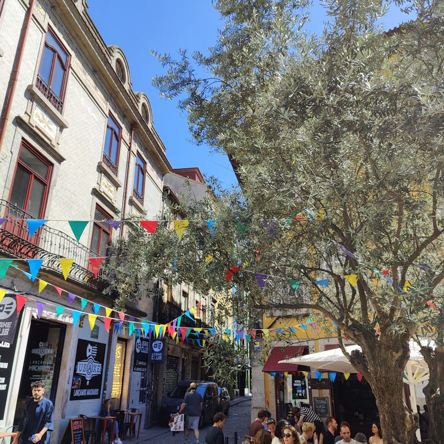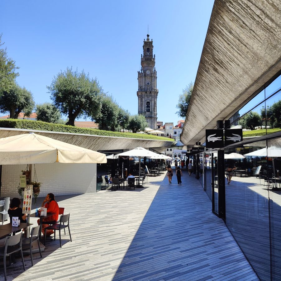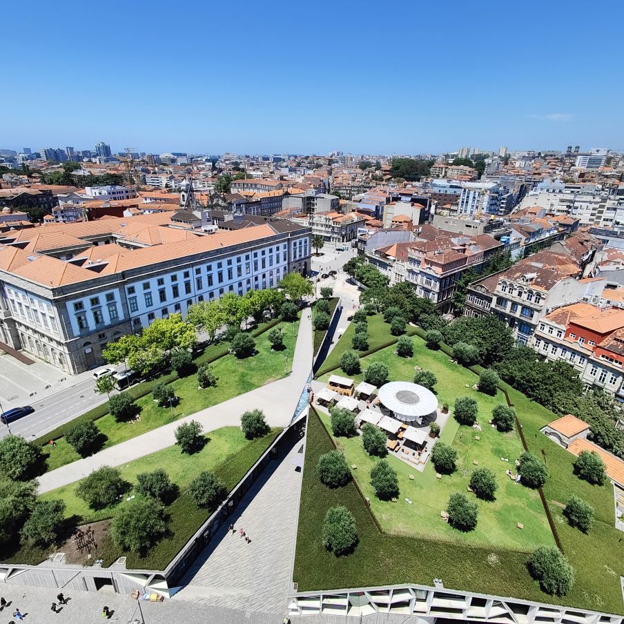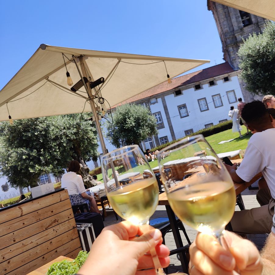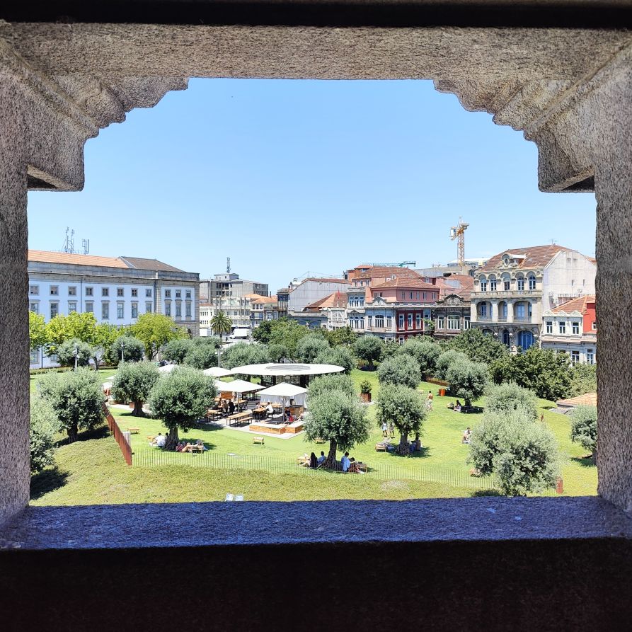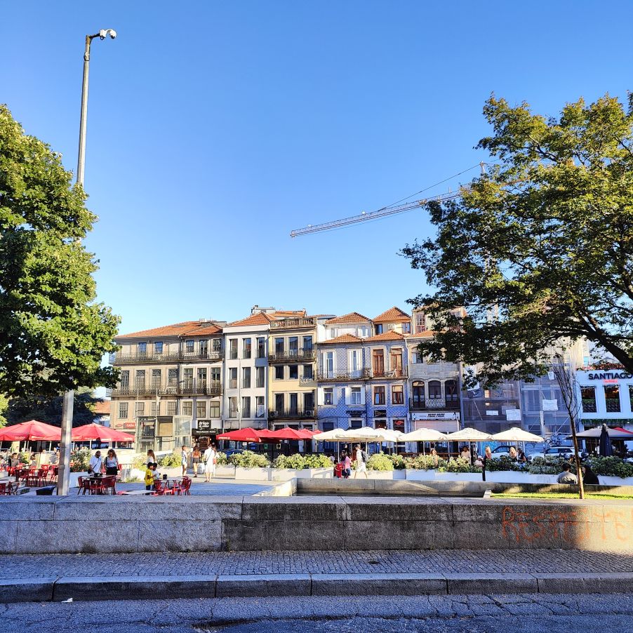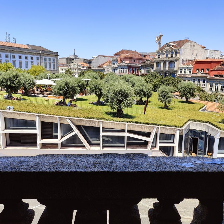 So viele Stufen machen durstig und wir trinken ein schnelles Glas Weißwein im BASE Porto am Praça de Lisboa, einem schön gestalteten Platz mit Olivenbäumen und einem Café.