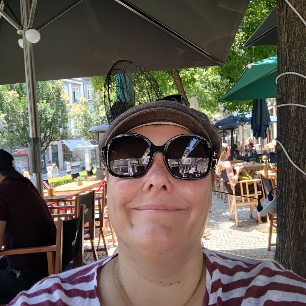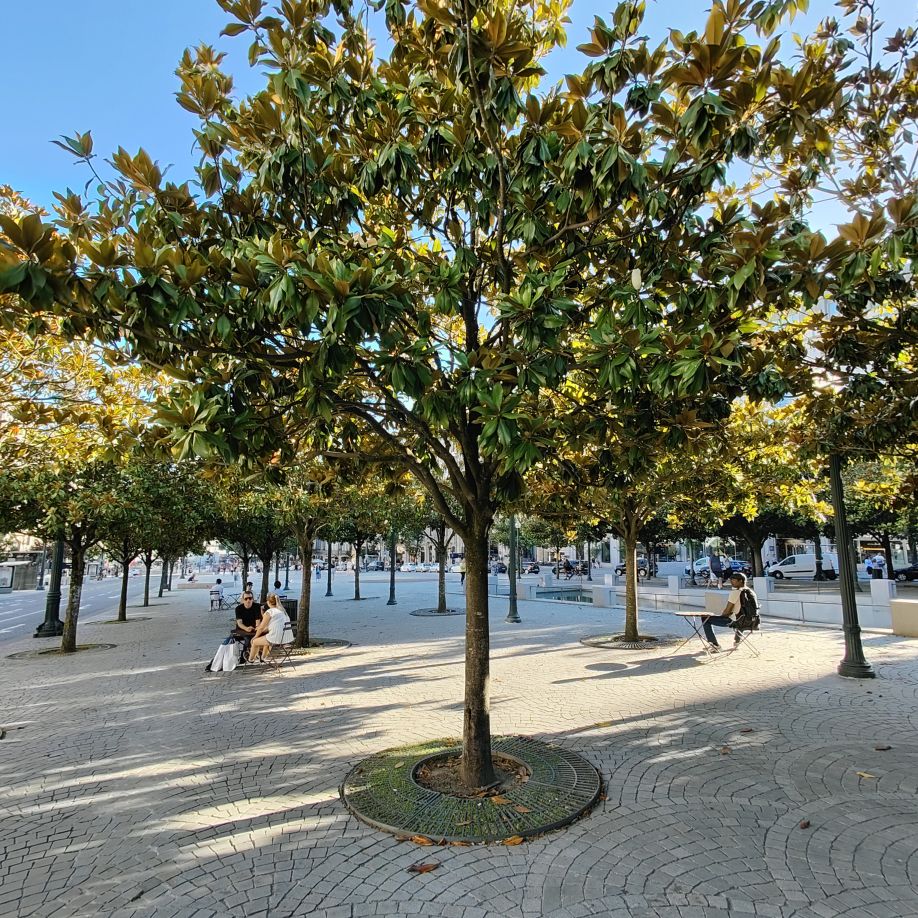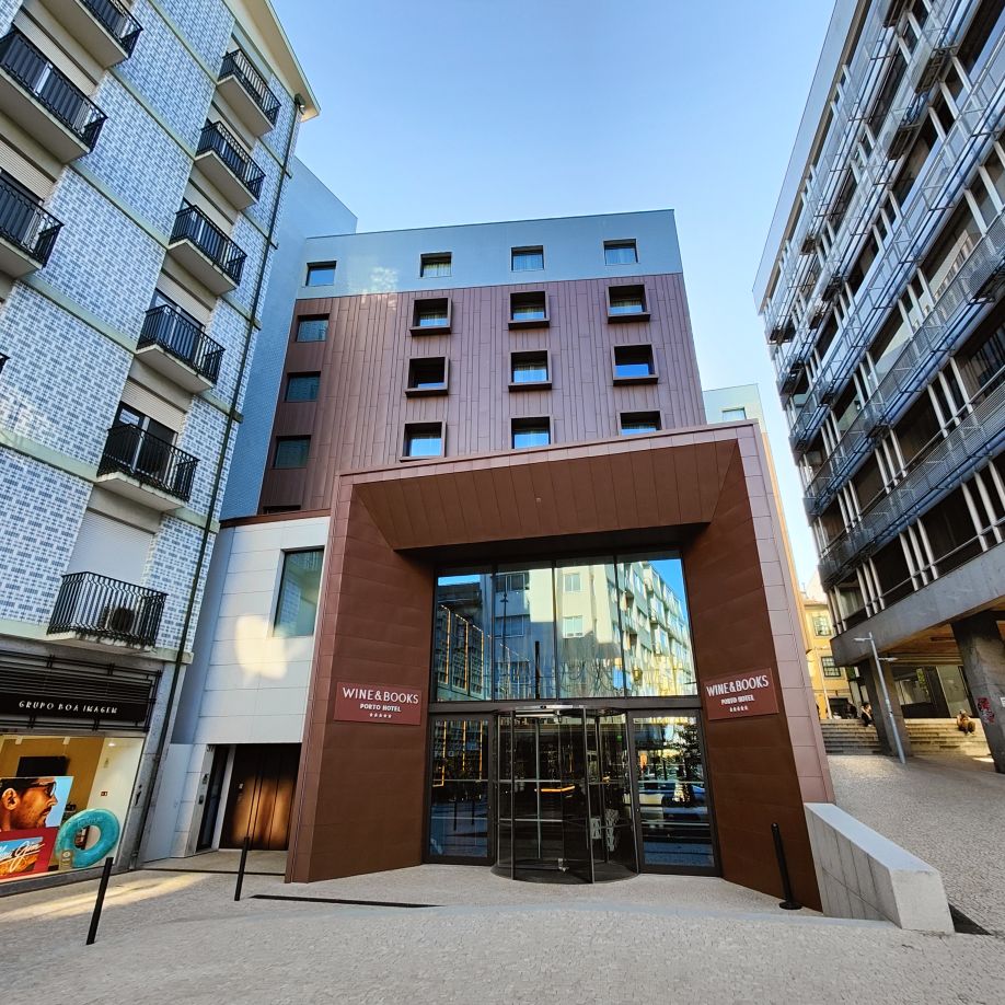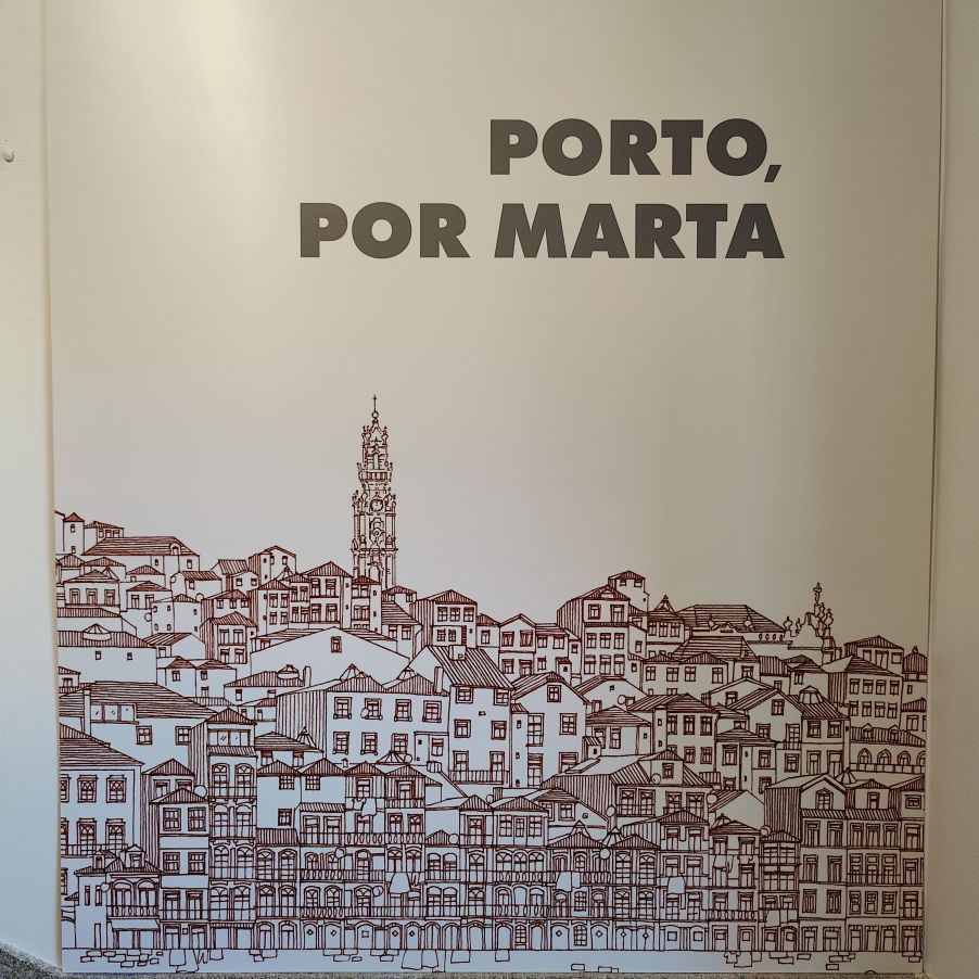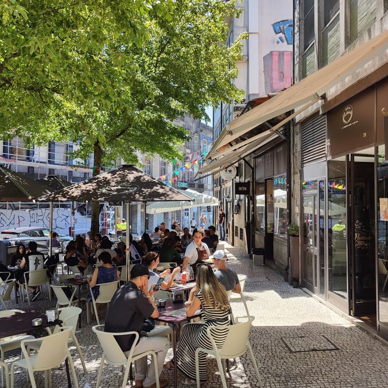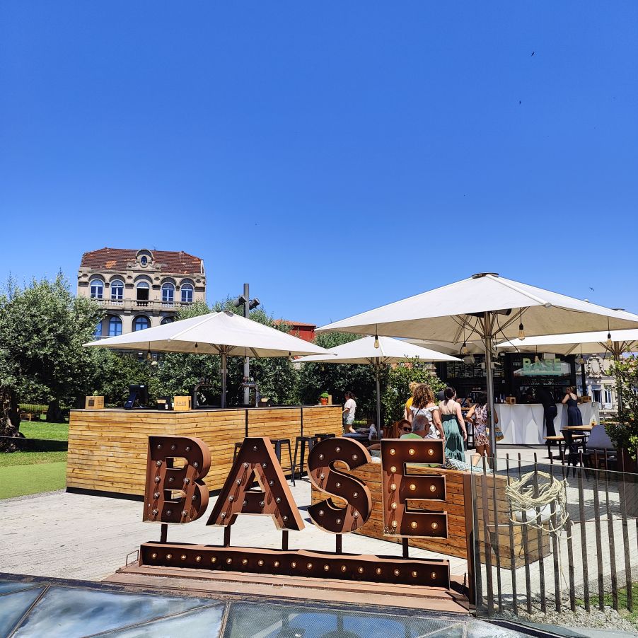 So viele Stufen machen durstig und wir trinken ein schnelles Glas Weißwein im BASE Porto am Praça de Lisboa, einem schön gestalteten Platz mit Olivenbäumen und einem Café.