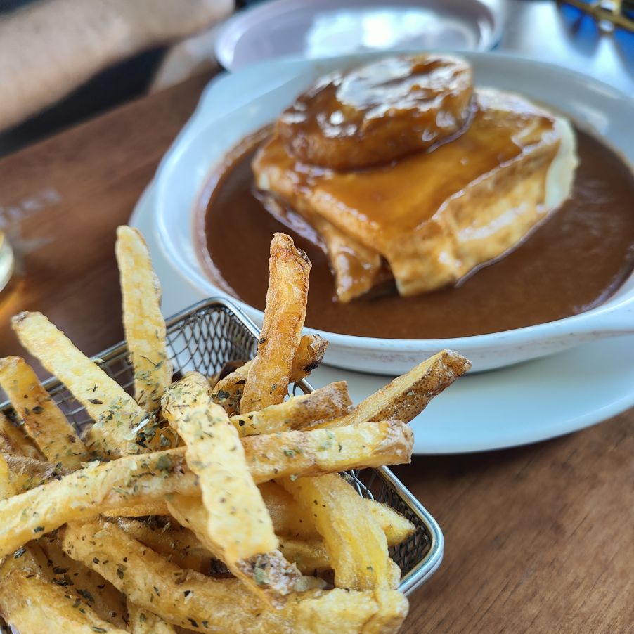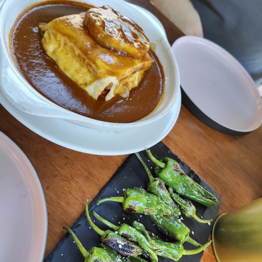 Unser erstes Ziel ist ein kleines Bistro um die Ecke, wir haben Hunger. Wir bestellen eine Francesinha, ein portugiesisches Lokalgericht. Es besteht aus Toastbrot, Kochschinken, Linguiça-Scheiben, gebratenem Rindfleisch, einem Spiegelei und geschmolzenem Käse, übergossen mit einer heißen, dickflüssigen Sauce aus Tomaten, Bier und Senf. Dazu gibt es Pommes. Nicht gerade kalorienarm, aber köstlich. Dazu essen wir Pimientos de Padron und trinken ein kühles Estrella. Unser Porto-Besuch hat gut begonnen.