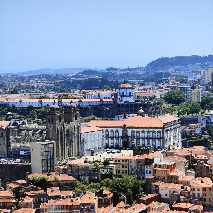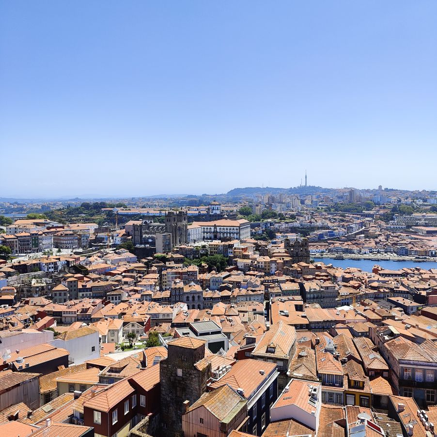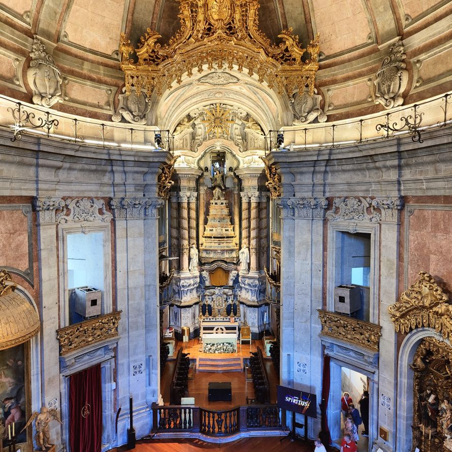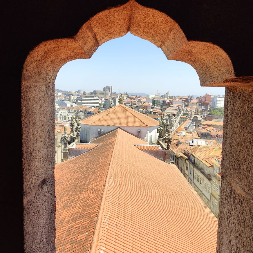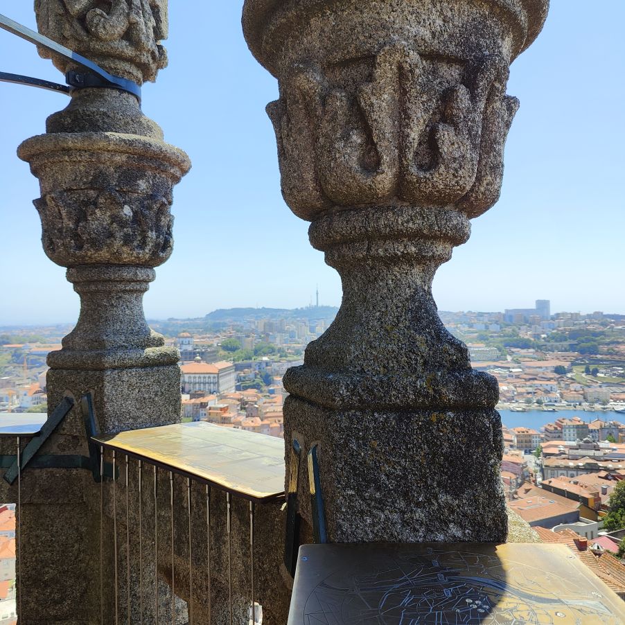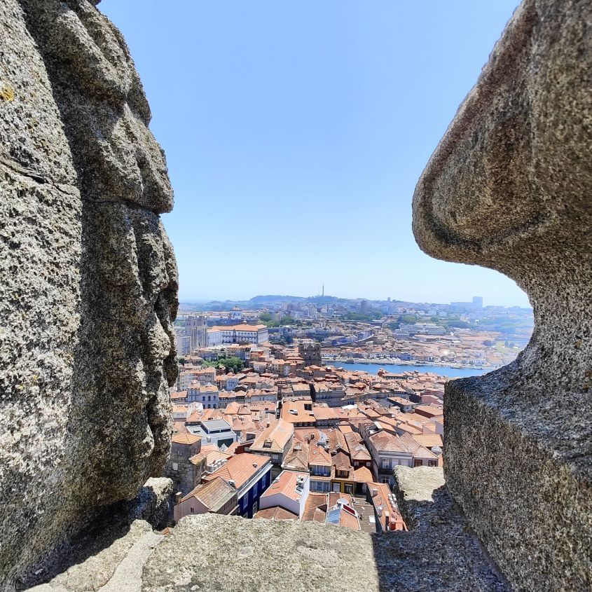 Gestärkt besteigen wir den Torre dos Clérigos, das Highlight der gleichnamige Kirche Igreja dos Clérigos. Diese wurde Mitte des 18. Jahrhunderts von dem italienischen Barockbaumeister Nicolau Nasoni errichtet, dessen Spuren an vielen Monumenten Portos und der nördlichen Region Portugals zu finden sind. Der Glockenturm aus Granit erinnert ein wenig an toskanische Campaniles und ist der höchste Kirchturm Portugals. Wir haben Tickets für die Turmbesteigung und gehen 225 Stufen bzw. sechs Stockwerke bzw. 76 Meter nach oben und haben einen fantastischen Ausblick auf Porto. Übrigens gibt es sogar eine 2 Euro-Münze, auf der das Porto-Wahrzeichen abgebildet ist.