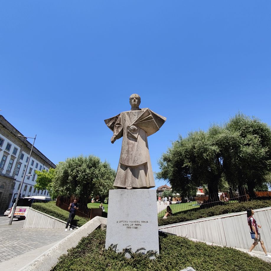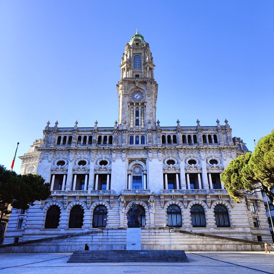 Frisch geduscht machen wir uns auf den Weg zum Restaurant, das wir für heute gebucht haben. Da auf dem Weg einige der wichtigsten Sehenswürdigkeiten von Porto liegen, haben wir etwas Zeit eingeplant. Zunächst kommen wir auf den großen Platz an der Avenida dos Aliados an dessen Ende sich das Câmara Municipal do Porto befindet. Das Rathaus hat eine Fassade ist aus Granit und ist mit einem Dutzend von José Sousa Caldas und Henrique Moreira entworfenen Skulpturen verziert, die jeweils für Porto typische Aktivitäten zeigen, z. B. den Weinbau, die Industrie und die Navigation. Vor dem Gebäude steht eine Statue des Dichters Almeida Garrett, vor 70 Jahren vom Bildhauer Barata Feio angefertigt. Der Bau des robusten und imposanten Gebäudes begann im Jahre 1920 mit einem Projekt des Architekten António Correia da Silva und wurde erst im Jahre 1955 definitiv fertiggestellt. In der Mitte erhebt sich ein 70 m hoher Festungsturm mit einem Glockenspiel, Symbol der großen Bedeutung des bürgerlichen Lebens für die Bewohner Portos.
