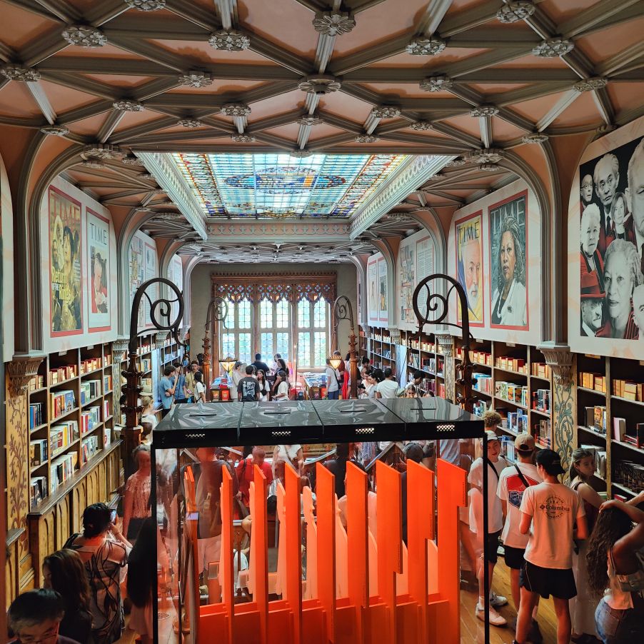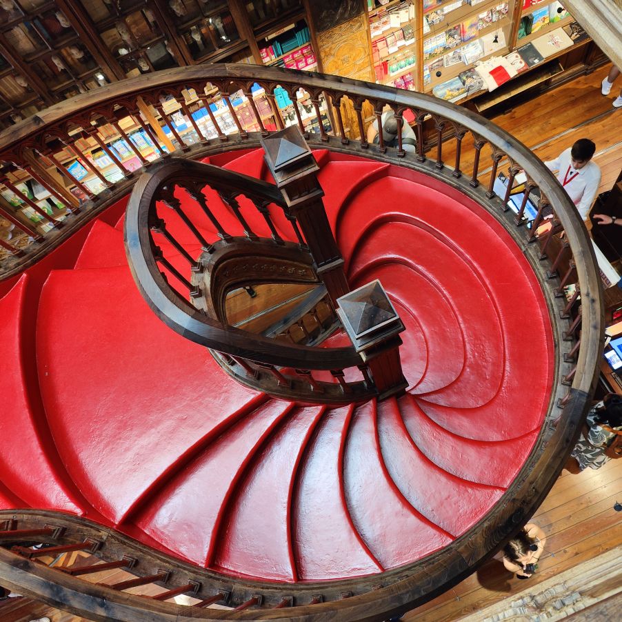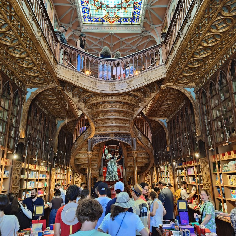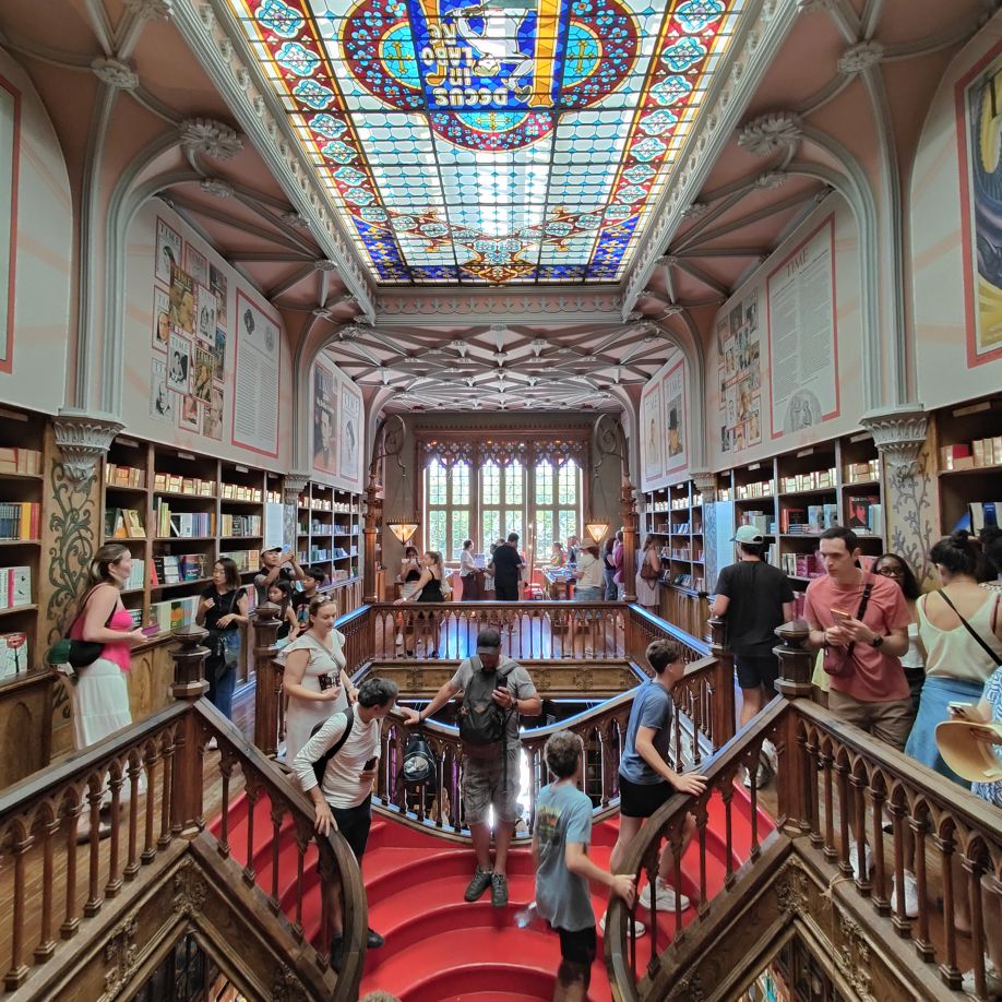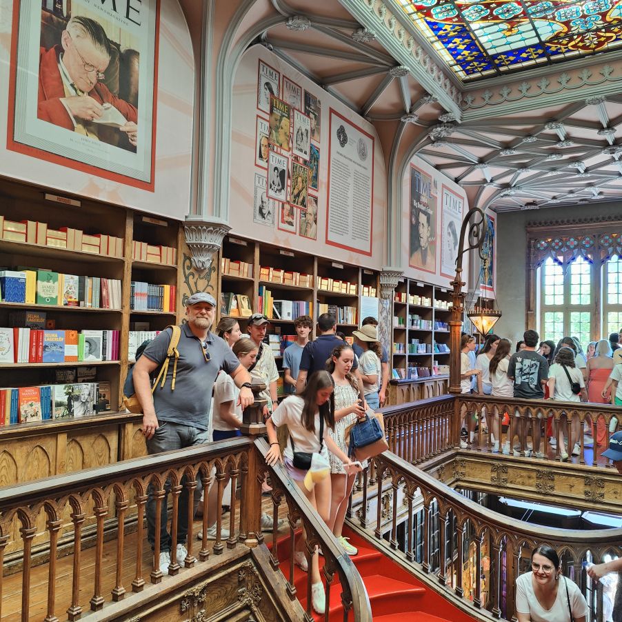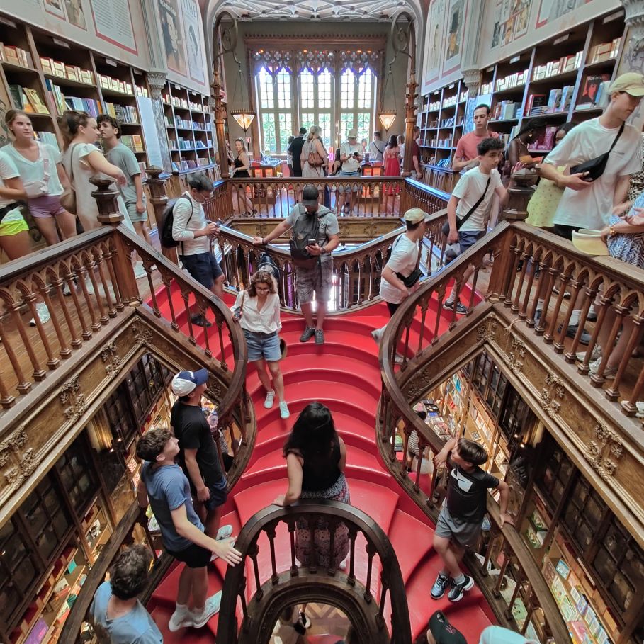 Dann gehen wir zur nahegelegenen Livraria Lello – wir haben uns Tickets für einen bevorzugten Eintritt im Vorfeld gekauft, da die angeblich schönste Buchhandlung der Welt sehr beliebt sein soll. Die Livraria Lello soll Einfluss auf die Harry-Potter-Romane gehabt haben, denn die Autorin Joanne K. Rowling, lebte Anfang der 1990-er Jahre einige Zeit in Porto. Das Gebäude selbst wurde im Jugendstil errichtet. Im Inneren finden wir Büsten von bedeutenden portugiesischen Schriftstellern, klassische portugiesische sowie politische Literatur. Das Kernelement ist die hölzerne Treppe, die ins Obergeschoß führt. Mit unseren Gold-Tickets können wir an der Warteschlange vorbei und ersparen uns mindestens eine halbe Stunde Zeit. Drinnen ist es sehr voll und heiß, sehenswert ist die Buchhandlung allemal.