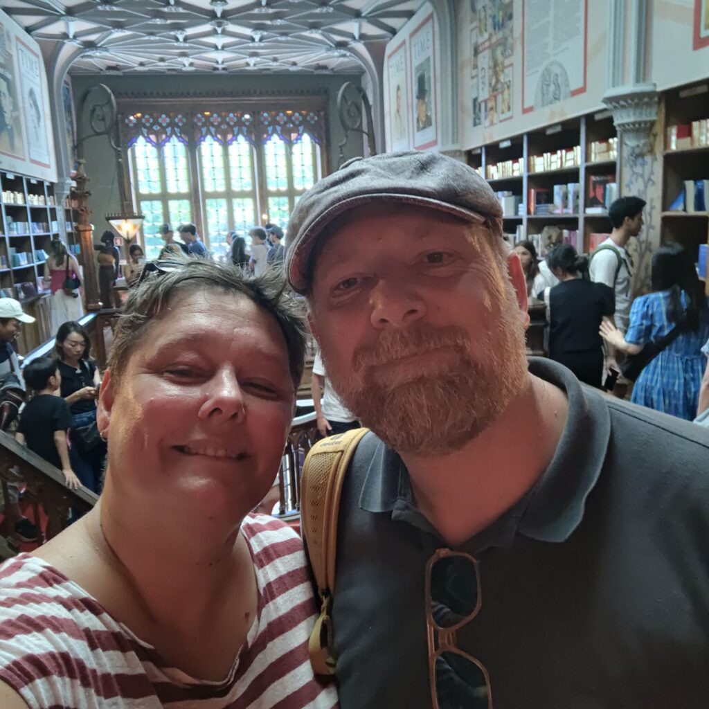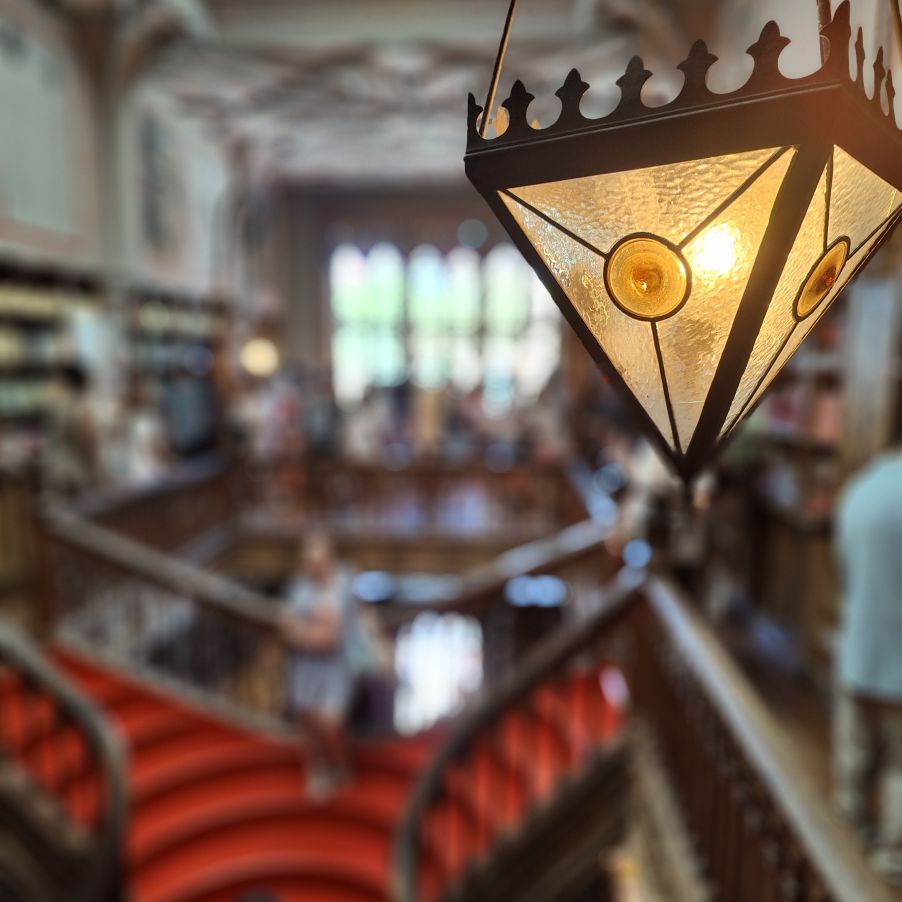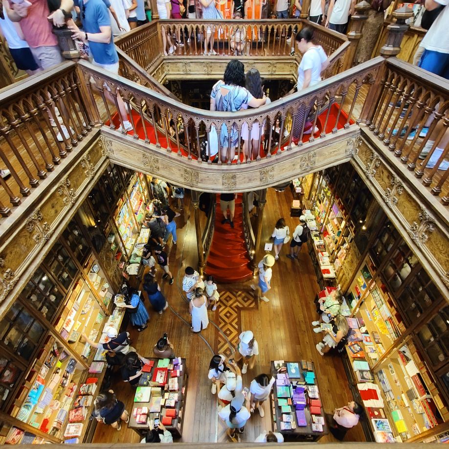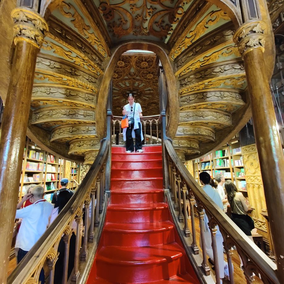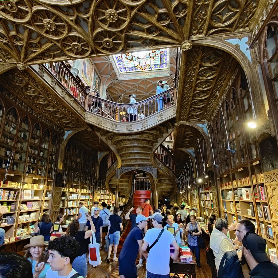 Dann gehen wir zur nahegelegenen Livraria Lello – wir haben uns Tickets für einen bevorzugten Eintritt im Vorfeld gekauft, da die angeblich schönste Buchhandlung der Welt sehr beliebt sein soll. Die Livraria Lello soll Einfluss auf die Harry-Potter-Romane gehabt haben, denn die Autorin Joanne K. Rowling, lebte Anfang der 1990-er Jahre einige Zeit in Porto. Das Gebäude selbst wurde im Jugendstil errichtet. Im Inneren finden wir Büsten von bedeutenden portugiesischen Schriftstellern, klassische portugiesische sowie politische Literatur. Das Kernelement ist die hölzerne Treppe, die ins Obergeschoß führt. Mit unseren Gold-Tickets können wir an der Warteschlange vorbei und ersparen uns mindestens eine halbe Stunde Zeit. Drinnen ist es sehr voll und heiß, sehenswert ist die Buchhandlung allemal.