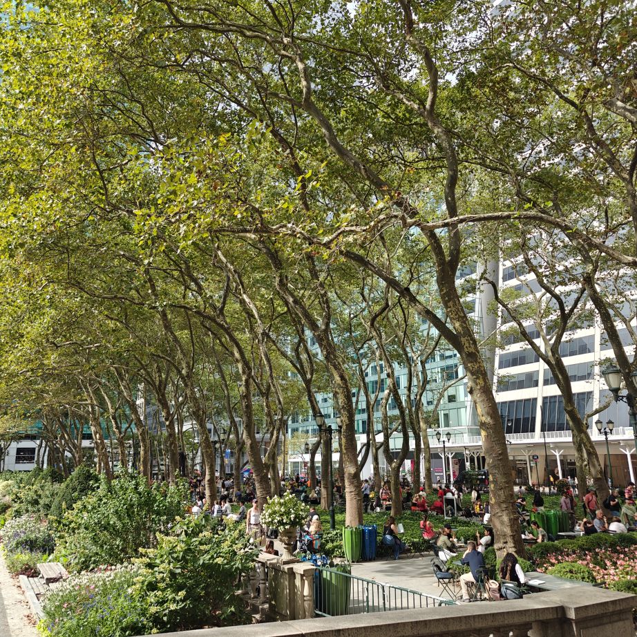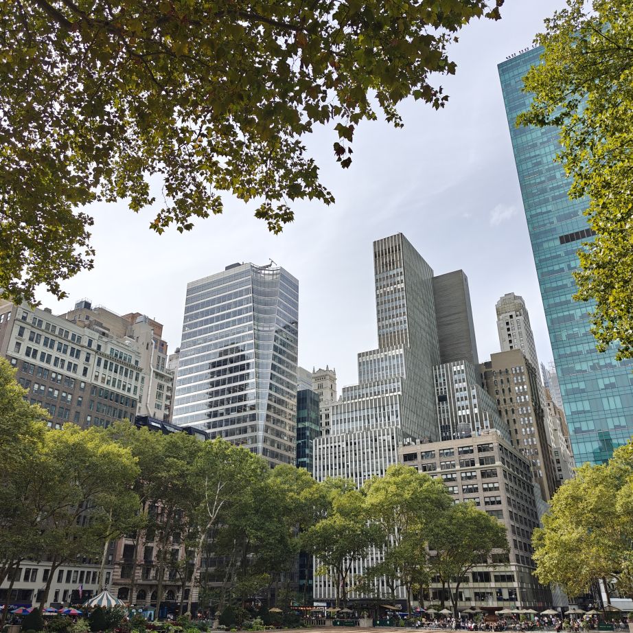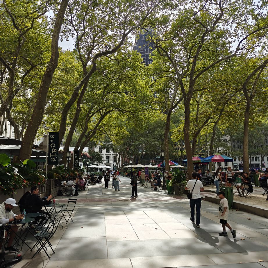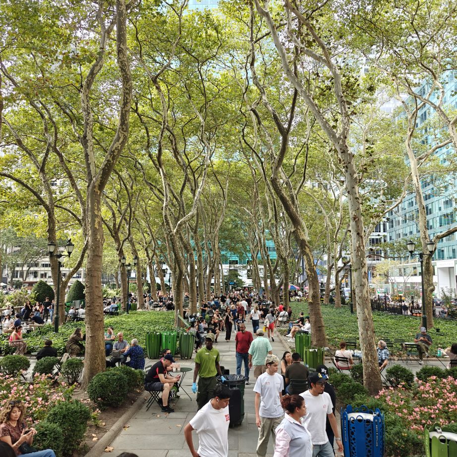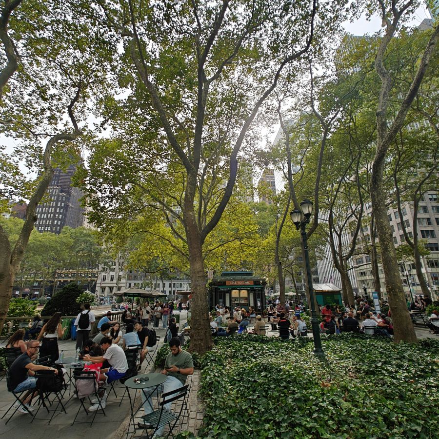 Wir gehen über die New York Public Library und den Bryant Park NYC zurück ins Hotel und machen uns frisch für den Abend. Der 39.000 Quadratmeter große Bryant Park ist von Hochhäusern eingerahmt. Im Winter gibt es dort einen Weihnachtsmarkt und man kann eislaufen, im Sommer laden Kinonächte zum Verweilen. Überall stehen Tische zur freien Nutzung, was sehr gut angenommen wird. Wir trinken ein IPA im Bar-Café im Park, dann gehen wir über den Times Square zurück ins Hotel.