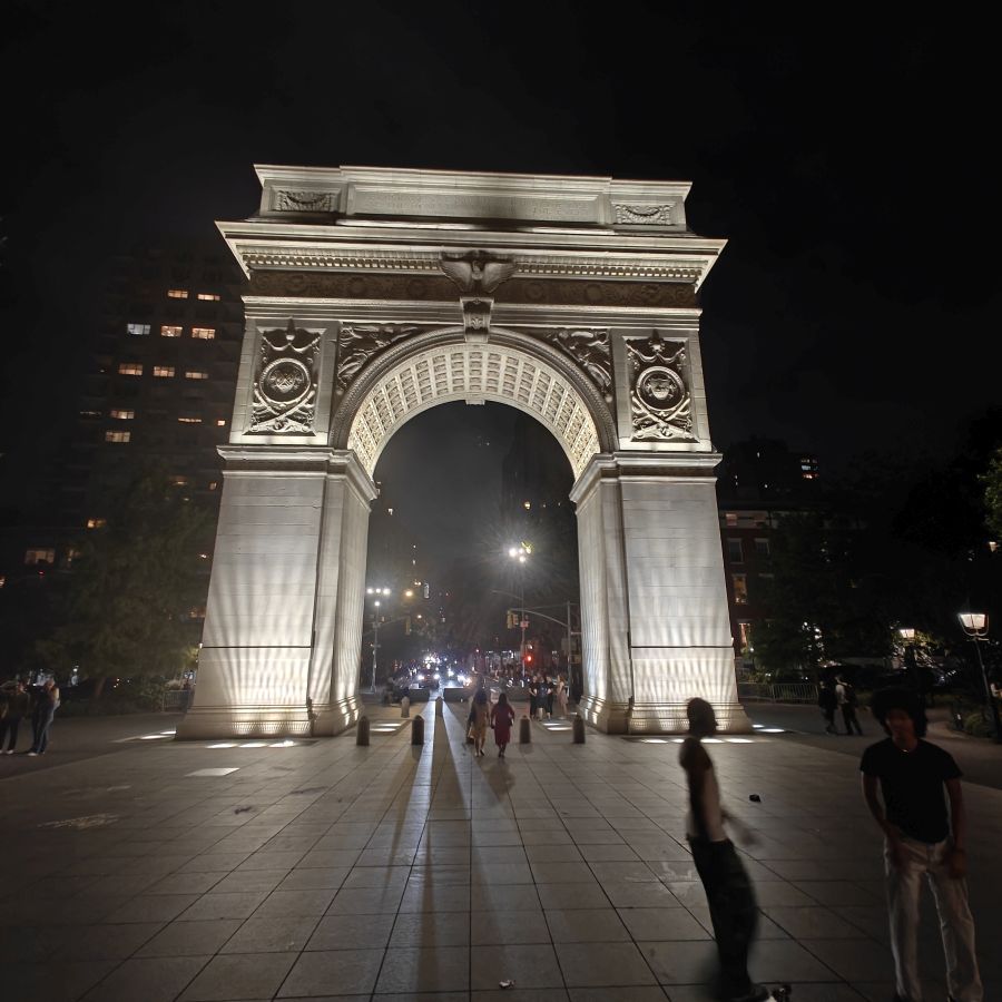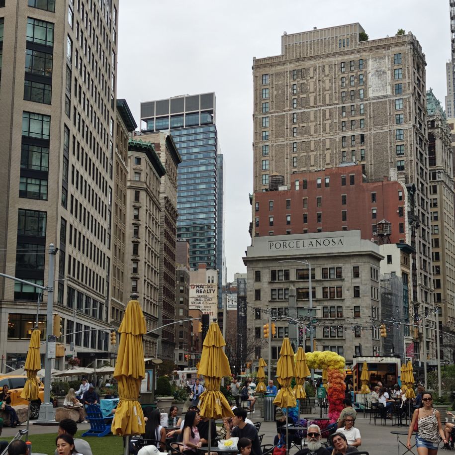 Nach einer kurzen Rast nehmen wir den Big Bus ab M&Ms World und fahren zum 2,5 ha großen Madison Square Park. Wie der Bryant Park zuvor ist auch dieser Park von Hochhäusern umringt. Das Flatiron Building, der Met Life Tower und das New York Life Building sind prägende Gebäude am Madison Square. Das „Bügeleisengebäude“ ist leider eingerüstet. Es zählt mit seiner markanten Keilform zu den Wahrzeichen der Stadt und wurde 1979 in das National Register of Historic Places eingetragen. Die Schmalseite an der Straßenkreuzung des über 100 Jahre alten Stahlskelettgebäudes ist lediglich zwei Meter breit.