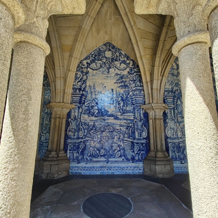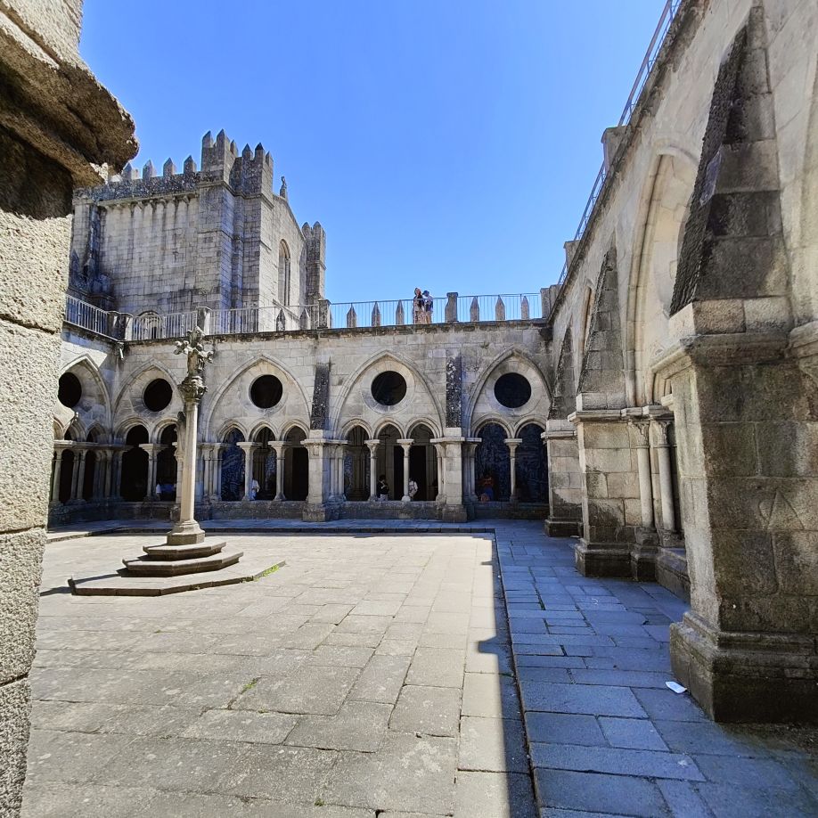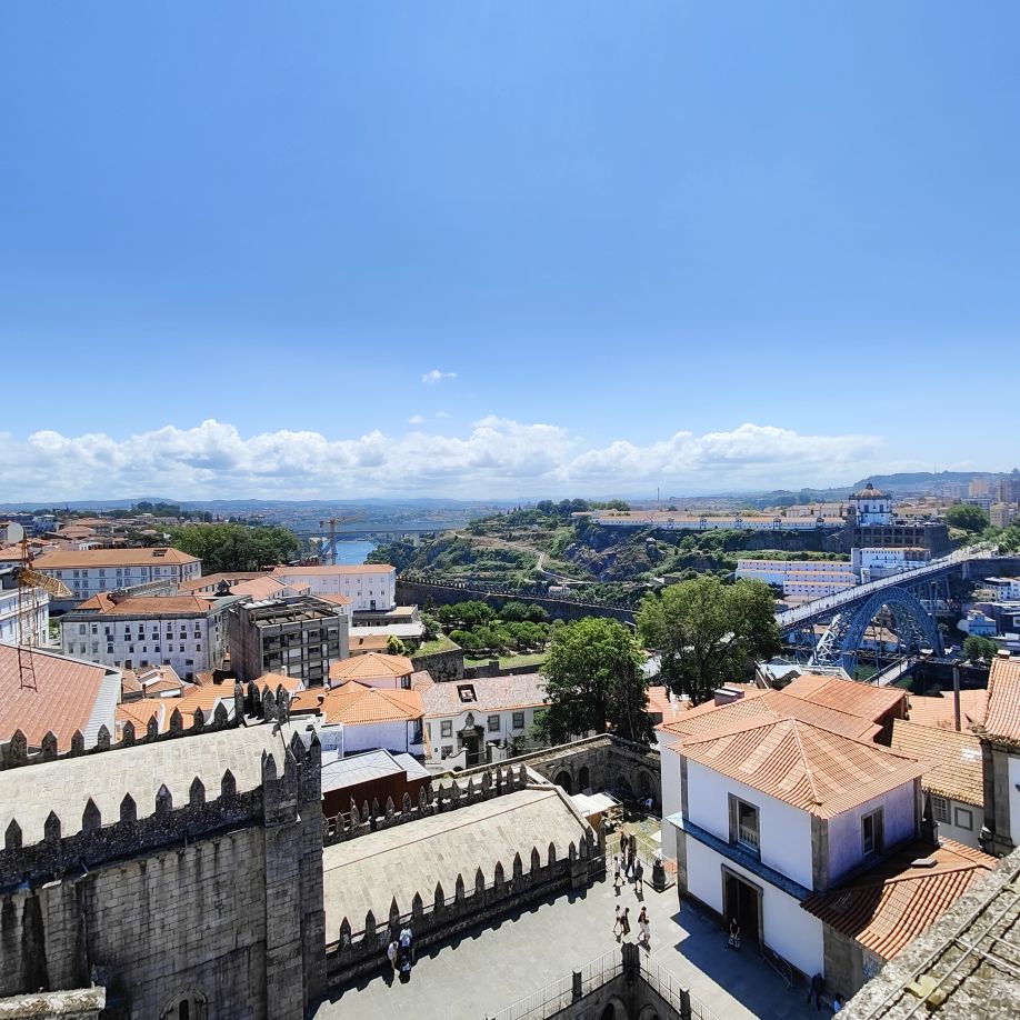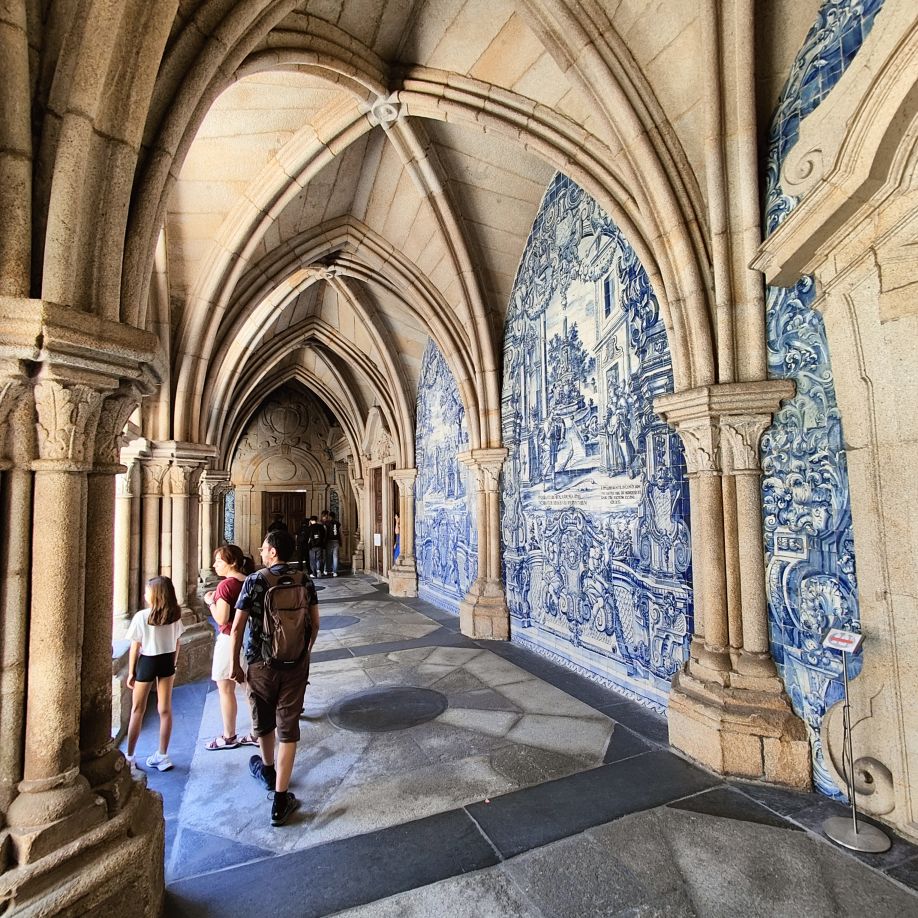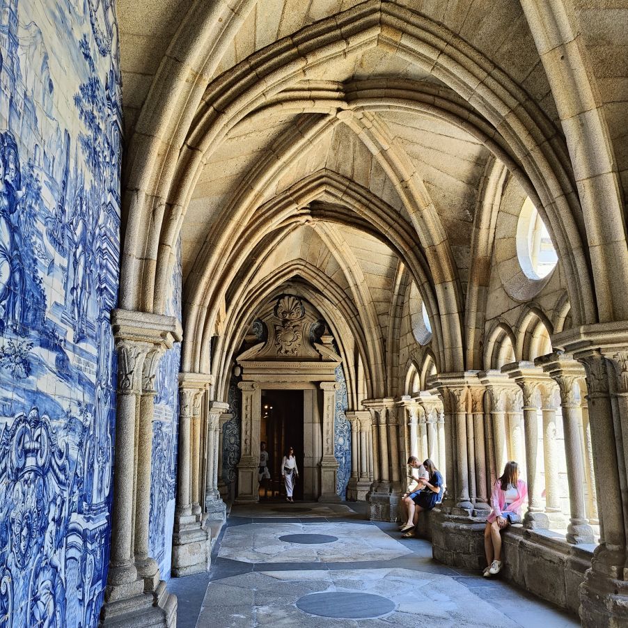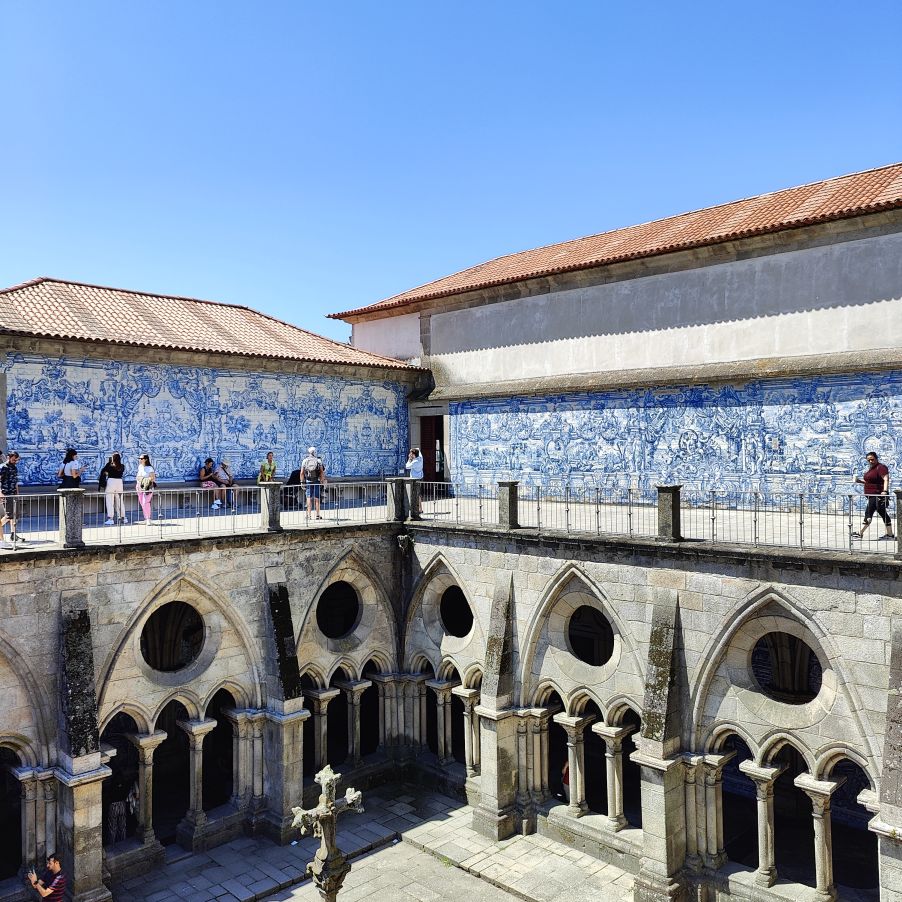Wir machen uns auf zum nächsten Monumentalgebäude Portos – vorher steigen wir aber die Stufen zum Miradouro da Vitória hinauf und werden mit einer tollen Aussicht belohnt. Unser nächstes Ziel ist die Kathedrale Sé do Porto, die Hauptkirche der Stadt und die Bischofskirche des Bistums Porto. Sie liegt auf einem Hügel in der Altstadt, die seit 1996 als Weltkulturerbe der UNESCO eingetragen ist. Der Bau wurde Anfang des 12. Jahrhunderts im romanischen Stil begonnen. Der gotische Kreuzgang wurde im 14. Jahrhundert errichtet. Das Äußere der Kathedrale wurde zur Zeit des Barocks und des Rokoko tiefgreifend umgestaltet. In dieser Zeit wurde auch der Kreuzgang mit Azulejos dekoriert. Mit unseren Tickets können wir die Warteschlange überholen und ebendiesen besichtigen sowie den Turm besteigen.