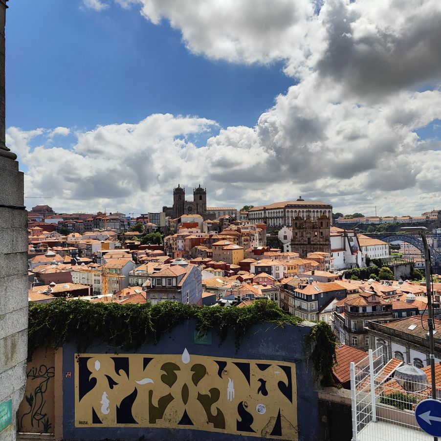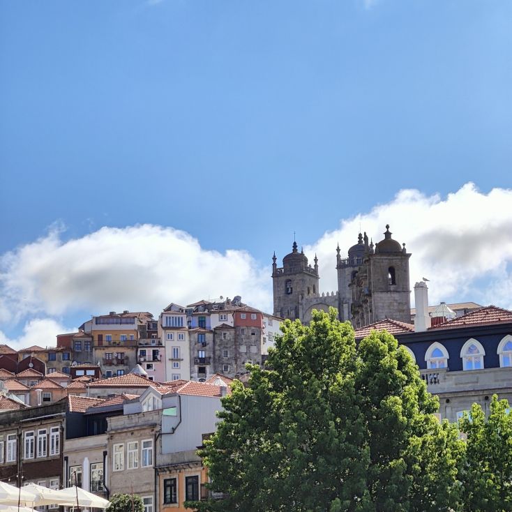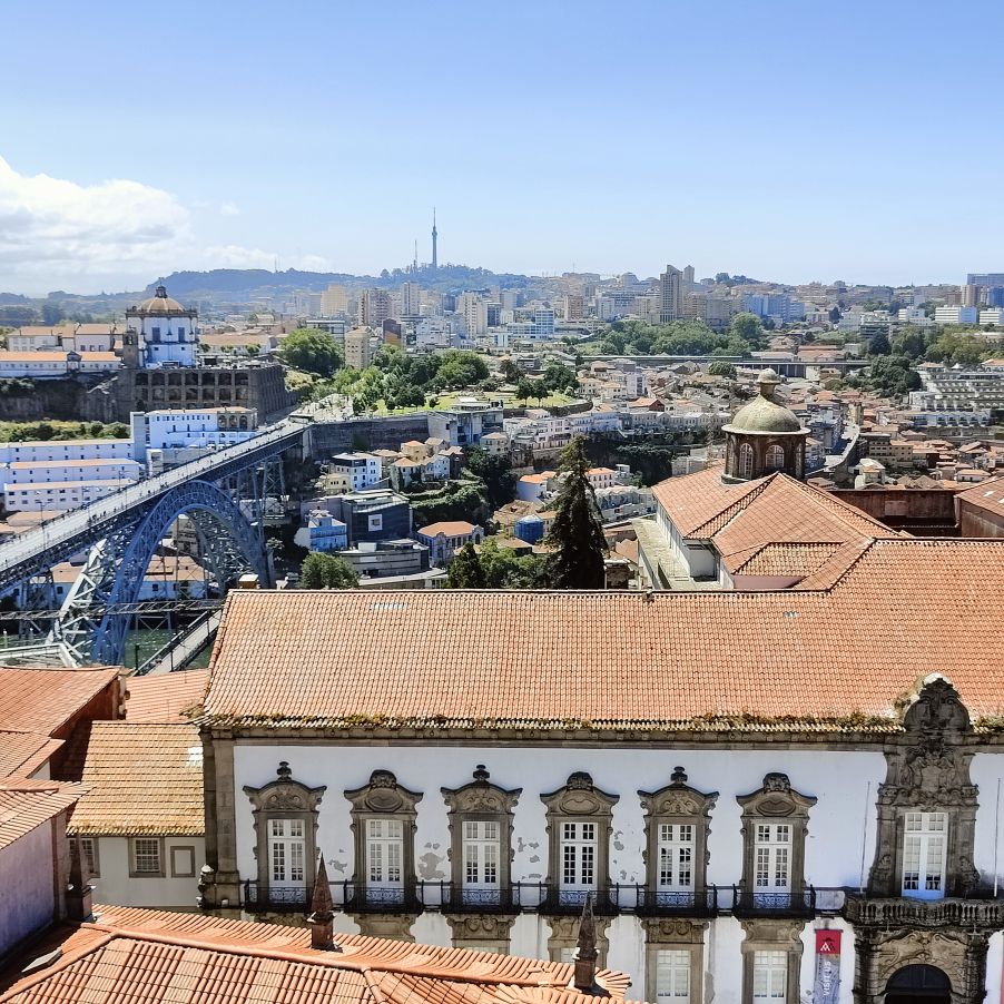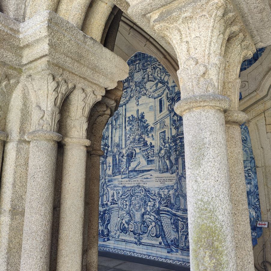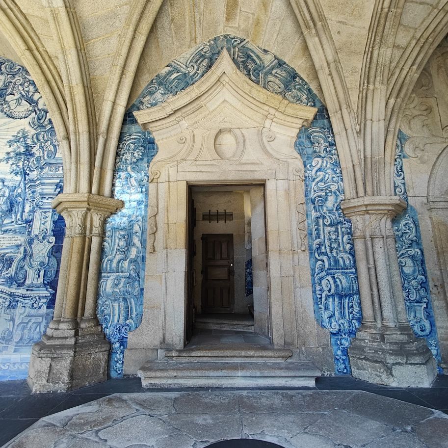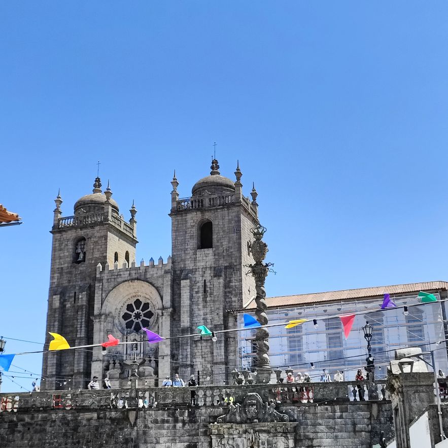Wir machen uns auf zum nächsten Monumentalgebäude Portos – vorher steigen wir aber die Stufen zum Miradouro da Vitória hinauf und werden mit einer tollen Aussicht belohnt. Unser nächstes Ziel ist die Kathedrale Sé do Porto, die Hauptkirche der Stadt und die Bischofskirche des Bistums Porto. Sie liegt auf einem Hügel in der Altstadt, die seit 1996 als Weltkulturerbe der UNESCO eingetragen ist. Der Bau wurde Anfang des 12. Jahrhunderts im romanischen Stil begonnen. Der gotische Kreuzgang wurde im 14. Jahrhundert errichtet. Das Äußere der Kathedrale wurde zur Zeit des Barocks und des Rokoko tiefgreifend umgestaltet. In dieser Zeit wurde auch der Kreuzgang mit Azulejos dekoriert. Mit unseren Tickets können wir die Warteschlange überholen und ebendiesen besichtigen sowie den Turm besteigen.