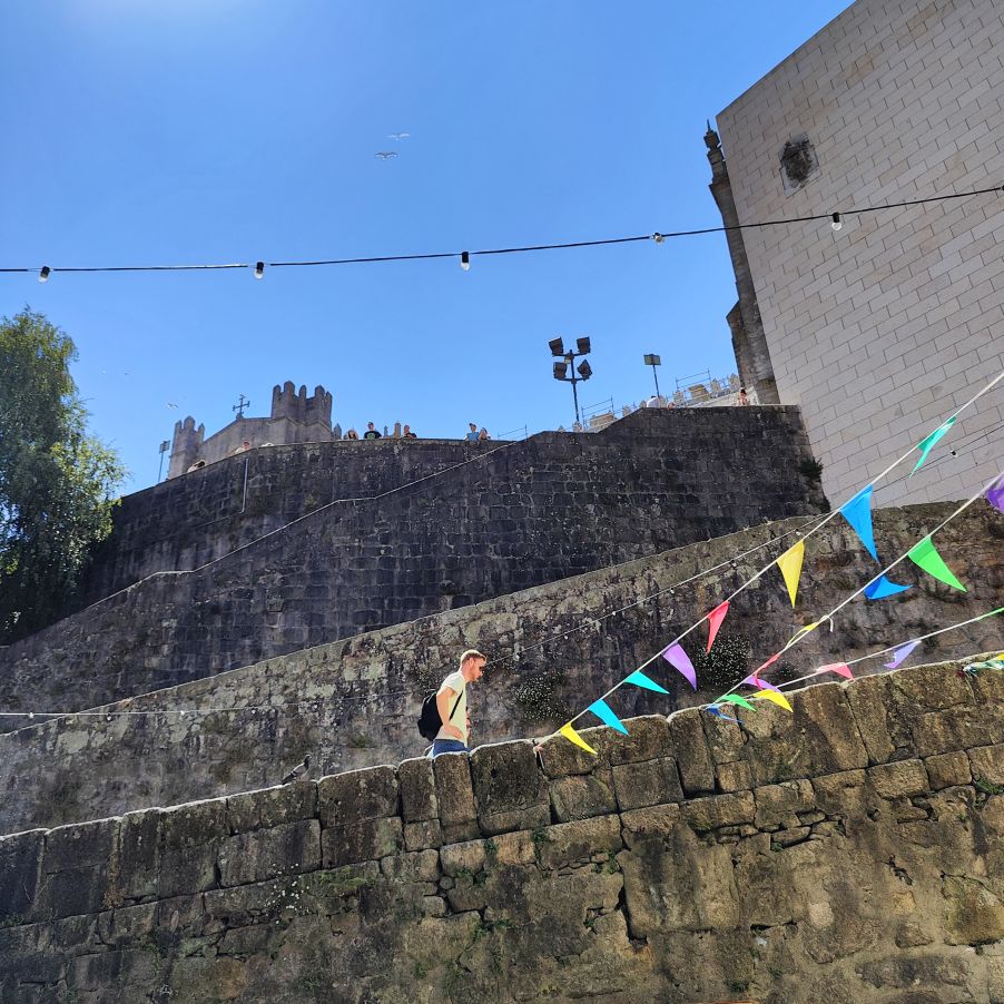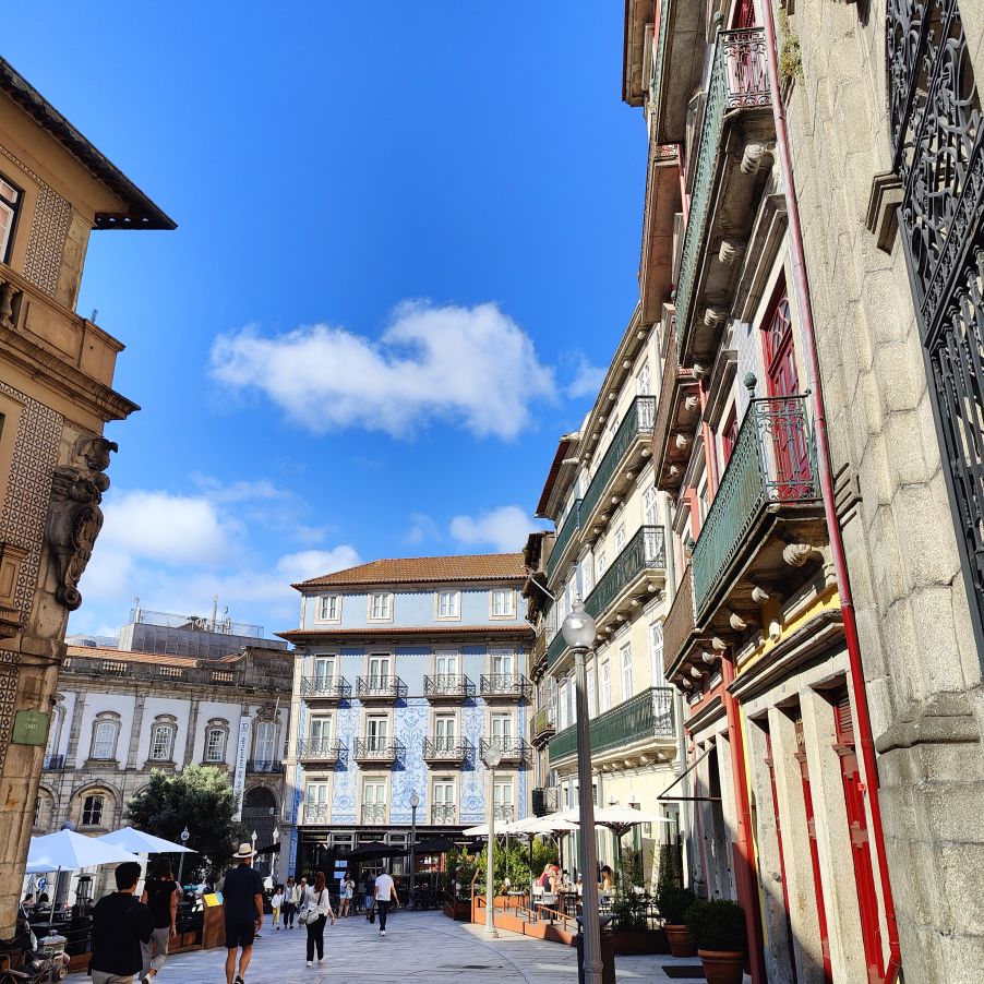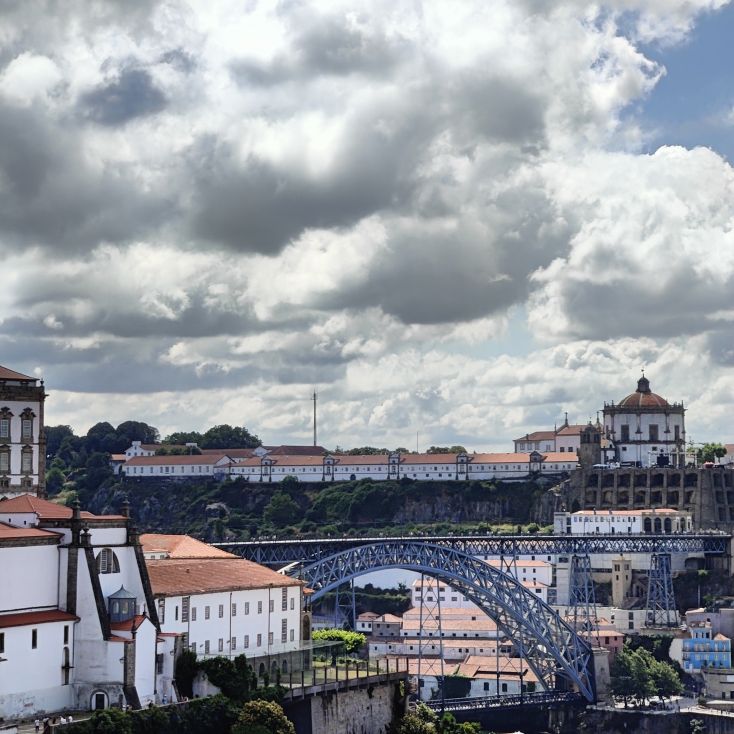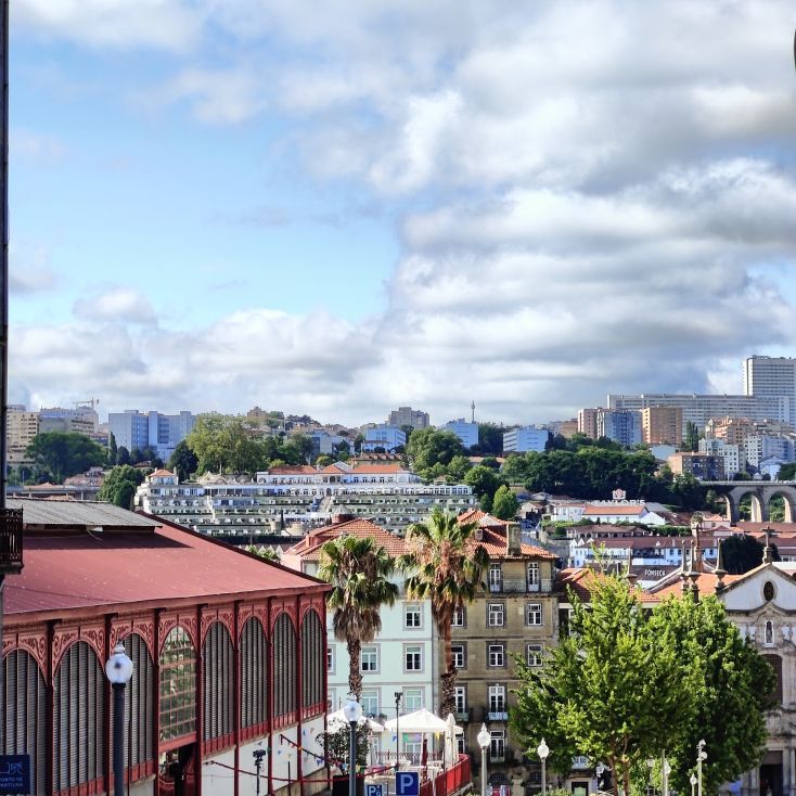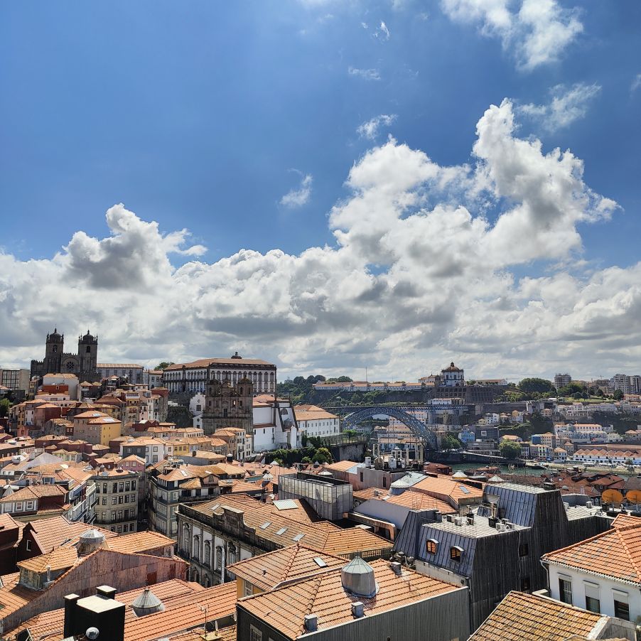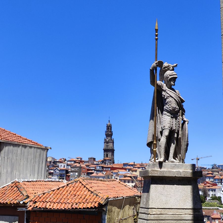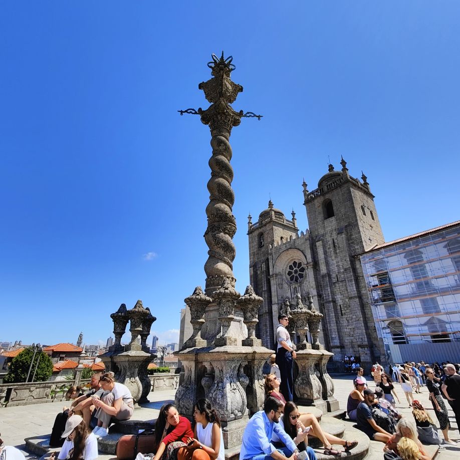 Wir machen uns auf zum nächsten Monumentalgebäude Portos – vorher steigen wir aber die Stufen zum Miradouro da Vitória hinauf und werden mit einer tollen Aussicht belohnt. Unser nächstes Ziel ist die Kathedrale Sé do Porto, die Hauptkirche der Stadt und die Bischofskirche des Bistums Porto. Sie liegt auf einem Hügel in der Altstadt, die seit 1996 als Weltkulturerbe der UNESCO eingetragen ist. Der Bau wurde Anfang des 12. Jahrhunderts im romanischen Stil begonnen. Der gotische Kreuzgang wurde im 14. Jahrhundert errichtet. Das Äußere der Kathedrale wurde zur Zeit des Barocks und des Rokoko tiefgreifend umgestaltet. In dieser Zeit wurde auch der Kreuzgang mit Azulejos dekoriert. Mit unseren Tickets können wir die Warteschlange überholen und ebendiesen besichtigen sowie den Turm besteigen.