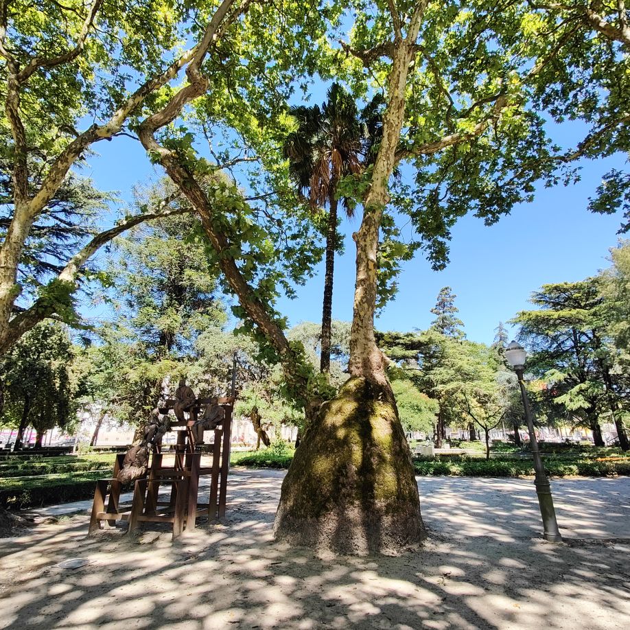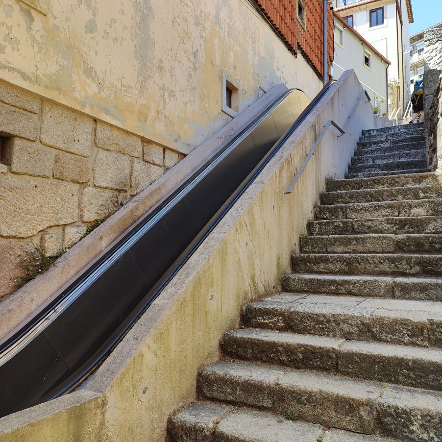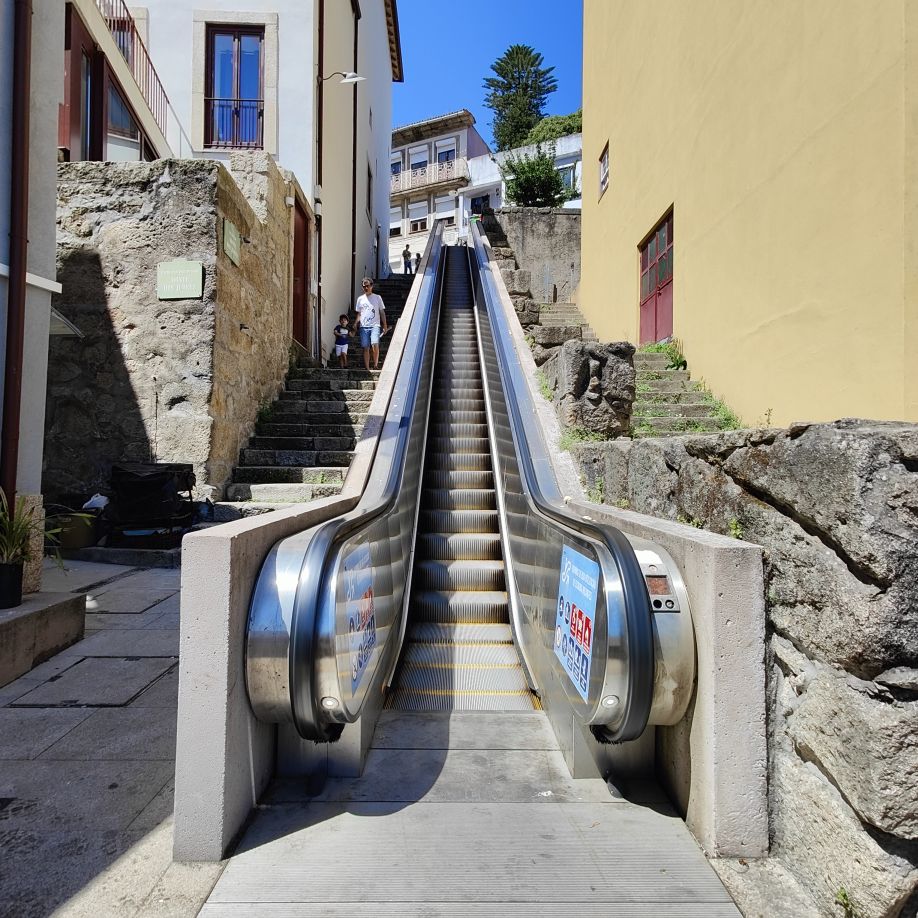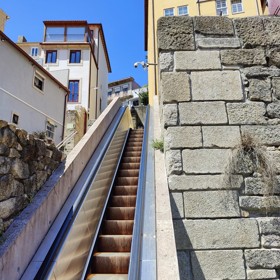 Dann spazieren wir weiter zu den Escadas do Monte dos Judeus – einer Freiluft-Rolltreppe, die dabei hilft, Höhenmeter ohne Anstrengung zu überwinden. Eigentlich keine Sehenswürdigkeit, aber mit seinen Sichtbeton-Begrenzungswänden städteplanerisch und architektonisch interessant. Um die notwendige Technik unterzubringen, musste ein Teilbereich der vorhandenen Treppe abgetragen werden.